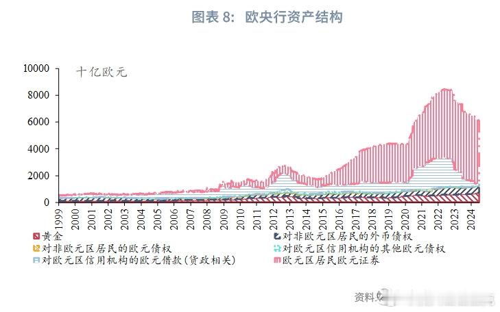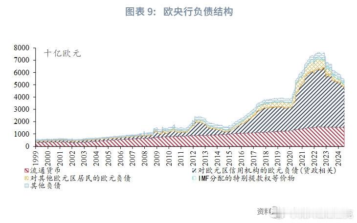 欧央行资产负债表2008年金融危机之前,欧央行资产负债表缓慢扩张,占欧元区GDP比重低于60%;2008年金融危机蔓延,并诱发欧债危机,欧央行资产规模震荡上行,资产规模占GDP比重于2011年末突破100%。2015年年初欧央行开启QE,扩表速度明显加快,但总资产相对GDP比例未及200%;2020年为应对疫情影响,欧央行进一步加大资产购买力度,总资产占比于2022年6月突破300%。截至今年第一季度,欧央行总资产约占欧元区GDP的243%。3.1 资产端———第一,欧央行资产中占比最大的科目是欧元区居民欧元债券。欧债危机影响下,部分欧元区成员主权债务出现偿付压力,为恢复市场信心、降低重债经济体的借贷成本,2010年5月欧央行开启证券市场计划(SMP),在二级市场买入成员经济体主权债(主要是爱尔兰和希腊)。2015年欧央行推出资产购买计划(APP),买入公司债(CSPP)、政府债(PSPP)、资产支持证券(ABSPP)和担保债券(CBPP);其中额度最高的是PSPP购买的成员经济体主权债,占到APP累计规模的近80%。2020年疫情暴发,欧央行开启紧急抗疫购债计划(PEPP),进一步扩大资产购买规模。经过多轮扩张,欧央行持有的欧元区居民欧元证券占其总资产的比重持续提升,截至今年7月,占比约为72%。———第二,和货币政策操作相关的对欧元区信用机构的欧元借款,其中包括主要再融资操作(MROs)、长期再融资操作(LTROs)、边际贷款便利(MLF)、微调反向操作、结构反向操作等。其本质是央行贷款,要求抵押物的前提下向金融机构释放流动性。从实际操作来看,该科目具有快进快出特点,欧央行往往在流动性危机时加大贷款投放力度,保证市场获得充足流动性:2012-2013年欧债危机期间,该科目在总资产中占比高达30%-40%;2020年下半年至2022年上半年,占比亦维持在25%-30%。伴随着疫情影响消退,截至6月,央行贷款占总资产的比重快速降至不足2%。———第三,与美日相比,欧央行资产中黄金占比相对较高。截至今年7月,美联储和日央行持有黄金占总资产的比重不足1%,而欧央行黄金占比高达12%。3.2 负债端———第一,欧央行最大的负债科目是“和货币政策操作相关的对欧元区信用机构的欧元负债”,主要是商业银行的存款准备金。经过2012年欧债危机、2015年QE以及2020年疫情,多轮货币政策宽松释放的流动性推升存款准备金余额和占比。截至今年7月,该科目约占欧央行总负债的50%。———第二,流通中的货币余额缓慢抬升,占资产比重震荡回落,截至今年7月已降至总负债的24%。———第三,对其他欧元区居民的欧元负债,包括政府存款和其他负债两部分。其中,其他负债主要包括欧洲金融稳定基金(EFSF)和欧洲稳定机制(ESM)存款。截至今年7月,该科目约占负债的3%左右