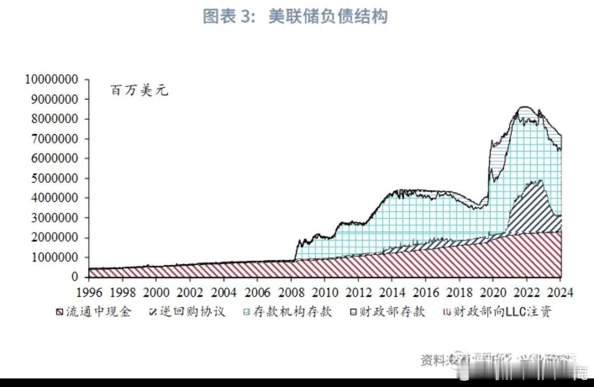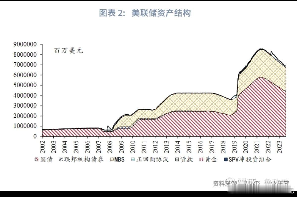 央行资产负债表与货币政策是一枚硬币的两面。观察央行资产负债表的结构变迁,可以更好理解其背后的货币政策目标。美联储方面,经过两轮扩表,资产端美国国债占比约为60%,机构MBS占30%以上,央行贷款成为应对流动性危机的灵活性工具,SPV净投资组合占资产比重不足1%。一、美联储资产负债表21世纪以来,美联储共经历了两次大规模扩表。2008年之前,美联储总资产占GDP的比重较为稳定,约为5%左右;2008年之后经过三轮量化宽松(QE),总资产占GDP比重一度提升至24%;2020年为应对疫情影响,美联储开启无限制量化宽松,表内资产占GDP比重快速提升,2022年峰值突破41%。截至今年第一季度,美联储总资产约占GDP的30%左右。1.1 资产端———第一,美联储资产中占比最高的科目是持有证券,其中美国国债约占总资产的60%,MBS占比超过30%,合计占总资产的90%以上。2008年QE以前,美联储持有证券以国债为主,占比高达86%,主要是通过公开市场操作在二级市场买入国债(Outright/Temporary Purchase),以此投放基础货币并调节银行间市场准备金余缺(Edwards C.,1997)。2008年开启QE之后,为稳定房地产和金融市场,美联储开始买入两房担保的住房抵押贷款支持证券(Agency MBS),MBS占总资产比重快速上升,一度跃升至40%,之后伴随着缩表进程回落至30%附近;QE之后国债占比较此前有所回落,稳定在60%左右。———第二,贷款(Loans)的本质是央行接受一定的抵押品以向金融机构提供信贷资金。其中,一级信贷(Primary Credit)是美联储以联邦基金利率上沿(IORB)向财务状况良好的银行开设的无资金用途限制的贴现窗口,用以确保银行有充足的流动性;二级信贷(Secondary Credit)是向没有资格获得一级信贷的银行开设的贴现窗口。此外,贷款科目还包括一些结构性工具:比如薪资保障计划流动性工具(PPPLF),小企业管理局通过薪资保护计划(PPP)向小企业提供贷款用以发薪,美联储向发放PPP贷款的合格金融机构提供资金支持;再比如,银行定期融资计划(BTFP)允许银行将抵押品按面值计价,可将手中浮亏的债券按面值向央行贷款,避免了债券市值下跌导致的信贷收紧以及流动性危机下银行对债券的抛售踩踏。从近年的操作看,贷款已成为美联储应对流动性危机的灵活工具:2020年3月为应对疫情影响推出了包括PPPLF在内的一系列工具,贷款科目在美联储总资产中占比在两周之内从0%提升至2.2%;2023年3月为应对硅谷银行危机启动BTFP,贷款工具占比一周之内提升近3.5个百分点。———第三,作为新创设的工具,SPV的净投资组合在总资产中占比相对较低,峰值约占1%左右。央行通过特殊目的实体(SPV)代为购买特定资产以释放流动性,并增强流动性的传导。其中包括主街贷款计划(MS Facilities LLC)、市政流动性工具(Municipal Liquidity Facility LLC)和定期资产支持证券贷款工具(TALF II LLC)等。SPV工具与贷款的不同在于,首先由财政部向SPV注入资本金(体现在联储负债端),再由美联储向SPV提供贷款,由SPV负责购买资产,且SPV持有的投资组合和美联储并表(体现在联储资产端)。————第四,正回购协议即央行在一定期限内接受交易商的抵押品并提供流动性,更加偏重于应急。2008年之前使用较多,次贷危机期间占比一度超过14%;之后使用减少,在资产中占比已接近0%。1.2 负债端———第一,流通中的货币(Notes),2008年之前是最主要的负债形式,在美联储负债中占比一度高达90%以上;2008年之后,余额稳健增长,但占比整体回落,截至今年7月初约占总负债的32%左右。———第二,存款机构的存款(Deposits),主要是商业银行的存款准备金,2008年开启QE之后,商业银行存款准备金大幅增长,占总负债的比例一度超过60%。截至7月初,准备金占负债比重约为47%。———第三,逆回购协议是美联储回笼流动性的窗口。在隔夜逆回购操作(ON RRP)中,美联储出售其持有的有价证券,同时约定次日购回,并向交易对手支付利息,以此来吸收市场中过剩的流动性,其操作利率构成美联储利率走廊的下沿。2022年下半年至2023年上半年,逆回购协议占总负债的比例接近30%;截至7月初,该比例已降至11%左右。———第四,财政部存款(TGA)是财政部的专属账户,截至7月约占总负债的10%。———第五,财政部对信贷便利工具的注资,指财政部向SPV投入的资本金,峰值时约占总负债的1.7%,截至7月初占比不足0.1%。