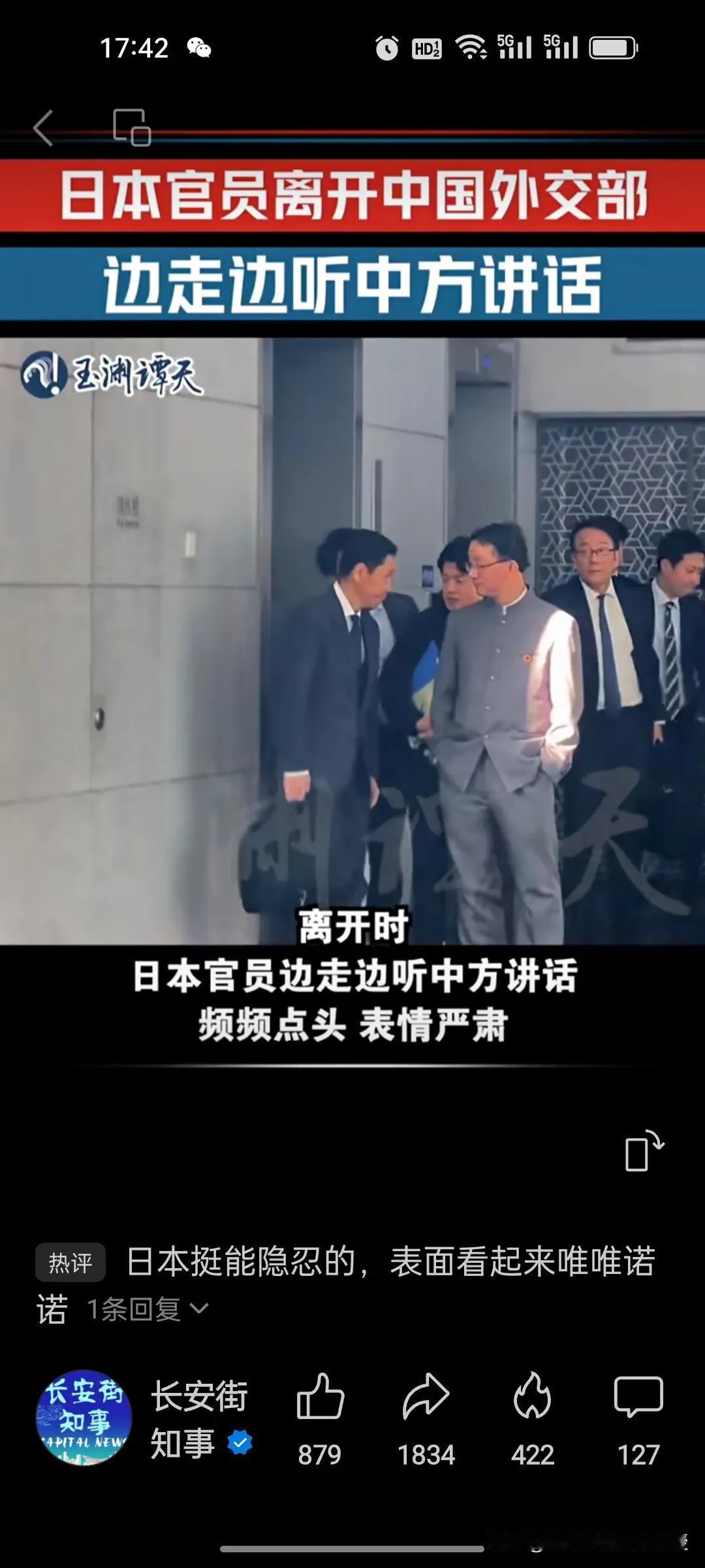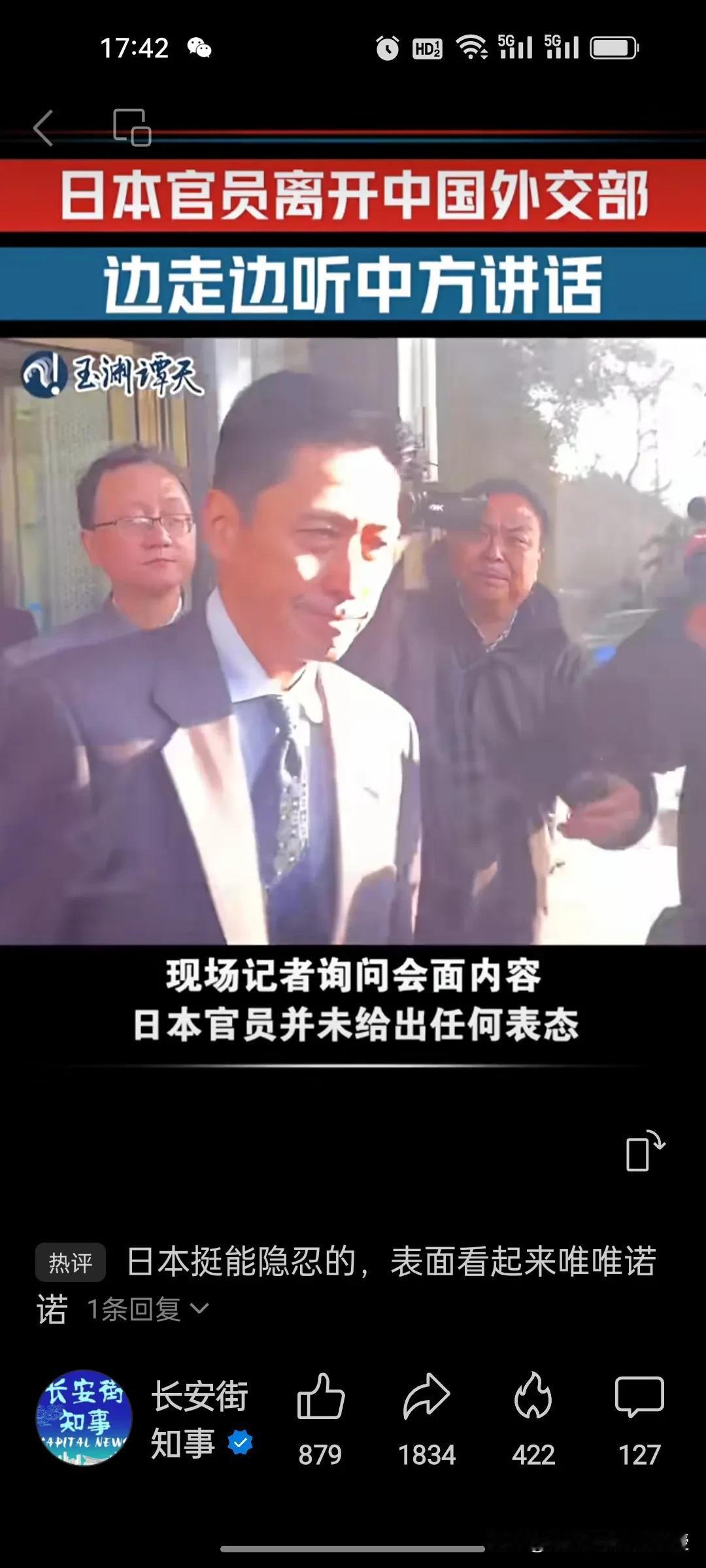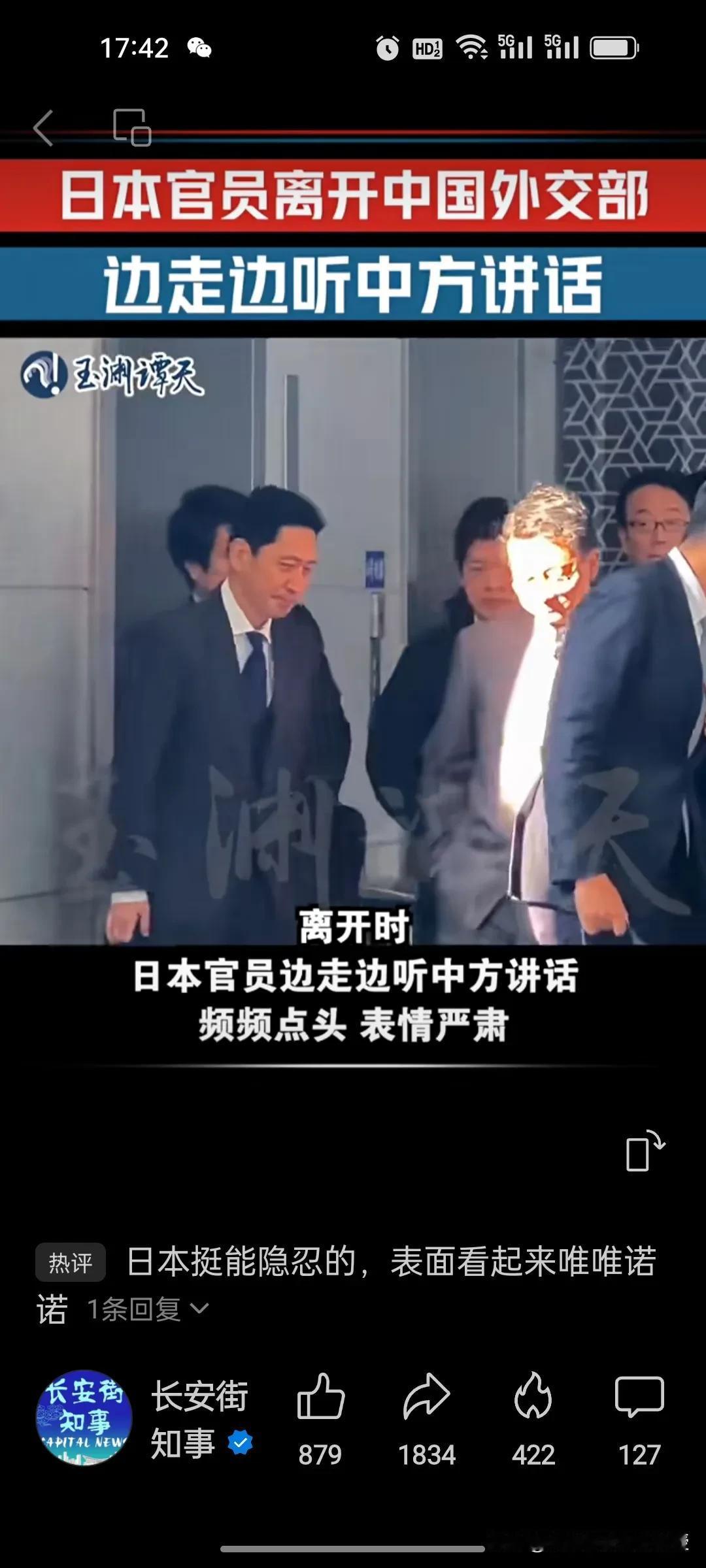 看下图,来自玉渊谭天的视频,日本外务省高官金井正彰在外交部谈完后下电梯准备离开,中方人员跟他说话,他频频点头,表情严肃,有点唯唯诺诺的样子,像被训斥过的小学生一样。他头部前倾,肩膀略弯,毕恭毕敬地对待中方人员。毕竟是自己国家首相犯错在先,自己是来背锅的,这大概就是他们的职业操守。他没有接受任何媒体的采访,一脸严肃地直接上车离开,跟来的时候表情一模一样,想必他心里定是五味杂陈。