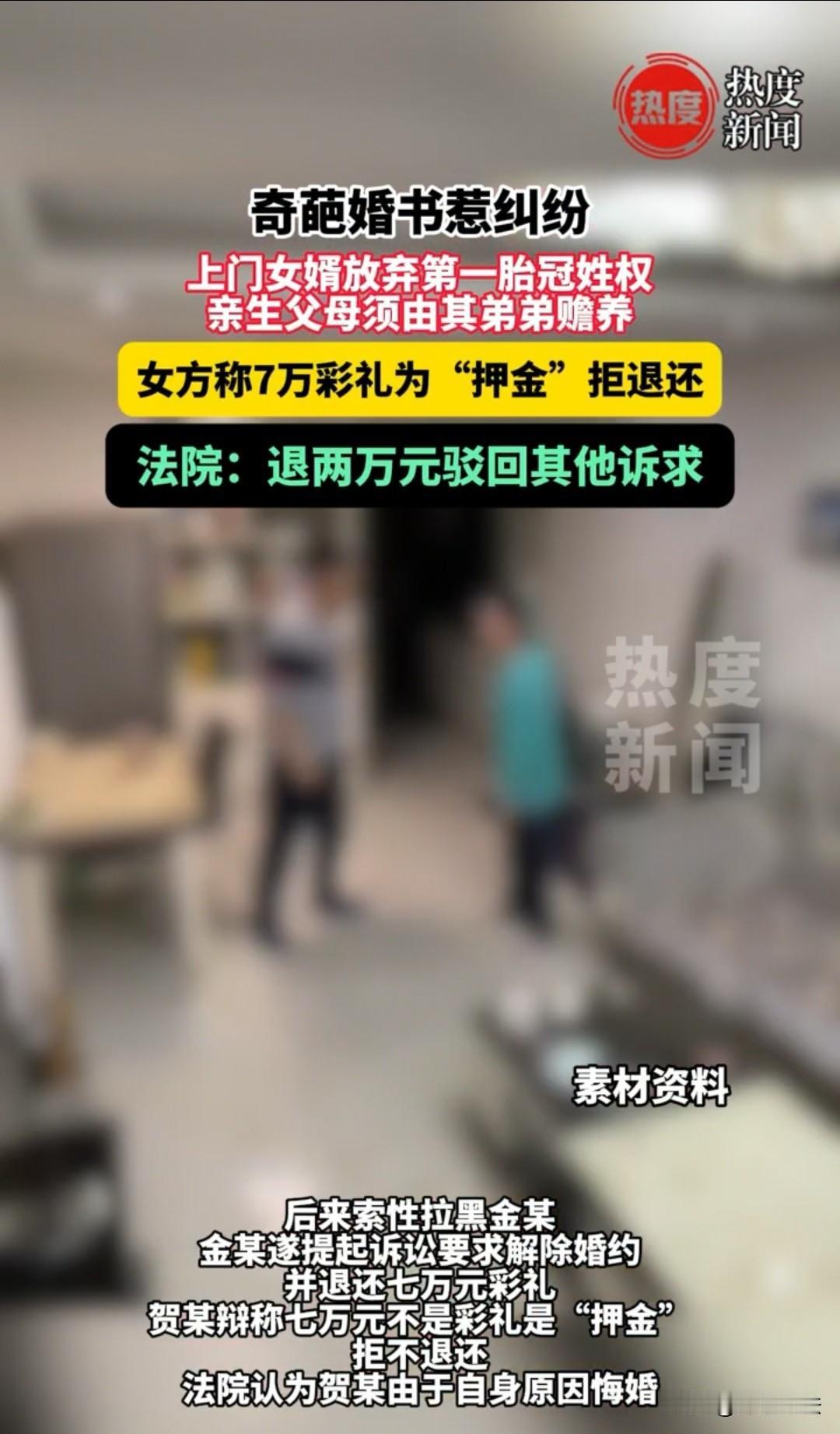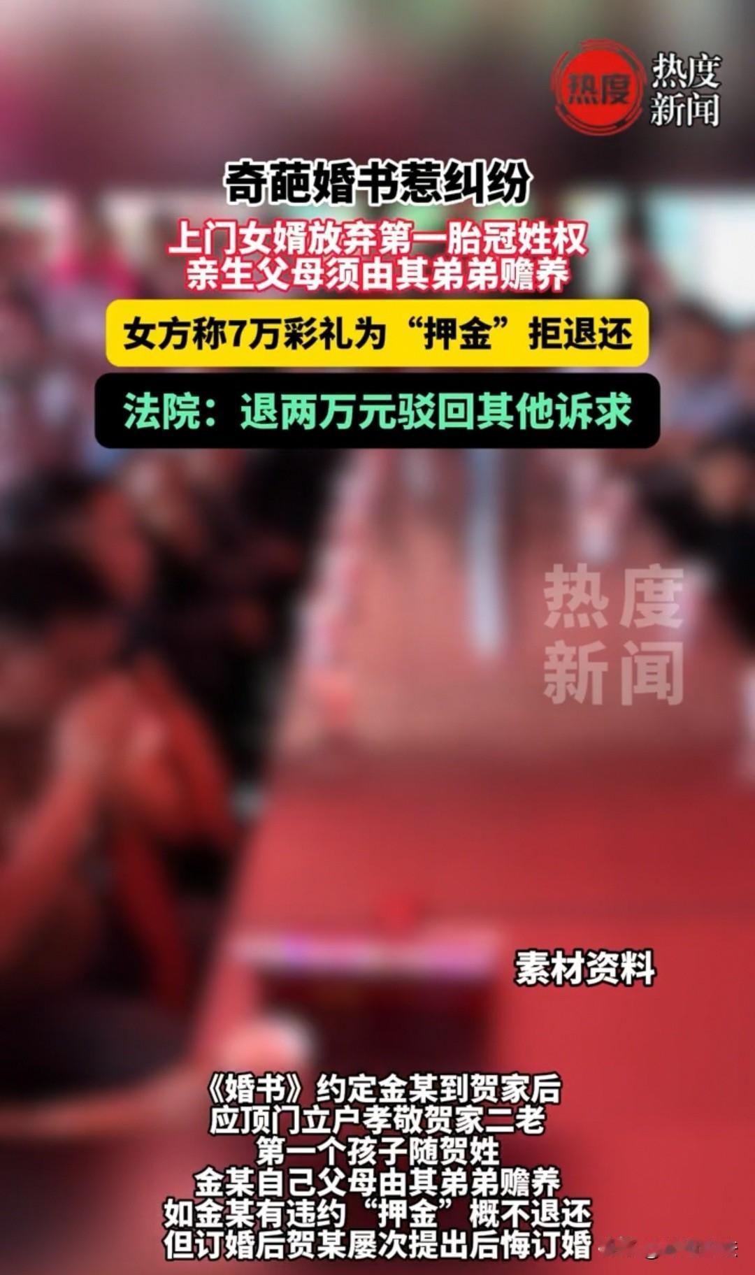 陕西,男子作为上门女婿,订婚时签订了婚书,先支付女方7万元“押金”,剩余8万元彩礼待结婚时再支付,双方还约定,男子放弃赡养自己的亲生父母,第一胎也不能随自己姓。后来女子多次表示后悔,两人的婚约最终取消,男子向对方讨要已支付的7万元彩礼费,但女方称那是“押金”,在当地习俗中不予退还。最后男子诉至法院,法院判决女方退还2万元。 金先生是1997年出生的,在2020年的时候就认识了比自己小六岁的贺女士,对方看起来漂亮又讨人喜欢,所以就用尽心思开始追求对方。 贺女士觉得这位大哥哥也不错,懂得体贴人,家里还有一个弟弟,这就满足了自己父母想招个上门女婿的条件。要是对方是独生子女,把人家招过来,其父母没人照看,那也不行。既然对方是两兄弟,金先生过来后,家中还有弟弟照看父母,那就没问题了。 不过到底金先生和他的父母愿不愿意呢?还得问一下人家,结果金先生自己拍板,没问题,就按照你说的算。我喜欢你这个人,不管是在自己家还是你家都可以。 这个回答很讨贺女士的喜欢,她随即告诉了自己的父母,说自己认识了金先生,对方长得不错,人品也好,还愿意做上门女婿,你们看看行不行? 父母了解后也觉得很满意,于是在2023年的时候,双方父母坐在一起,为两人订下了婚约。 不过,贺女士的家人生怕对方说的话不算数,于是要求在众人见证下签订婚书。这份婚书的内容就是:金先生必须放弃第一胎的冠姓权,也就是这第一胎必须跟着贺女士姓;第二个条件就是你来到我们家,只能赡养我们父母,可不能再去赡养你父母了,你的父母得由你弟弟赡养;第三个条件就是虽然你是上门女婿,但是你也得出彩礼钱,先支付7万元(婚书中写为“押金”),剩余8万元待结婚时再付,总计15万元彩礼。 双方家人都非常认可婚书上的内容,金先生的父母也看到贺女士家条件不错,这些提出的条件也不算过分,于是就拍手同意了。 后来过了一段时间,贺女士多次表示对这门婚约感到后悔,金先生与贺女士也因此频繁地发生矛盾,他们自己也不知道为什么,谈朋友的时候,那倒是卿卿我我的,怎么一谈到要结婚,矛盾就出来了呢? 两人和双方家庭都介入过,想要将两人撮合,好不容易获得的缘分,不能看着他们就这样散了。可是感情已经产生裂痕,没有办法修复,最后家人们也只能随他们的心意,做不了夫妻,那就做朋友吧,好聚好散。 可是金先生心中还是有心结,我已经支付了你7万彩礼(婚书中写为“押金”),那你得归还给我呀,我不可能啥都没得到吧? 贺女士也不愿意了,不是说好了做朋友吗?怎么还要向我要钱呢?你这7万可是押金,又不是彩礼,我们这里的押金可是不退的哟。 金先生可不答应,你好的时候,我是把你当成心上人看待,现在你多次后悔、不跟我在一起了,凭什么还要拿着我的钱呢?必须得要回来,于是就起诉了贺女士。 最后,法院判决不用全额归还,但是也不能一分都不还,让贺女士退还给金先生2万元,事情才得以解决。 不过,网友们觉得不太合理,这明明是彩礼嘛,又没有结婚,且婚约解除源于贺女士多次后悔,那为什么不全额退还呢? 1、金先生在谈婚论嫁阶段,于众人见证下签订婚书,按约定先支付7万元(婚书中写为“押金”),双方明确剩余8万元彩礼待结婚时再支付,该15万元整体为以缔结婚姻为目的的彩礼,而非女方所称的单纯“押金”。 《最高法关于审理涉彩礼纠纷案件适用法律若干问题的规定》第一条:以婚姻为目的依据习俗给付彩礼后,因要求返还产生的纠纷,适用本规定。 15万元符合陕西当地15-18万的彩礼习俗,7万元“押金”因指向婚姻缔结,应纳入彩礼范围;女方为婚约解除过错方,法院裁量返还时已侧重其过错,但需平衡当地习俗与彩礼实际支出,故未全额返还。 2、金先生在婚书中承诺不赡养亲生父母,该条款也自始无效,他仍需对自己的父母履行赡养责任。 《民法典》第一千零六十七条:成年子女不履行赡养义务的,缺乏劳动能力或者生活困难的父母,有要求成年子女给付赡养费的权利。 该条款违背公序良俗,自签订时即无效;即便金先生弟弟赡养父母,也不能免除其法定责任,父母可单独向其主张赡养费。 3、虽然双方约定第一胎随女方姓,但子女冠姓权虽可由父母协商确定,可这一约定不属于法律强制履行的范畴。 《民法典》第一千零一十五条:子女可以随父姓,可以随母姓。 约定仅为身份关系相关的意向,无强制执行力;即便约定违约条款,法院也可能因违背人格利益优先原则,不予全额支持违约主张。 对于这件事,大家如何看待呢? 素材来源于热度新闻,2025年11月18日。