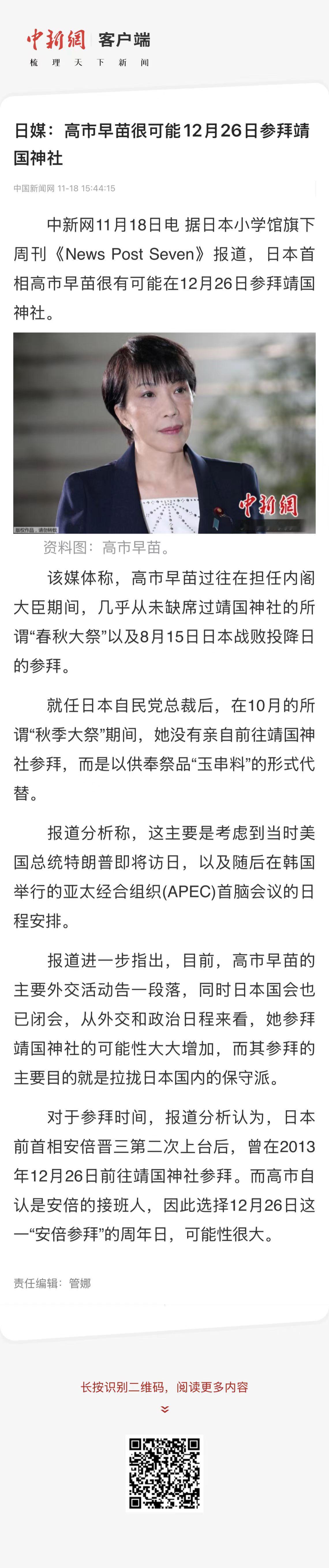 【日媒:高市早苗很可能12月26日参拜靖国神社】 (中国新闻网 2025-11-18 15:44:15 ) 中新网11月18日电 据日本小学馆旗下周刊《News Post Seven》报道,日本首相高市早苗很有可能在12月26日参拜靖国神社。 该媒体称,高市早苗过往在担任内阁大臣期间,几乎从未缺席过靖国神社的所谓“春秋大祭”以及8月15日日本战败投降日的参拜。 就任日本自民党总裁后,在10月的所谓“秋季大祭”期间,她没有亲自前往靖国神社参拜,而是以供奉祭品“玉串料”的形式代替。 报道分析称,这主要是考虑到当时美国总统特朗普即将访日,以及随后在韩国举行的亚太经合组织(APEC)首脑会议的日程安排。 报道进一步指出,目前,高市早苗的主要外交活动告一段落,同时日本国会也已闭会,从外交和政治日程来看,她参拜靖国神社的可能性大大增加,而其参拜的主要目的就是拉拢日本国内的保守派。 对于参拜时间,报道分析认为,日本前首相安倍晋三第二次上台后,曾在2013年12月26日前往靖国神社参拜。而高市自认是安倍的接班人,因此选择12月26日这一“安倍参拜”的周年日,可能性很大。