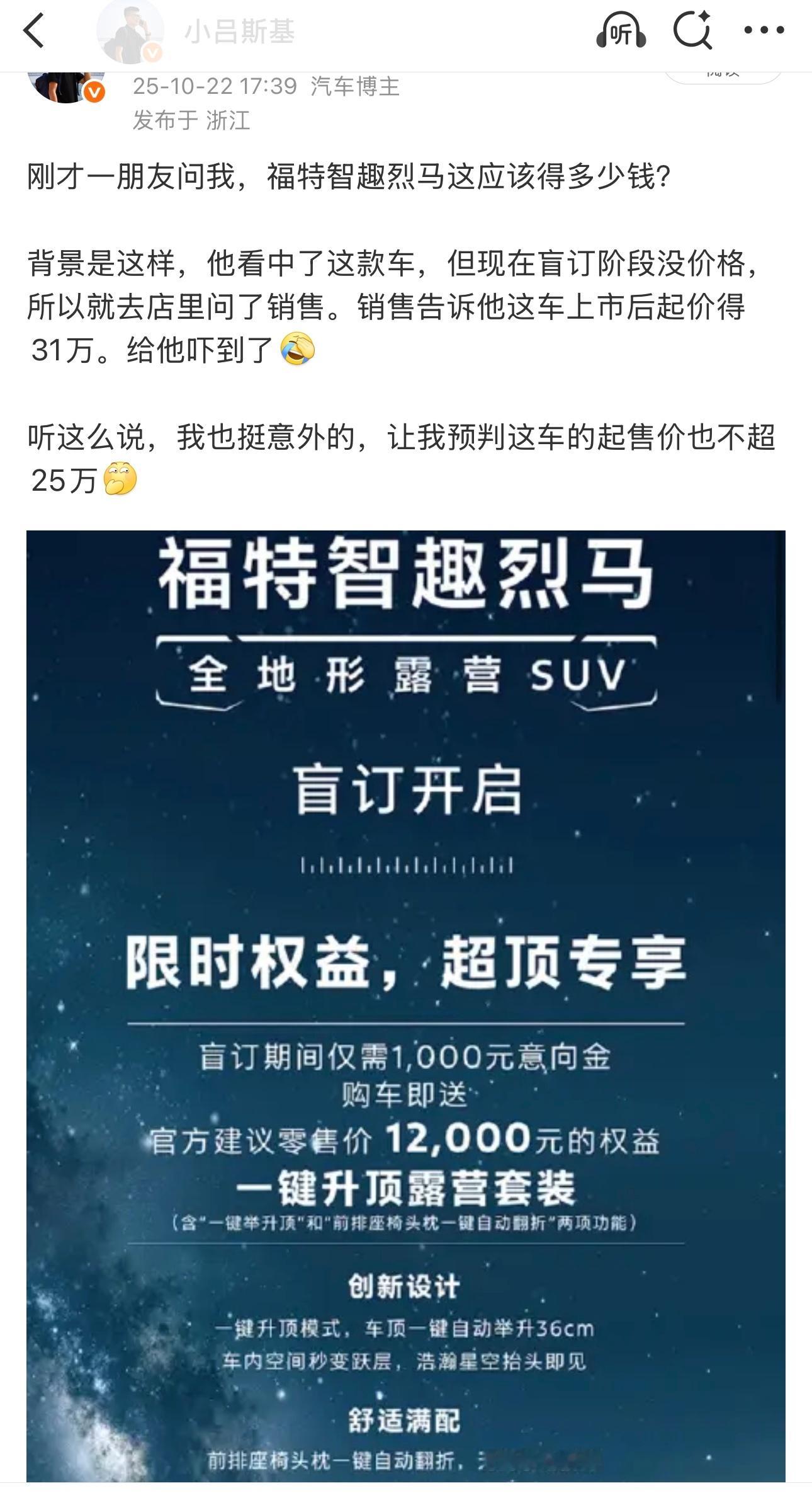 之前发我过福特智趣烈马的价格应该不能超25万,从今天预售价22.98万起来看,还
