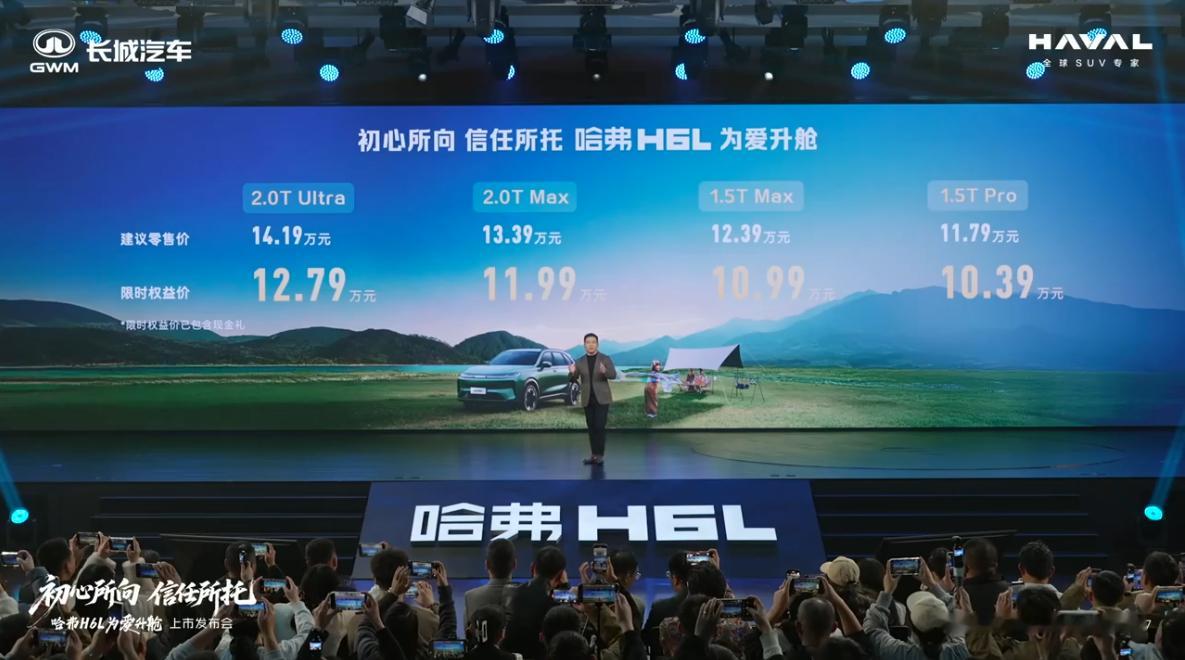 10.39-12.79万的哈弗H6L还能再次雄起吗?从车型加长、轴距加长来说,这一代H6L直接就对标星越L了。而且2.0T+9DCT之后,油耗大幅度下降,性价比也提升了不少。你们觉得H6L还能卖上2万台/月吗?教授觉得,要是再能下1万块的话,那就很对目前市场的口味了。基础参数:4800*1895*1730mm,轴距2810mm发动机:1.5T/2.0T发动机功率:135/175kW汽油标号:92号变速箱:7DCT/9DCT悬架:前麦弗逊后多连杆轮胎尺寸:18/19寸屏幕:14.6中控屏+12.3液晶仪表+HUD外观颜色:黑/青/白/灰内饰颜色:黑/黑+棕/棕+米座舱系统:Coffee OS 3其他功能:胎压显示、360影像+透明底盘、车顶行李架、无钥匙启动+进入+远程、手机互联、语音助手10.39万 1.5T Pro后驻车雷达/定速巡航/6喇叭/18寸轮毂前后LED灯/全景天窗/皮座椅/前排加热/车顶行李架无钥匙启动+进入+远程控制/折叠后视镜+加热10.99万 1.5T Max前驻车雷达/单目摄像头/L2+ACC/电后备箱/9喇叭/64色氛围灯/自动刹车辅助自适应远近光/侧窗隔音玻璃/前排加热通风/前碰撞预警/19寸轮毂/蓝牙钥匙前门+前窗隔音玻璃11.99万 2.0T Max2.0T+9DCT12.79万 2.0T Ultra倒车预警/并线辅助/泊车辅助/HUD方向盘加热/HUD/前排加热通风按摩+二排加热主驾腰部支撑/独立功放