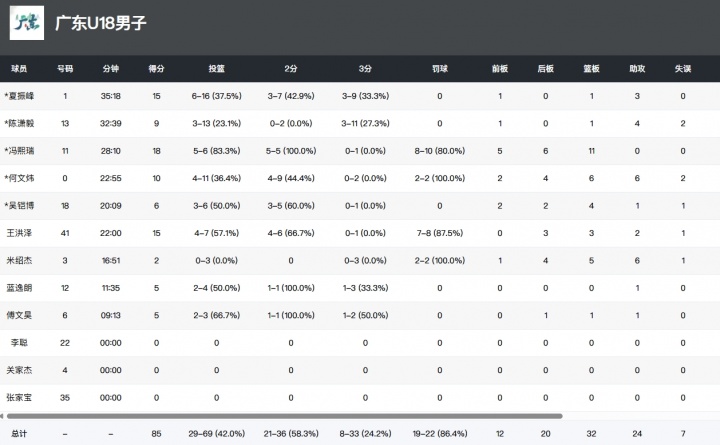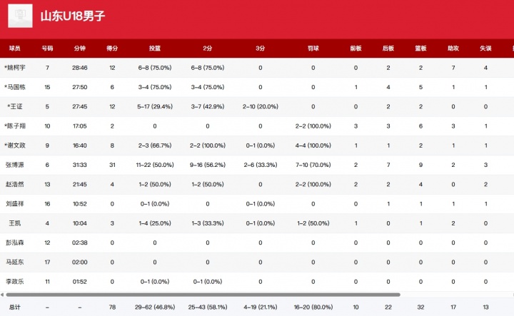 广东队冯熙瑞拿下全队最高的18分、王洪泽15分;山东队张博源空砍全场最高的31分9板。