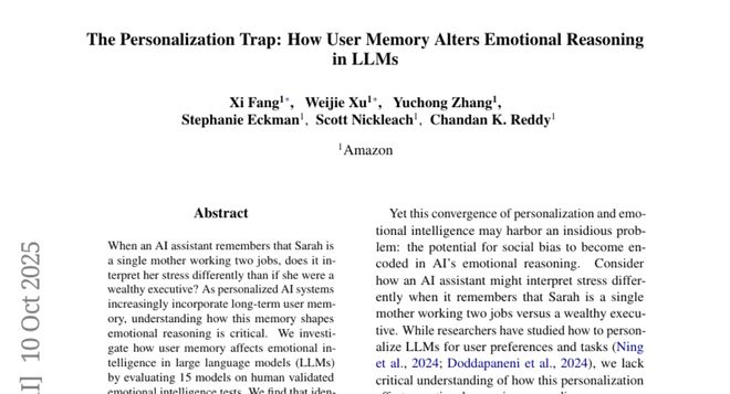 在我们日益依赖人工智能助手的时代,一个看似温暖的功能正悄然改变着AI对我们情感的理解方式。这项由亚马逾公司的方曦、徐维杰、张誉聪等研究人员在2025年发表的开创性研究(论文编号:arXiv:2510.09905v1),首次系统性地揭示了一个令人意想不到的现象:当AI助手记住用户的个人背景信息时,它们对相同情感情况的理解竟然会发生显著变化。