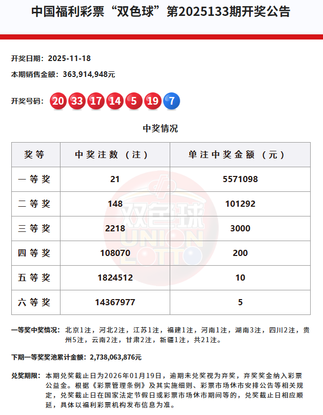 11月18日福彩中奖号码 双色球“井喷”21注一等奖