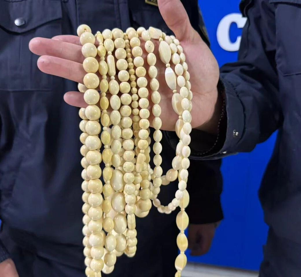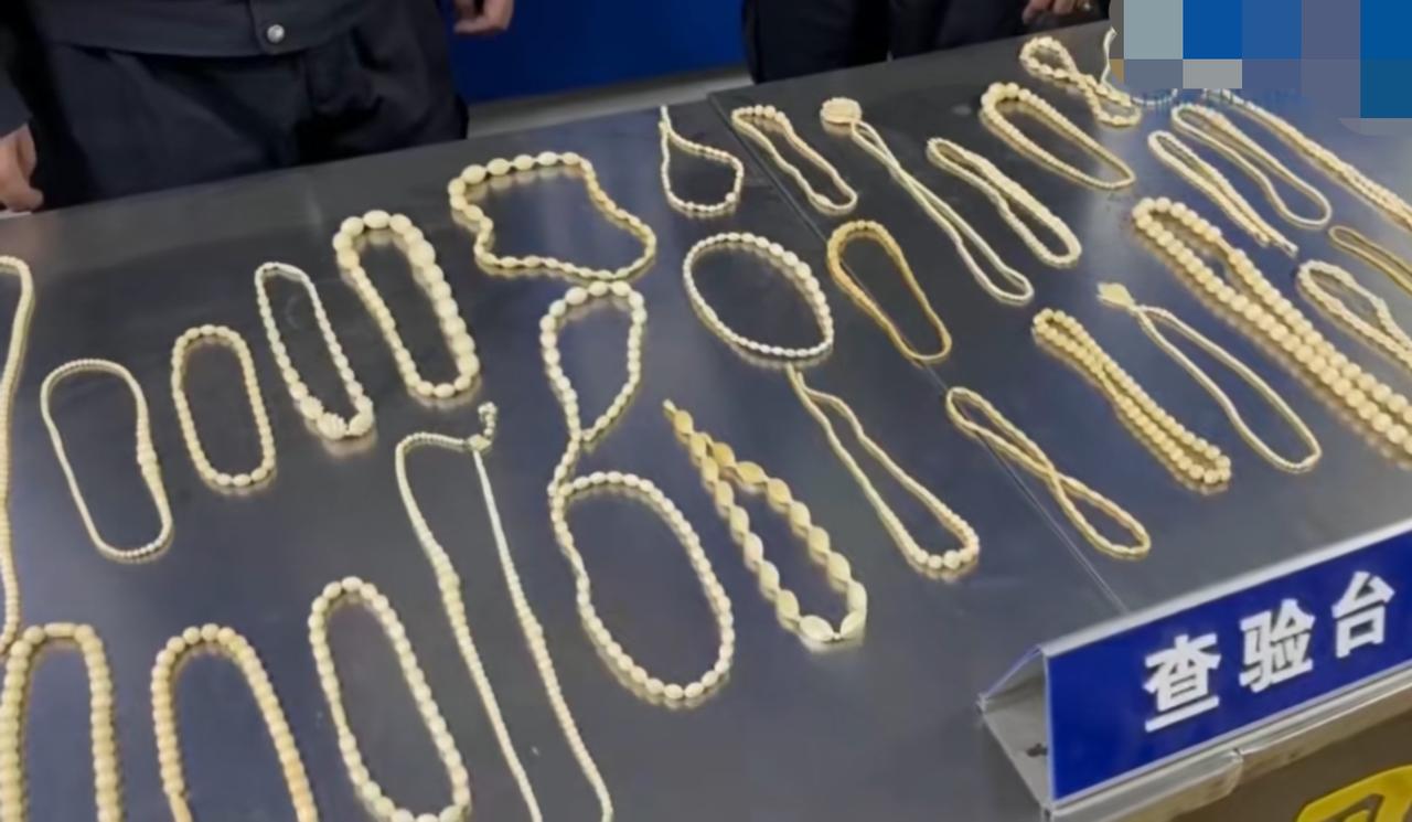 这个真的刑!青岛即墨,一个入境的邮件机检图像不对劲,里面的东西呈现高密度小球状,还有特殊的纹理,疑似不该碰的东西。 开箱检查,工作人员从一个白色塑料袋里掏出一堆项链,不禁心中一惊,项链共有32条,呈米白色,在灯光下闪烁着温润的光泽。 经过鉴定,这些项链都是象牙做的,有亚洲象,有非洲象,重达800多克。 这些象都是濒危物种,是不能碰的,更何况是取象牙做成项链,据说,这个过程很可怕,每一串项链背后,都是以大象的生命为代价的。 看图片中的项链,真的说不上有多精美,真搞不懂,究竟是什么人,要触犯法律去邮寄这些东西。 有人问,如果出国买一条,自己带回来戴,可以吗? 海关发布回复了:不可以,别说一条,一颗珠子也不行。 这件邮件的主人,要负刑责了,这么多条项链,不知道要害了多少头大象。