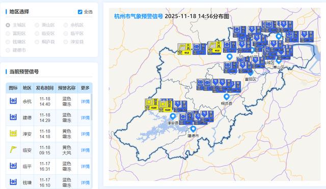截至14:40,杭州多地发布蓝色寒潮、霜冻预警、黄色霜冻、大风预警。据杭州天气消息,预计杭州未来七天(18-24日)晴到多云;寒潮影响后气温继续下降,19-20日早晨最低气温平原地区1~4℃,有霜或霜冻,山区0~-2℃,有薄冰,高山区-3~-5℃,有冰冻;18日起连续5天日平均气温将低于10℃,杭州进入气象学意义上的冬天。