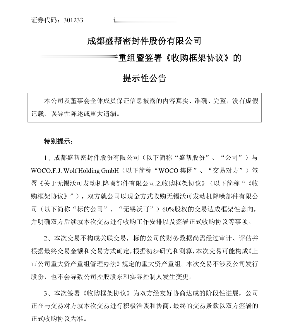 11月18日晚,盛帮股份(301233)公告称,公司与WOCO集团签署《收购框架协议》,拟以现金方式收购无锡沃可发动机降噪部件有限公司(下称“无锡沃可”)60%股权。经初步测算,本次交易预计构成重大资产重组,但不涉及公司发行股份,也不会导致公司控股股东和实控人发生变更。