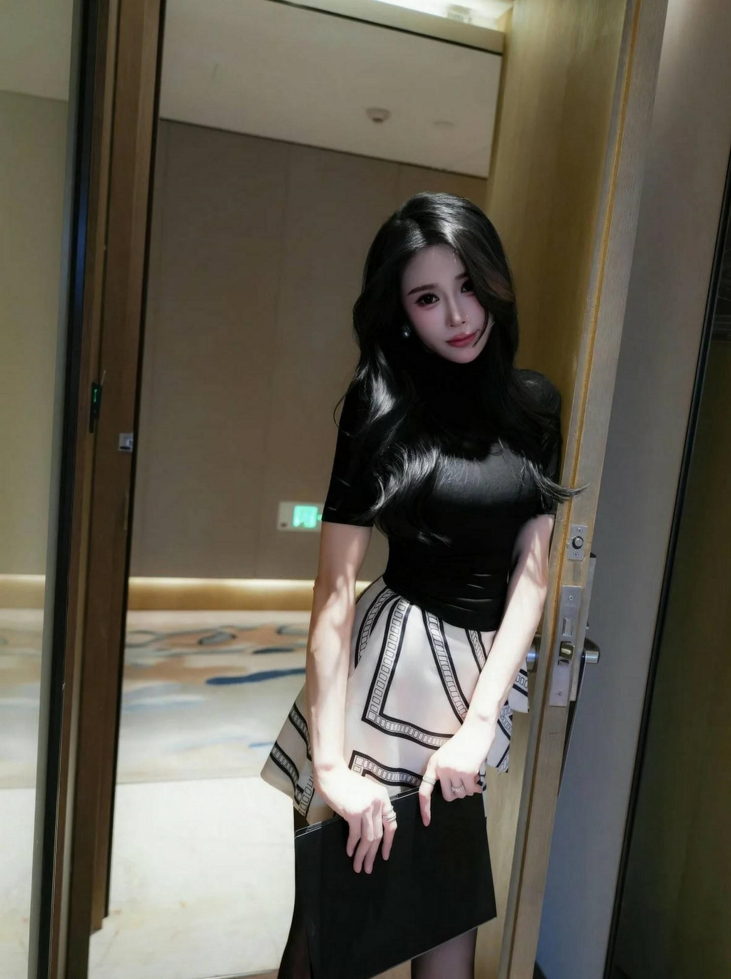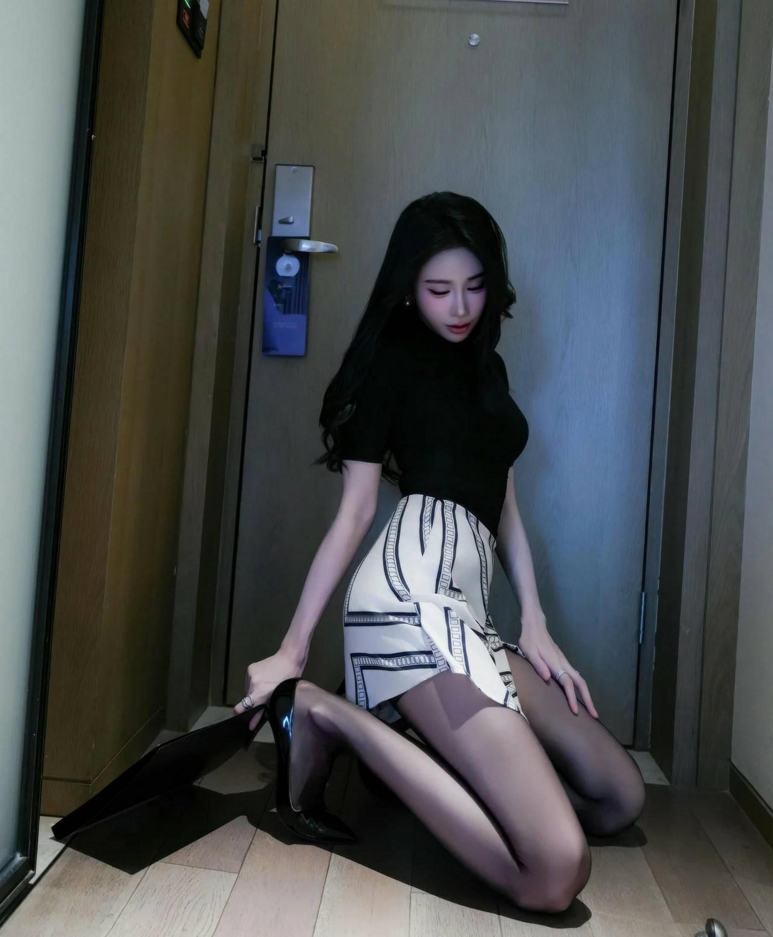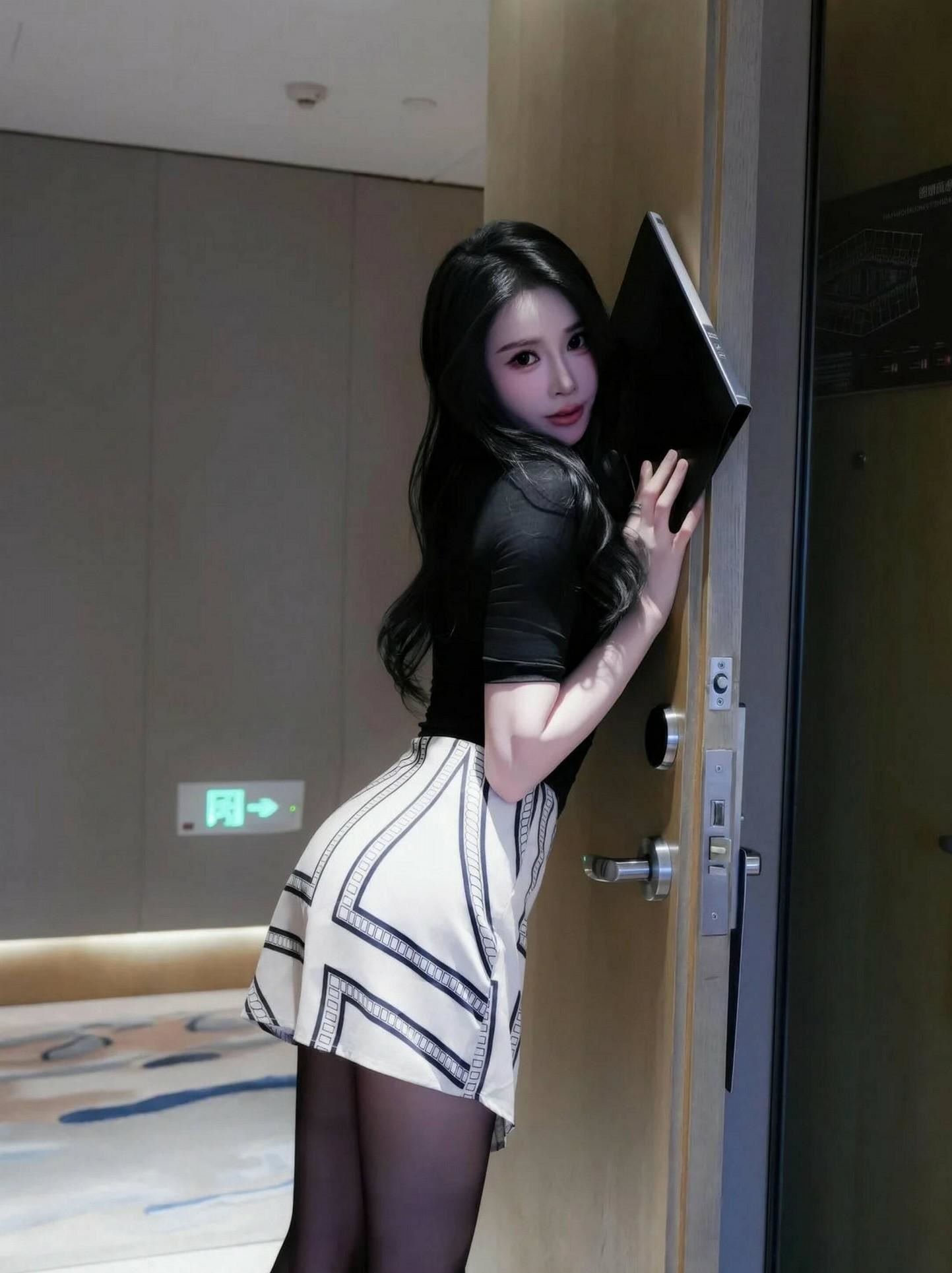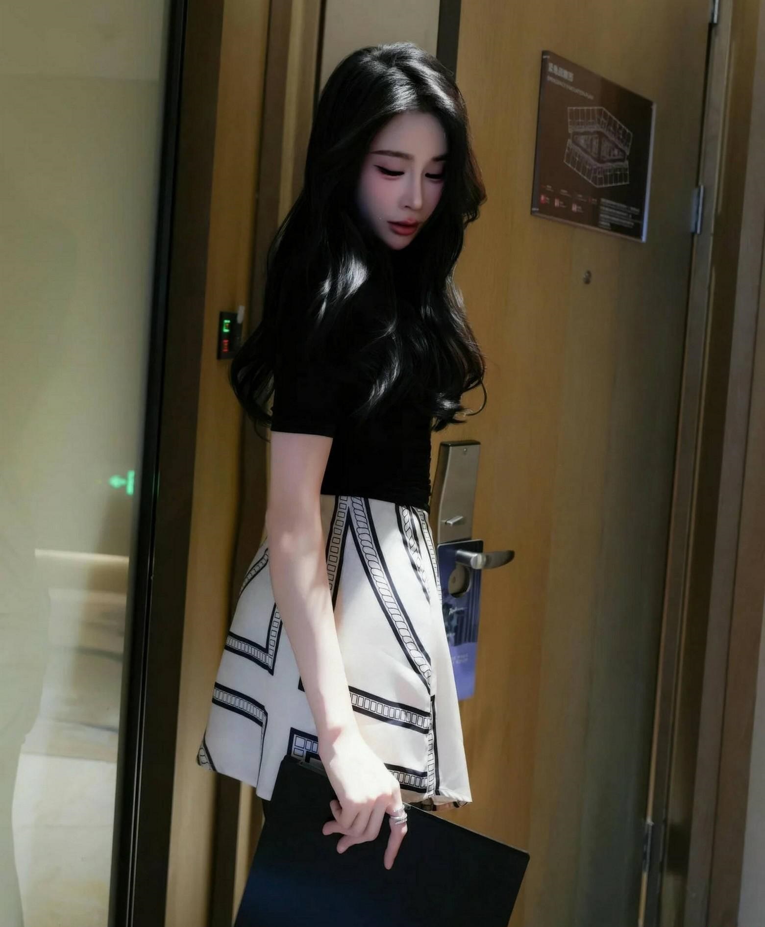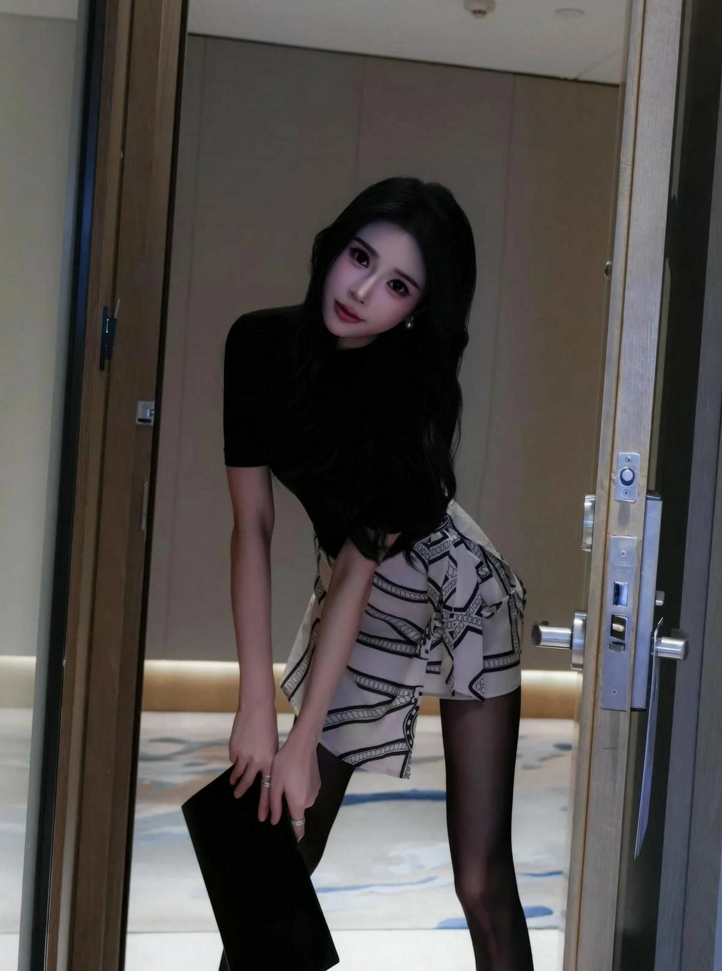 看这位小姐姐,一身黑色修身短袖上衣,搭配黑白几何图案短裙,简约而不失时尚感。👗黑丝袜与黑色尖头高跟鞋的完美结合,更是将她的腿部线条拉长,显得修长而优雅。👠
