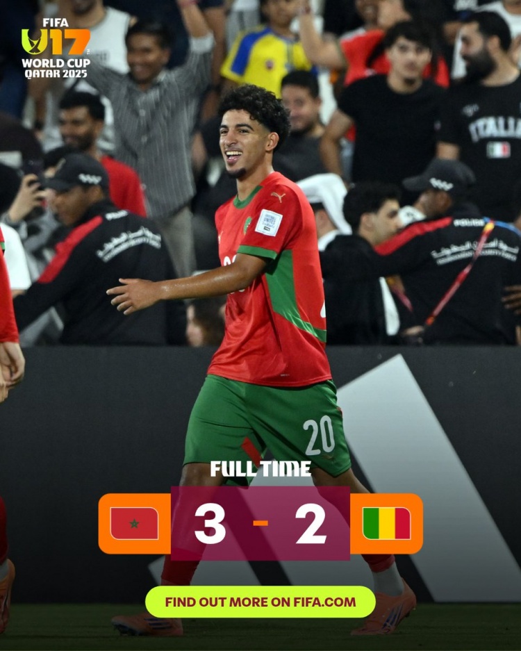摩洛哥U17球员IsmailElAoud此后连进两球,将场上比分改写为3-1,马里U17球员TièmokoBerthe在下半场补时阶段打进1球,场上比分最终定格为3-2。