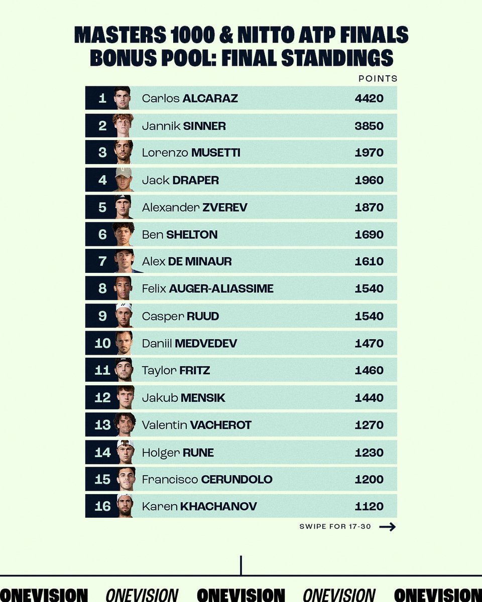 ATPTour(网球)报道。最终的大师赛1000和NittoATP总决赛奖金池排名如下本赛季30名球员将分享2100万美元奖金,具体取决于他们参加ATP顶级赛事的情况。#OneVision