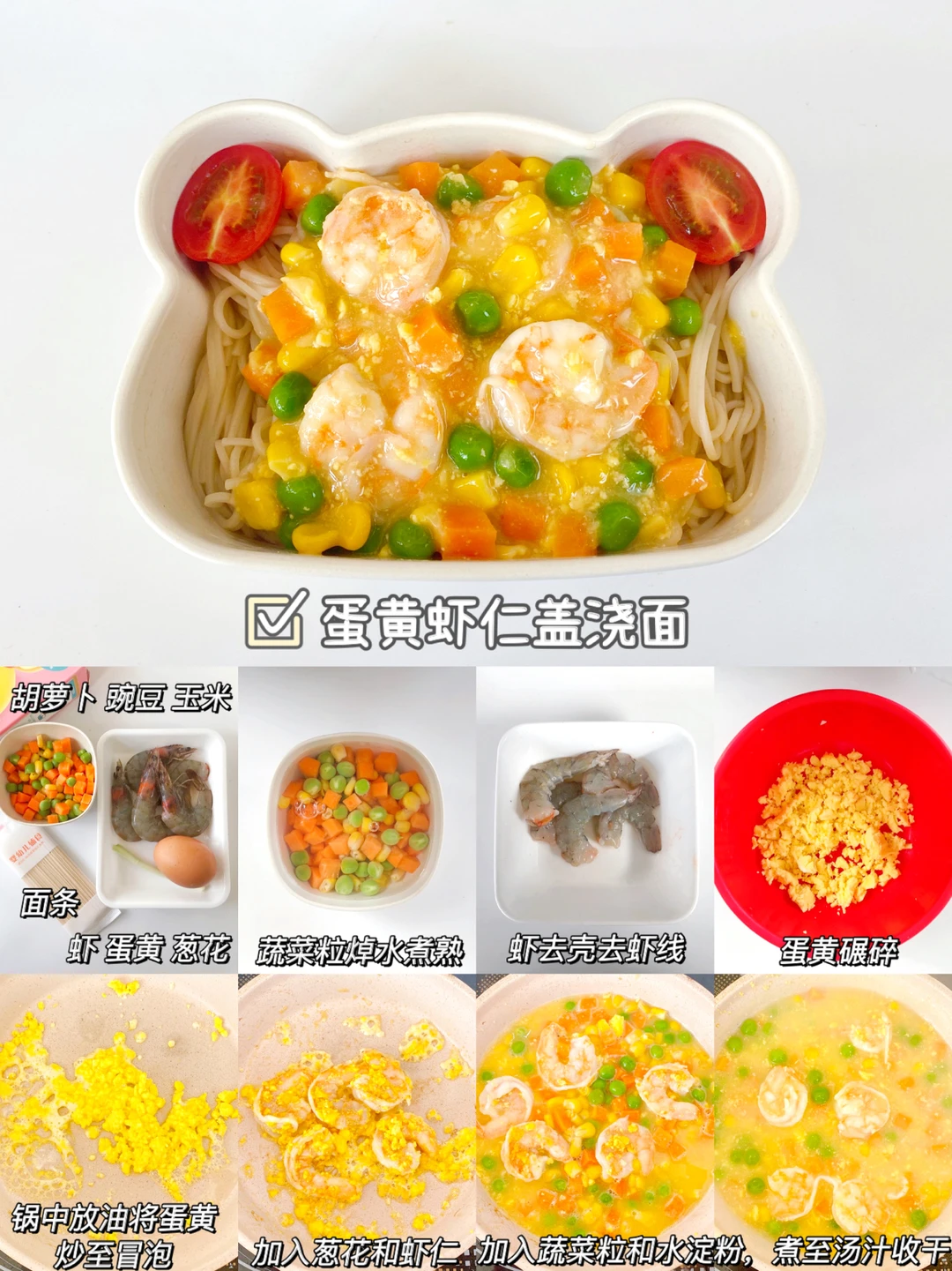 虾、蛋黄、葱花、胡萝卜、豌豆、玉米、面条