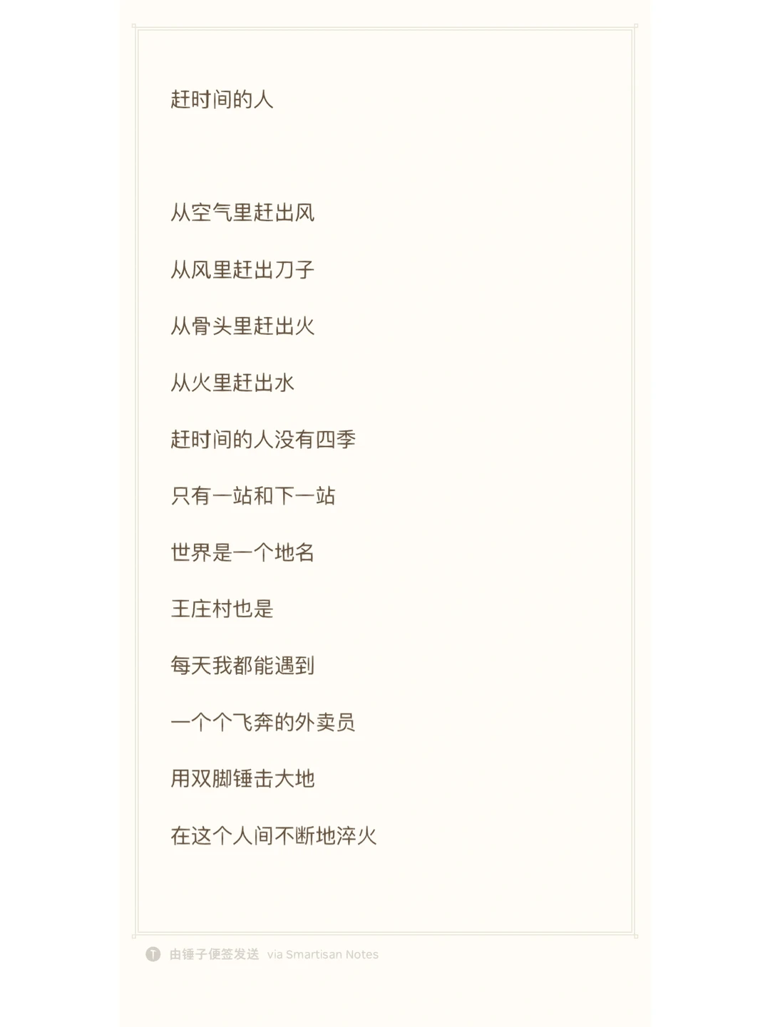 《赶时间的人》这首诗被一位网友转到微博上,引发了广泛共鸣,据说阅读达2000万人次。[火R][火R][火R][火R][点赞R][点赞R][点赞R]