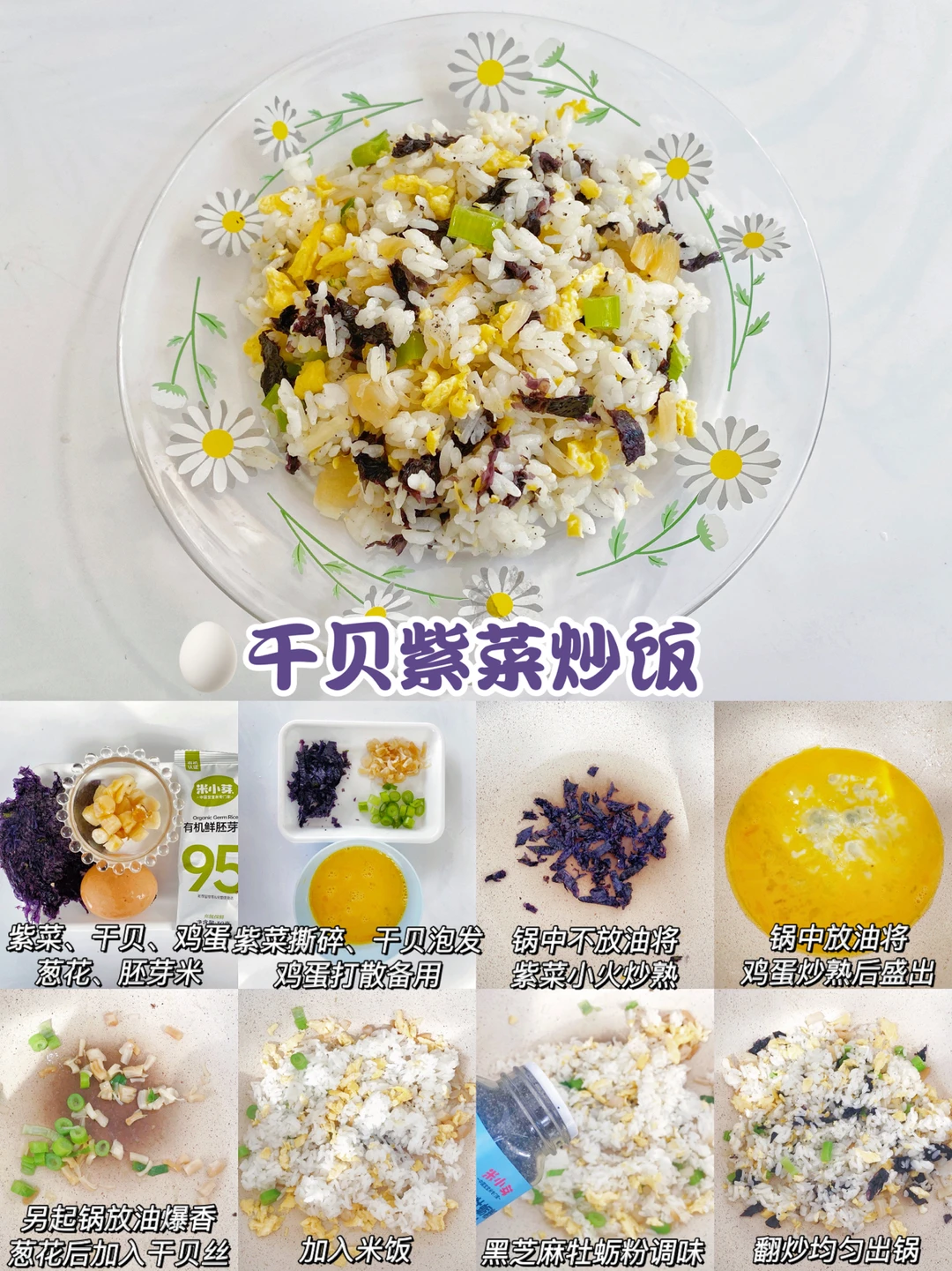 3.另起锅放油炒香葱花后加入干贝丝翻炒,加入米饭和鸡蛋,黑芝麻牡蛎粉调味,再加入紫菜翻炒均匀即可。