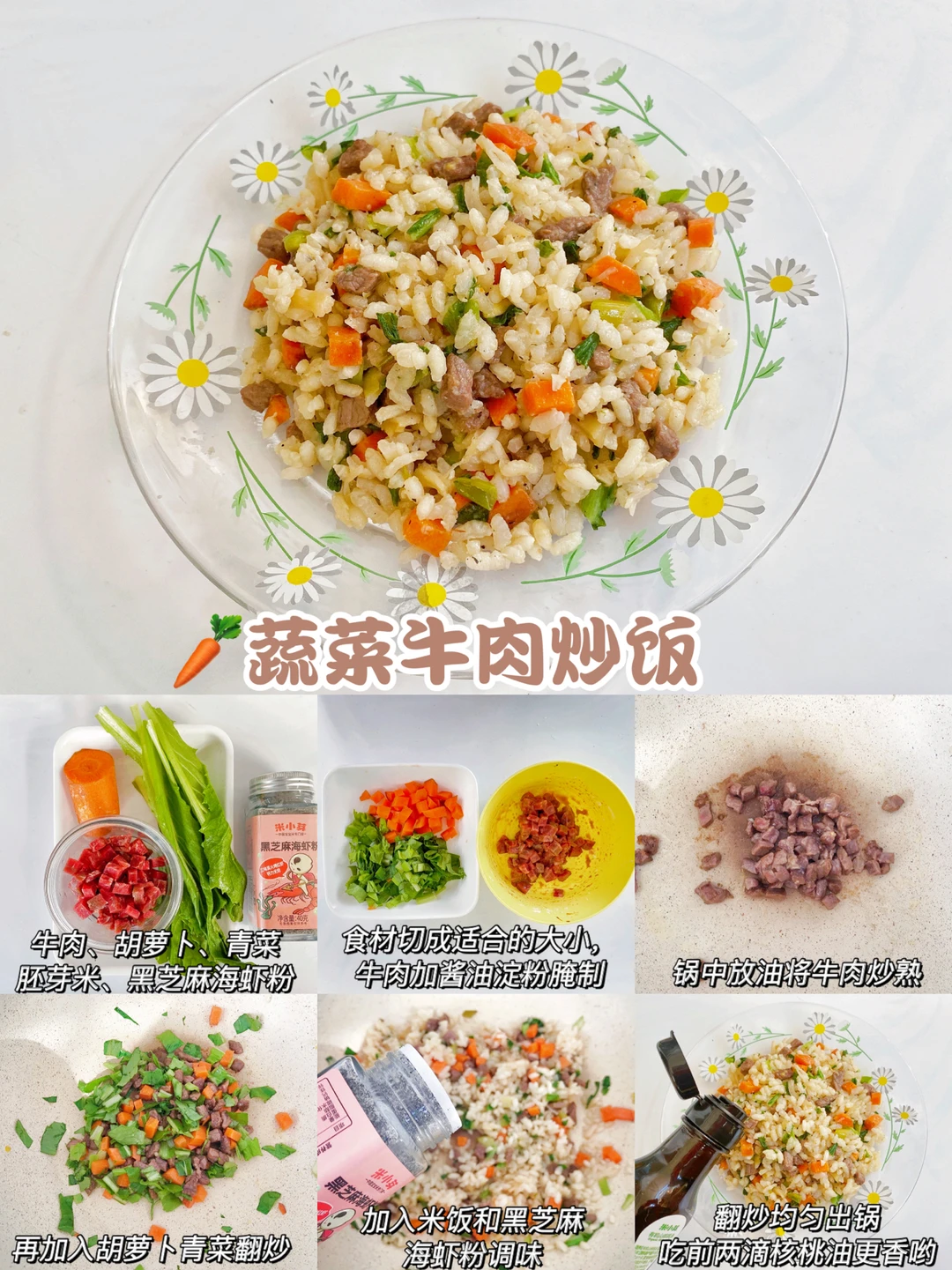 牛肉、胡萝卜、青菜、胚芽米饭、黑芝麻海虾粉