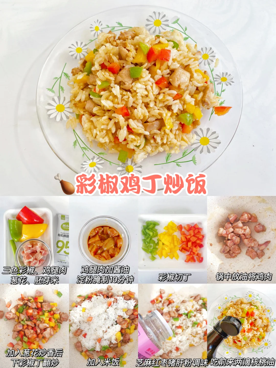鸡腿肉、三色彩椒、葱花、胚芽米饭