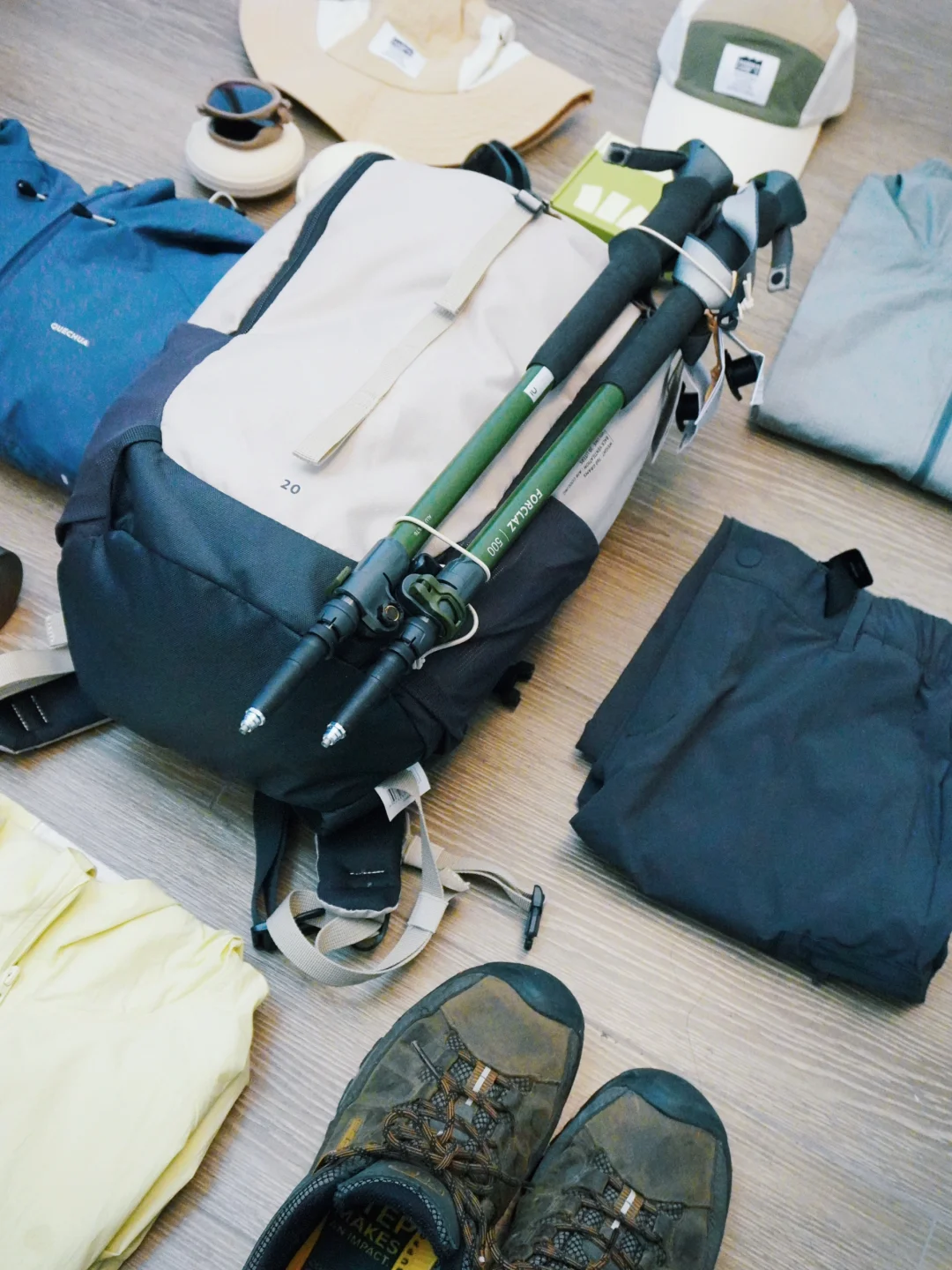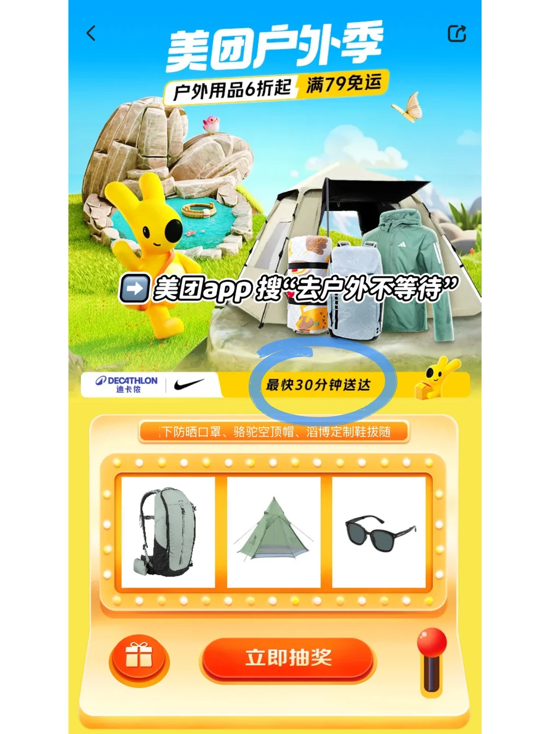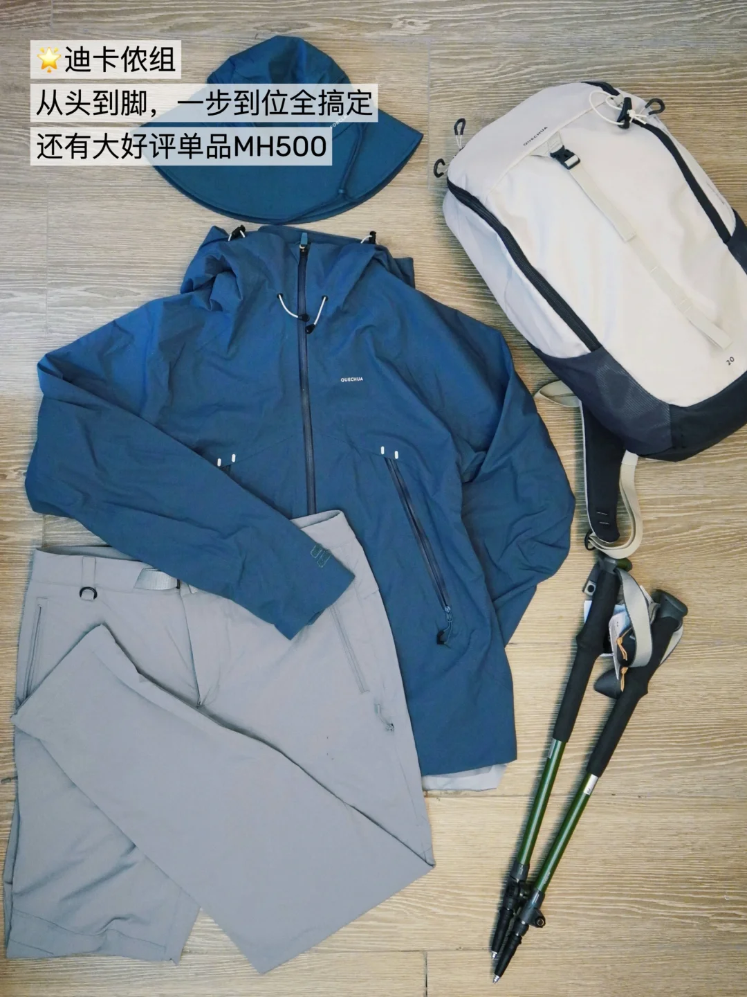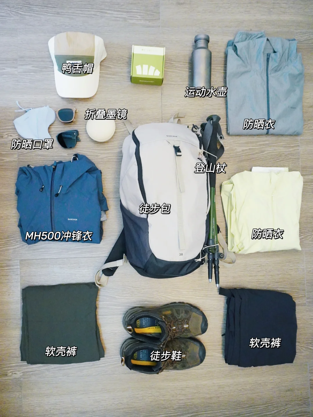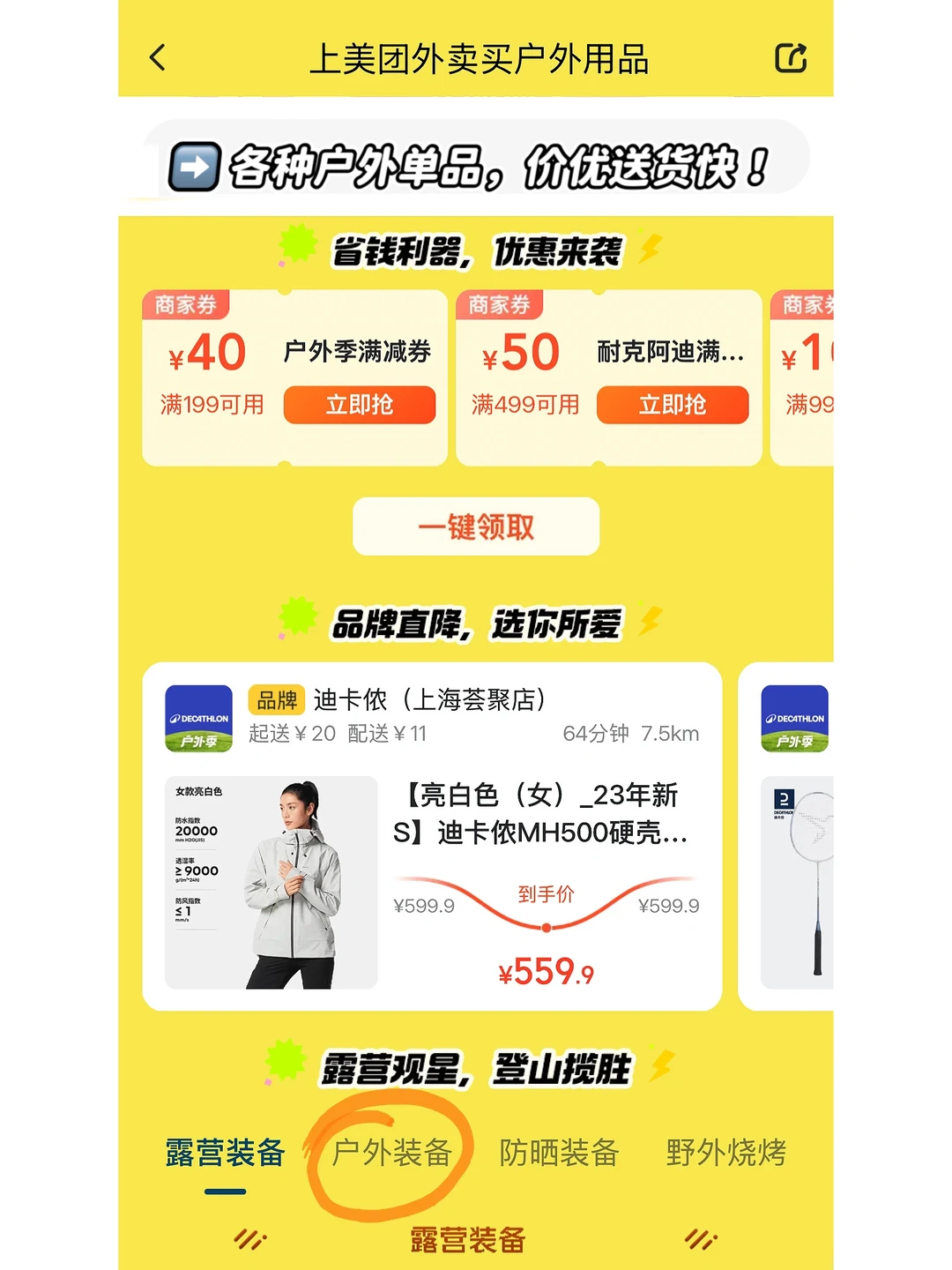 走的路越多,需求也就越聚焦。\n\t\n罗列了一些在这个季节家庭出行的基础装备,足以应对大多数单日轻徒步出行场景,分为徒步必备、防晒必备两大板块,并附上我们最近一直在剁手的购买平台,供各位参考。\n\t\n👉如何一步到位地买到全家徒步的徒步必需品?\n万万没想到!户外装备也可以叫外卖了!\n\t\n在美团app全新上线的“美团户外季”会场活动,可以买到迪卡侬和骆驼户外的各种商品,涵盖徒步、露营等场景,还有蕉下的宝藏防晒单品,最快30分钟送达!主打的就是一个去户外不等待~\n\t\n💡会场指路:美团app搜索“去户外不等待”\n会场页还可领取199-40、99-15的新客红包(分享给3个好友可得),叠加使用后到手价199-55‼️像迪卡侬MH500冲锋衣这样的大单品落地的价格甚至比电商购买还要低低低低⚡️\n\t\n所以,我们这两天又,把必备单品全部重新再买了一轮……清单如下:\n\t\n[打卡R]徒步必备\n①登山杖:迪卡侬\n②冲锋衣:迪卡侬MH500\n③徒步裤:迪卡侬TREK100\n③背包:迪卡侬20L\n④速干衣\n⑤纯钛水壶\n\t\n[打卡R]防晒必备\n①防晒衣:全棉时代\n②渔夫帽:Muji\n③折叠墨镜:蕉下\n④防晒口罩:蕉下\n⑤防晒霜\n\t\n另外,4.21-5.11期间,订单满249元再备注暗号:\"去户外不等待”,还有神秘装备送!\n\t\n仅限迪卡侬、骆驼、滔搏(阿迪达斯和nike)商家哦!趁着春光正好,赶紧买齐装备就出发吧!🌼\n\t\n