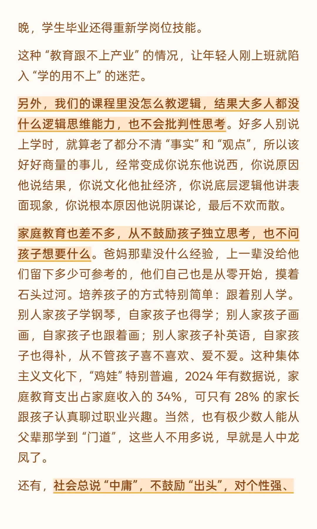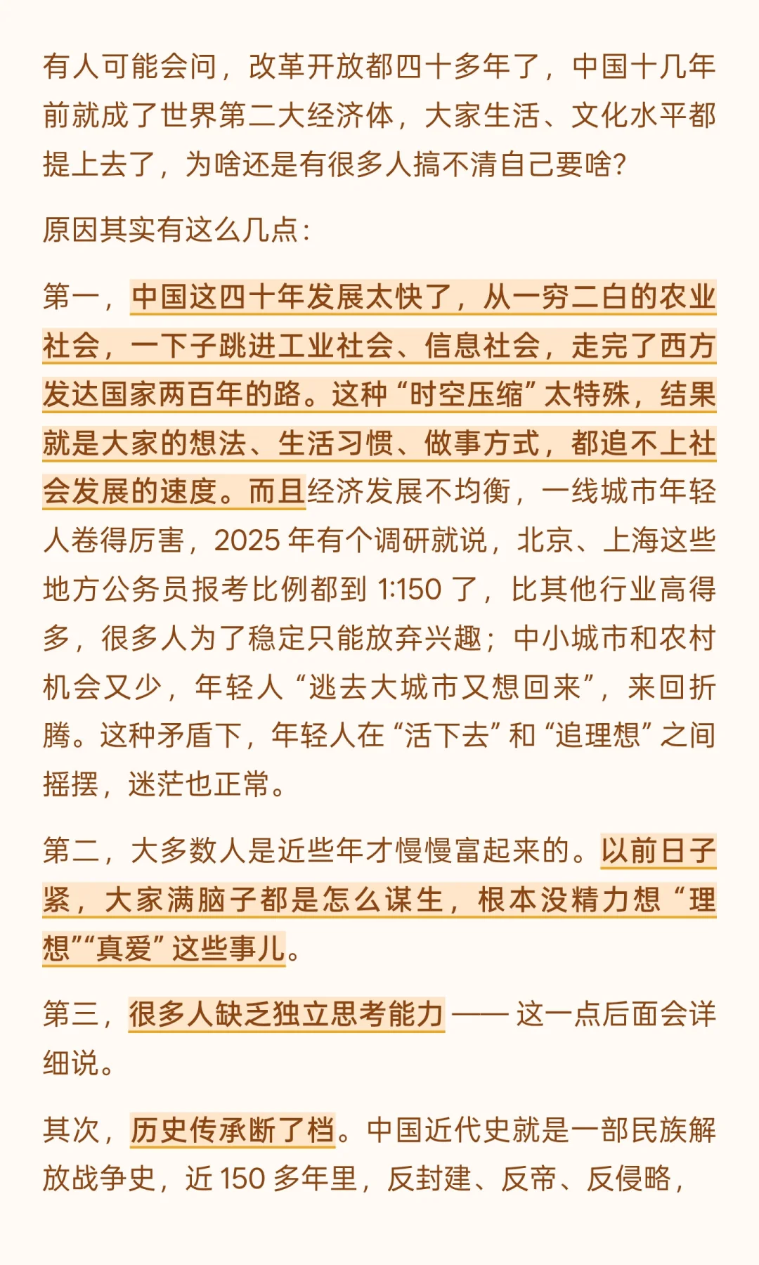 中国需通过改革提升教育水平,培养独立思考能力,缩短迷茫时间。
