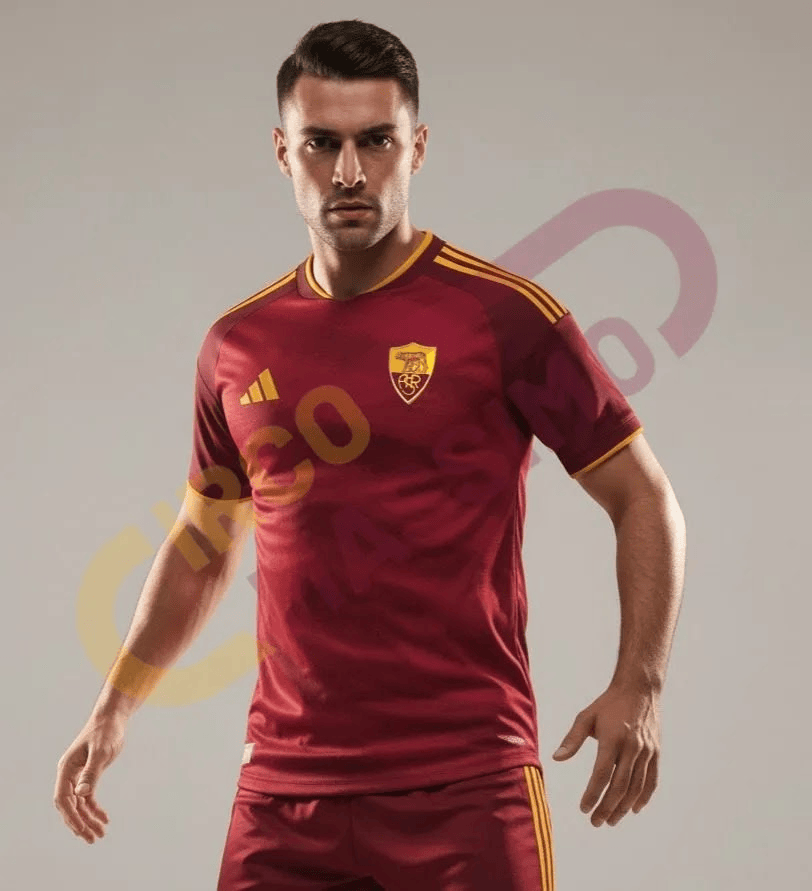 新赛季的主场球衣由阿迪达斯设计,采用与意大利国家队最新球衣相同的模板,包括领口造型和结构化版型。球衣整体采用两种红色调设计:肩部和领口为深红色,胸部为经典的罗马红色,同时辅以细腻的斜向图案装饰。