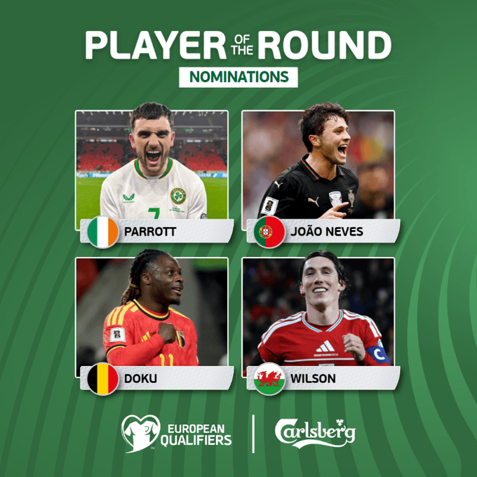 虎扑11月19日讯欧足联官方公布了本轮世界杯欧洲区预选赛的最佳球员候选名单。