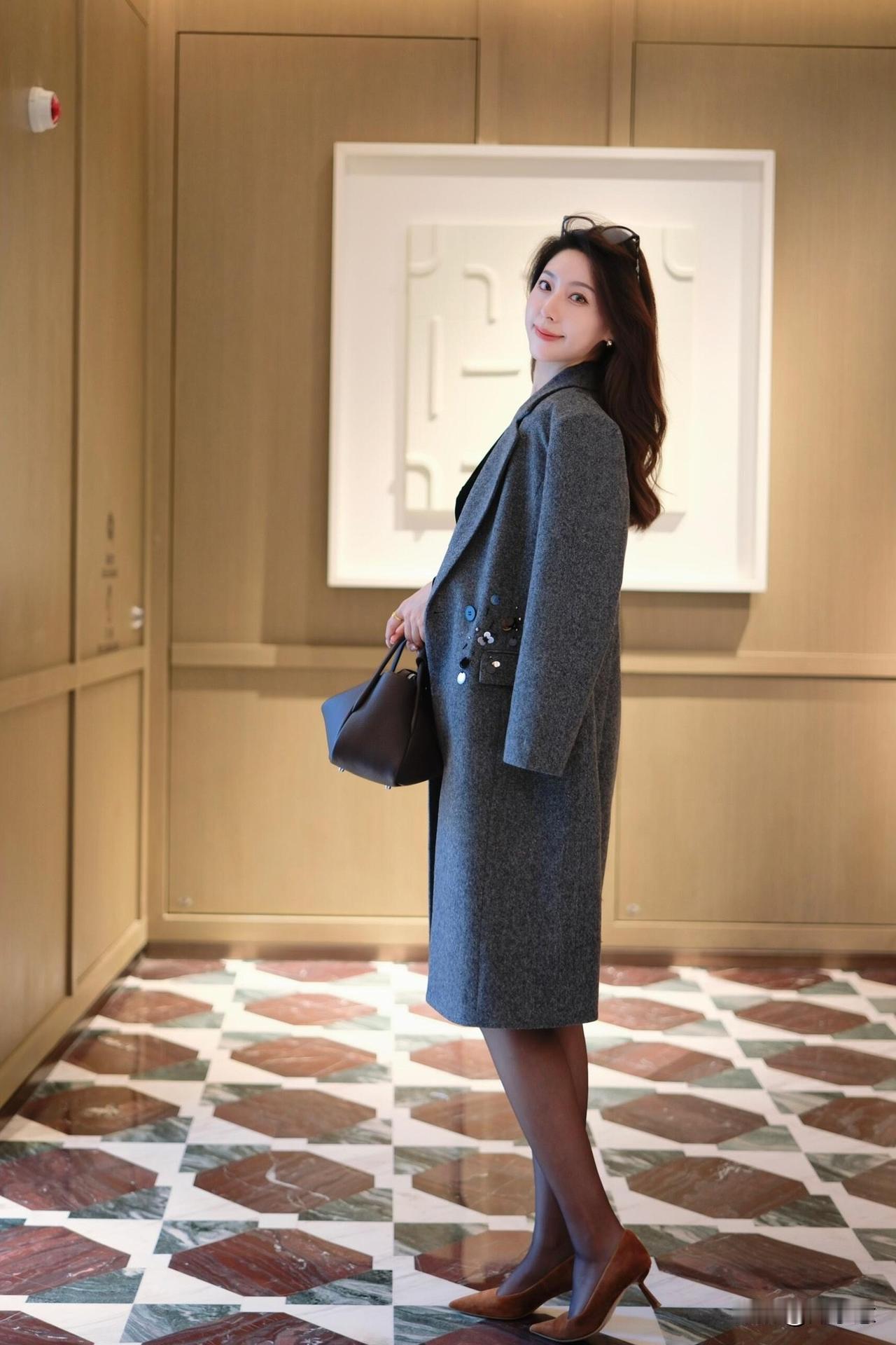 苏提达去故宫参观了,穿了一身新造型,黑色套装裙式大衣,戴着黑色皮手套,双手拿着黑