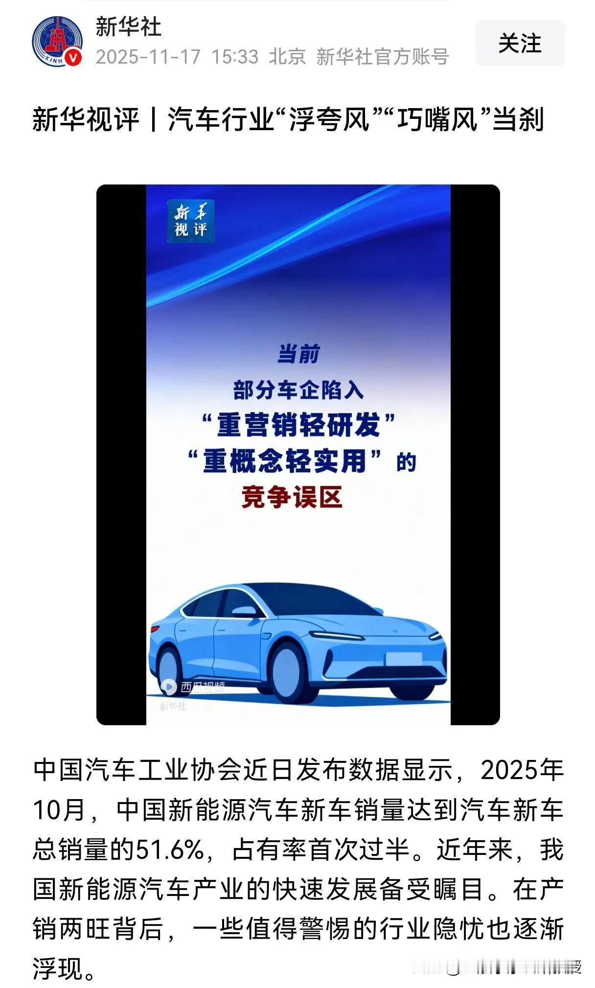 新华社再批汽车行业浮夸乱象。零部件名武侠风,普通技术被神化,发布会变成浮夸术语的秀场,拉踩同行博关注。新能源汽车行业竞争确实越发激烈,各大厂商为了在竞争的红海中赢得销量也是拼尽全力,使劲浑身解数营造独特唯一的氛围,让消费者心动购买。 小米的“挖孔机盖”官司还在打,雷军在自媒体的发文被小米法务认为是不懂结构乱发的。 新华社在这个时候给汽车行业的“浮夸风”泼了一盆冷水,希望车企能够警醒,没有什么套路能得人心,只有真诚,实事求是才能行稳致远。