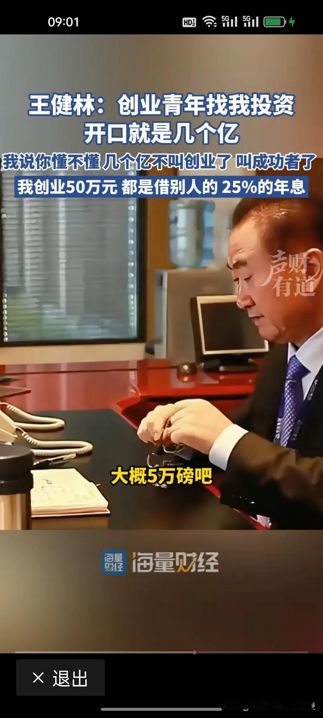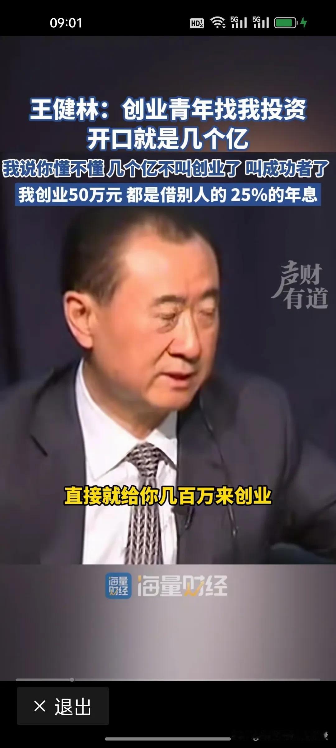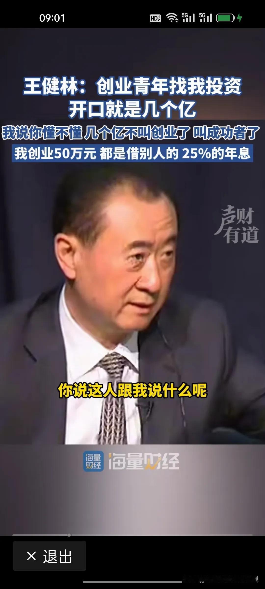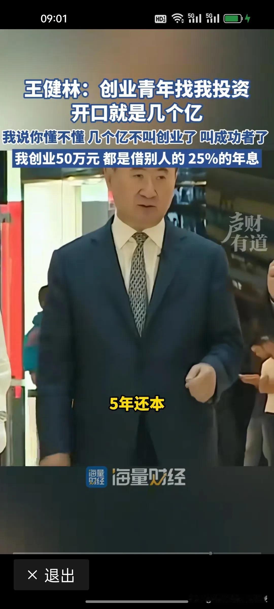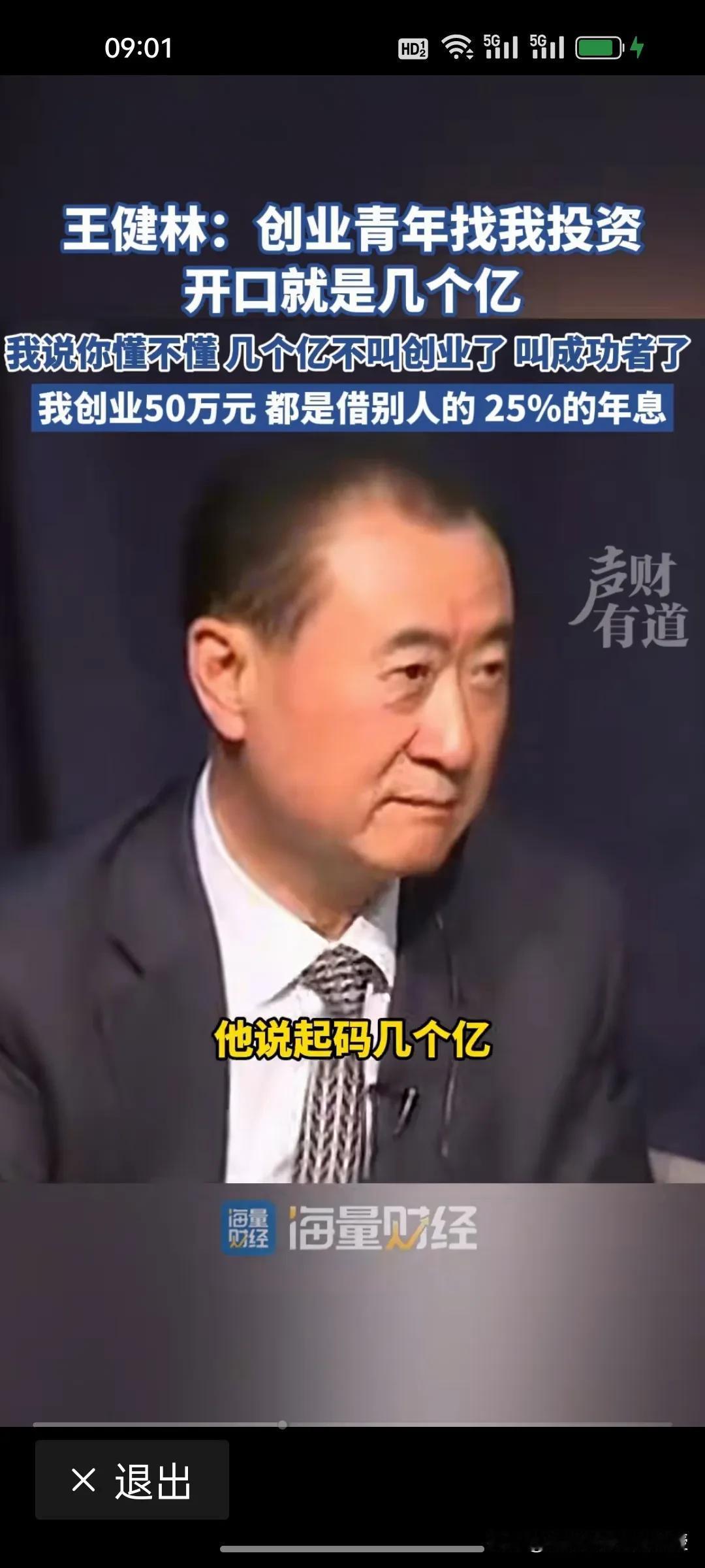 不知道王健林口中的年轻人指的是谁?王健林过去在参加论坛时候说,有个年轻人说几百万创业不够,要几个亿,王健林说几个亿就不叫创业者,叫成功者了。他说自己创业的时候50万是借的,贷款利息25%,5年还本,在那时,借不到50万,就无法注册公司。 在王健林眼中,创业者的起步资金就是几百万,如果花了几百万也没有成果,那花几个亿也肯定就是打水漂。年轻人创业不能好高骛远,还是要脚踏实地。 王健林对儿子王思聪也是一样,2009年给其资金设立普思资本创业练手,有媒体报道是5亿,后来王思聪说根本没有,只是千万级分批给,这也符合王健林对待创业的一贯逻辑。
