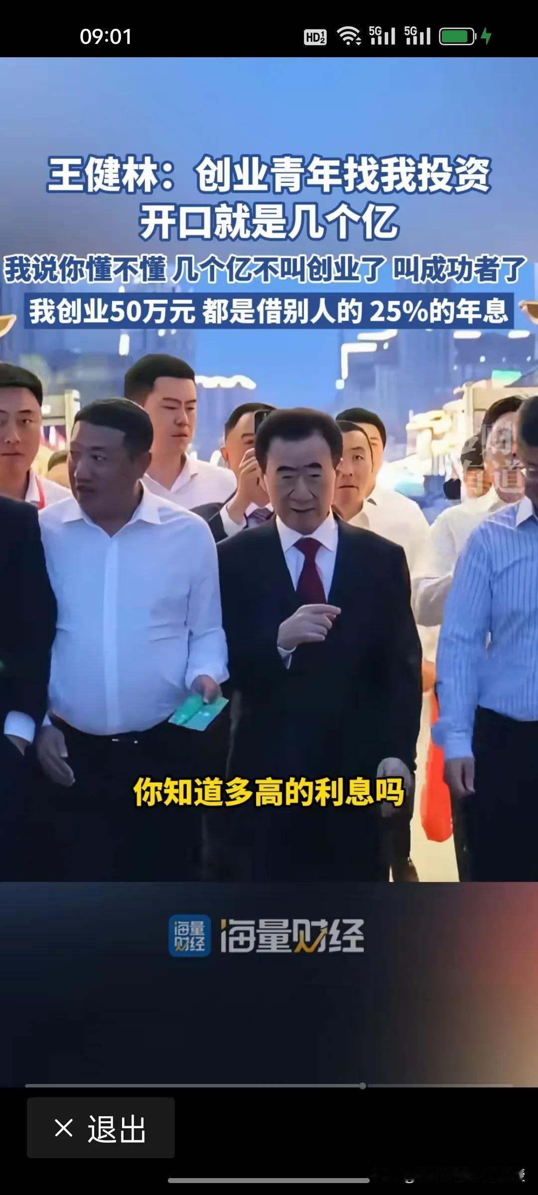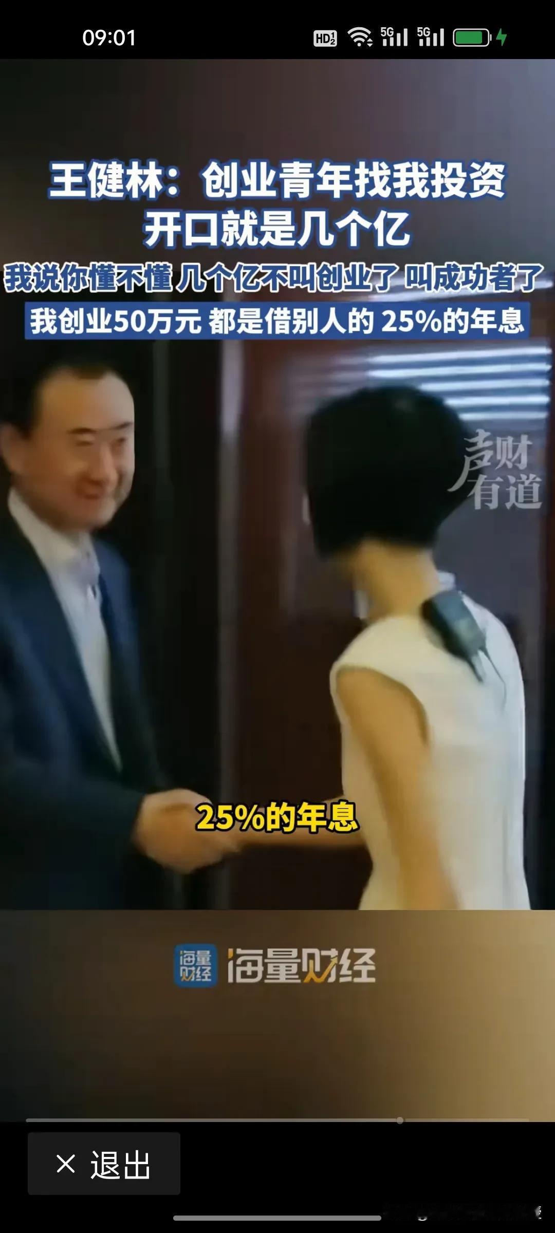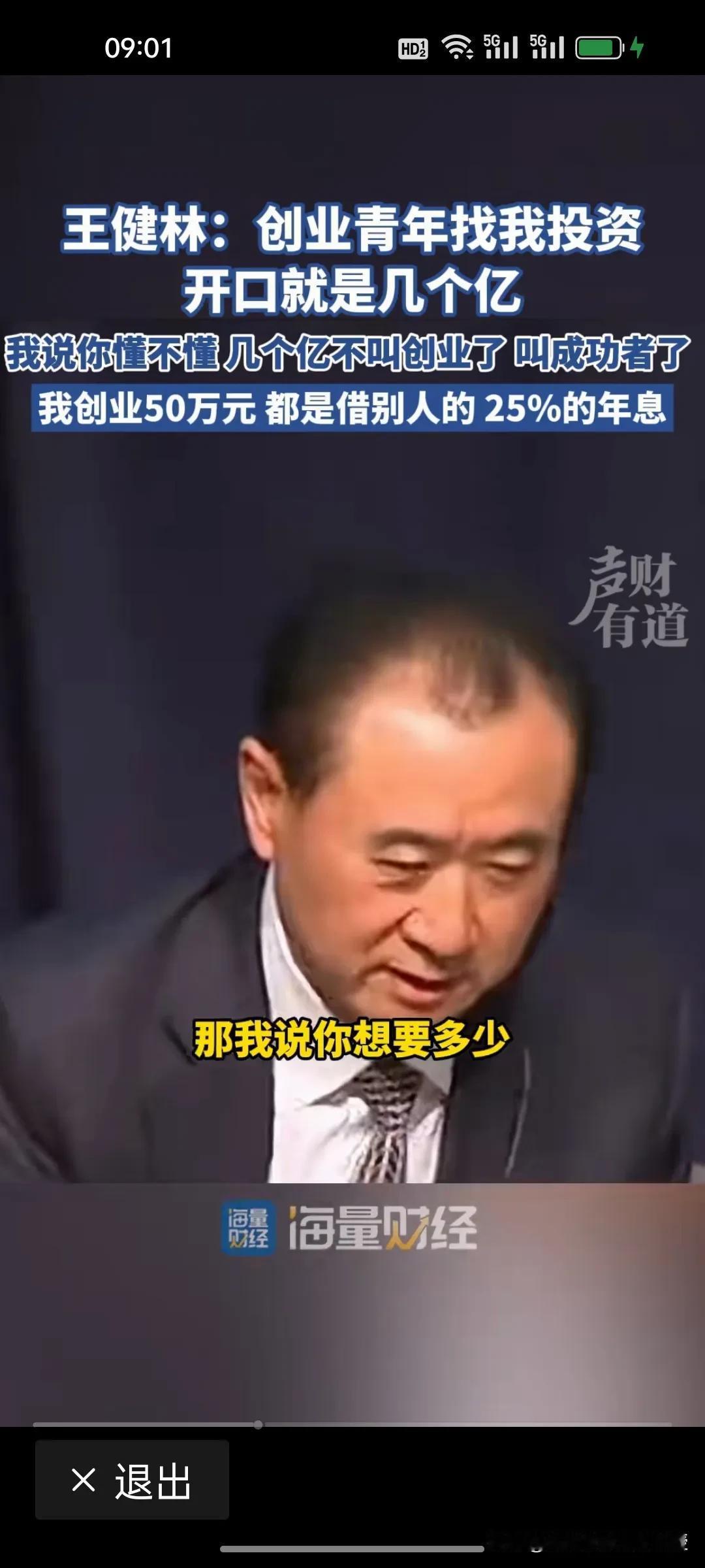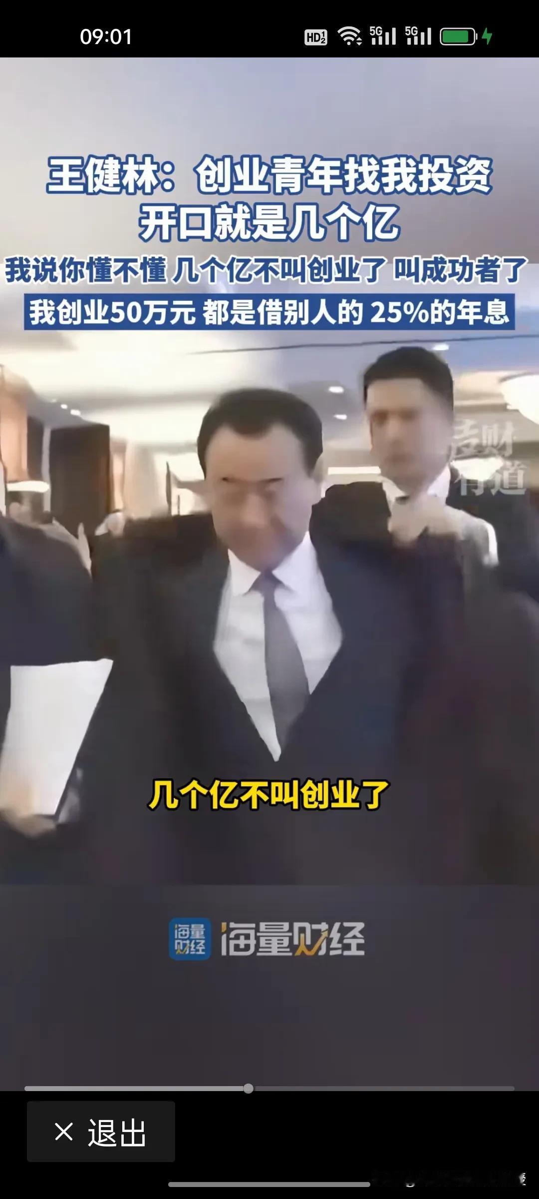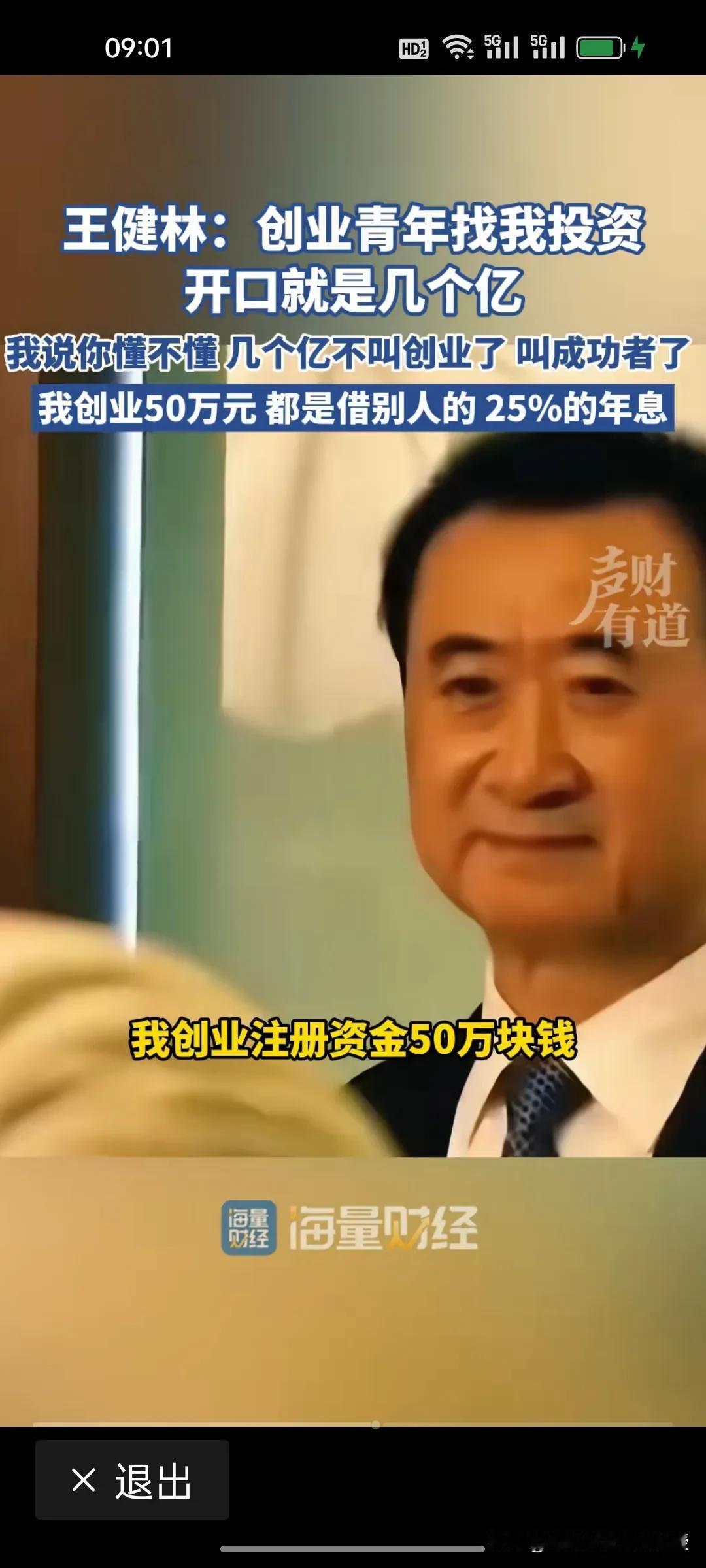 不知道王健林口中的年轻人指的是谁?王健林过去在参加论坛时候说,有个年轻人说几百万创业不够,要几个亿,王健林说几个亿就不叫创业者,叫成功者了。他说自己创业的时候50万是借的,贷款利息25%,5年还本,在那时,借不到50万,就无法注册公司。 在王健林眼中,创业者的起步资金就是几百万,如果花了几百万也没有成果,那花几个亿也肯定就是打水漂。年轻人创业不能好高骛远,还是要脚踏实地。 王健林对儿子王思聪也是一样,2009年给其资金设立普思资本创业练手,有媒体报道是5亿,后来王思聪说根本没有,只是千万级分批给,这也符合王健林对待创业的一贯逻辑。