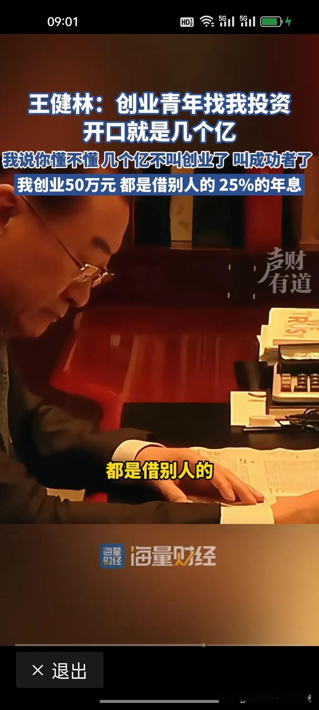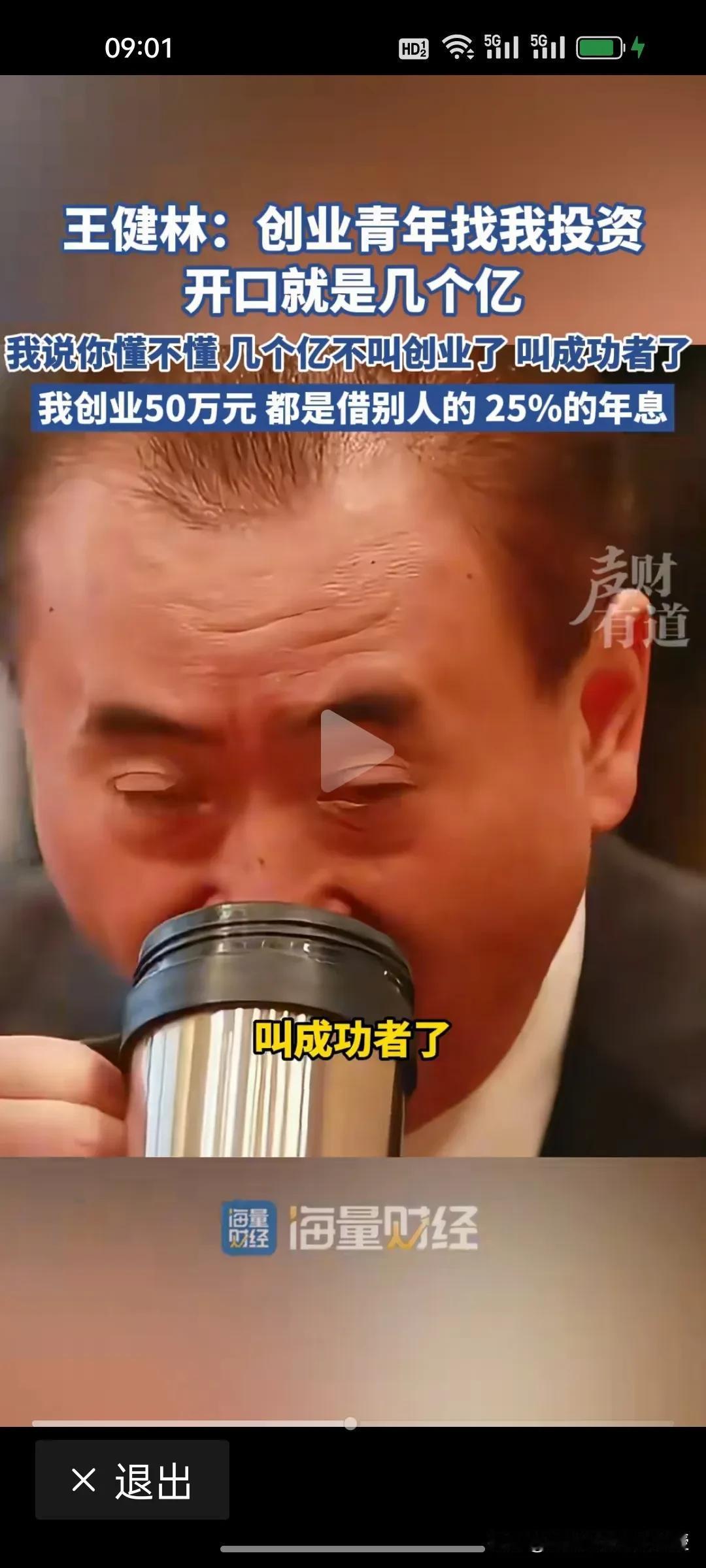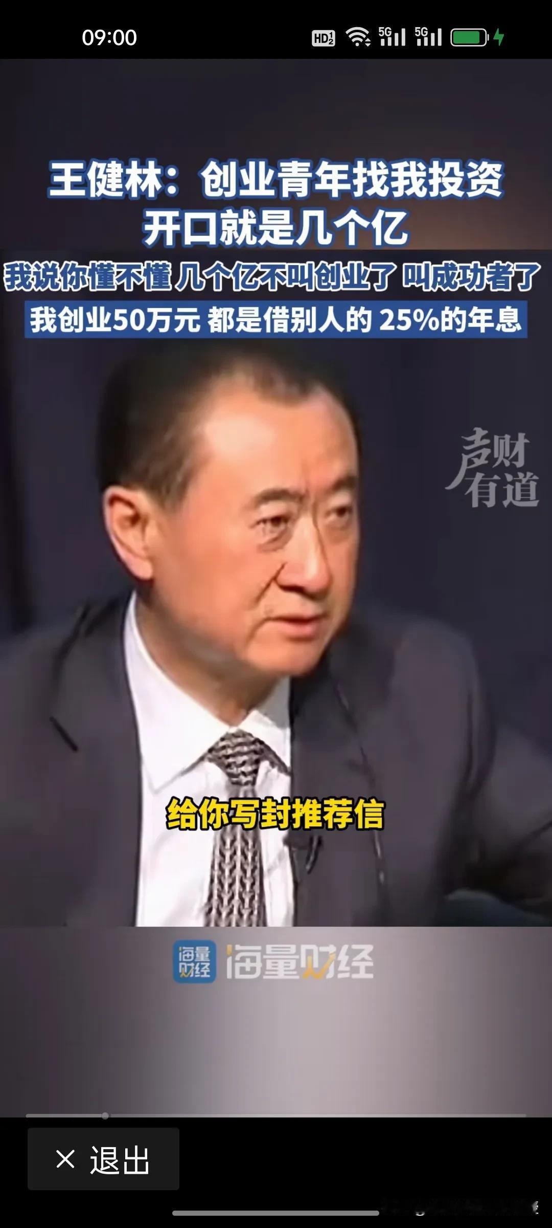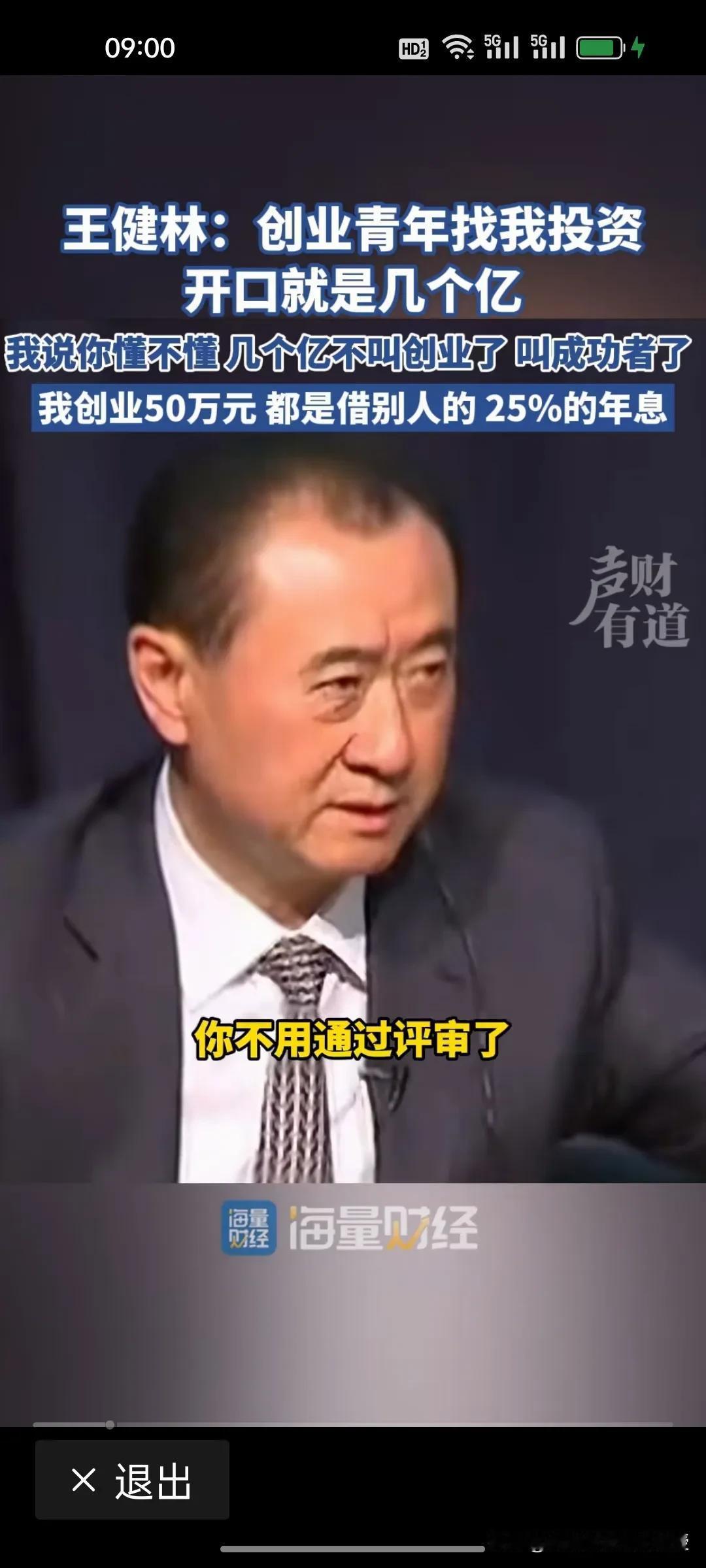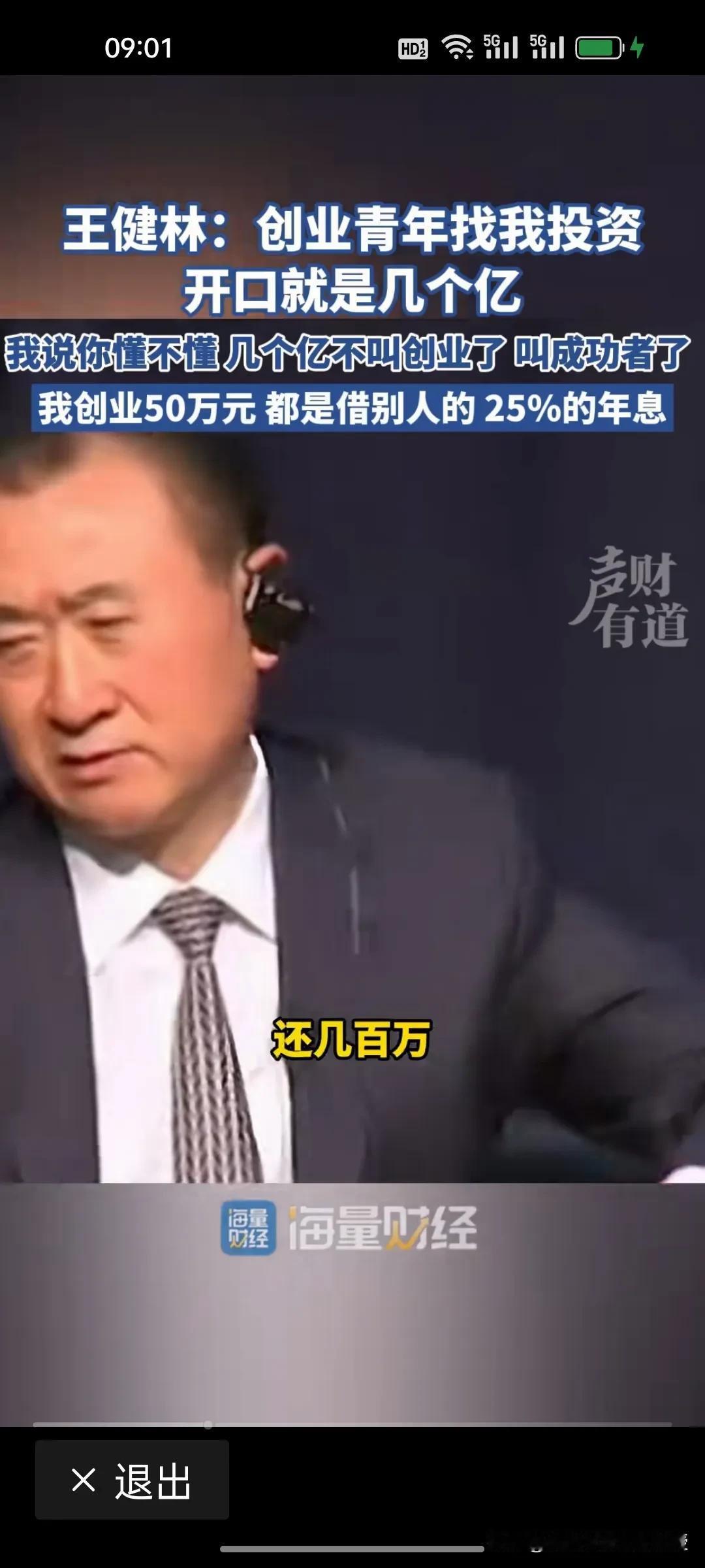 不知道王健林口中的年轻人指的是谁?王健林过去在参加论坛时候说,有个年轻人说几百万创业不够,要几个亿,王健林说几个亿就不叫创业者,叫成功者了。他说自己创业的时候50万是借的,贷款利息25%,5年还本,在那时,借不到50万,就无法注册公司。 在王健林眼中,创业者的起步资金就是几百万,如果花了几百万也没有成果,那花几个亿也肯定就是打水漂。年轻人创业不能好高骛远,还是要脚踏实地。 王健林对儿子王思聪也是一样,2009年给其资金设立普思资本创业练手,有媒体报道是5亿,后来王思聪说根本没有,只是千万级分批给,这也符合王健林对待创业的一贯逻辑。