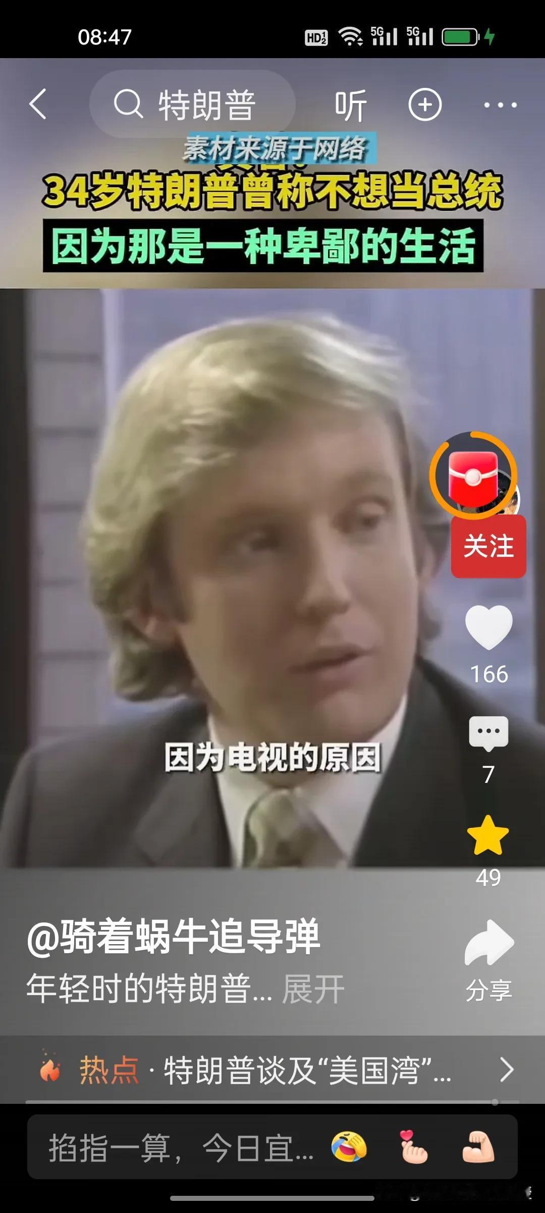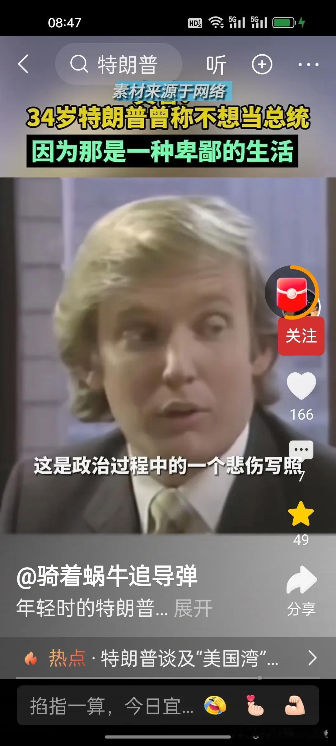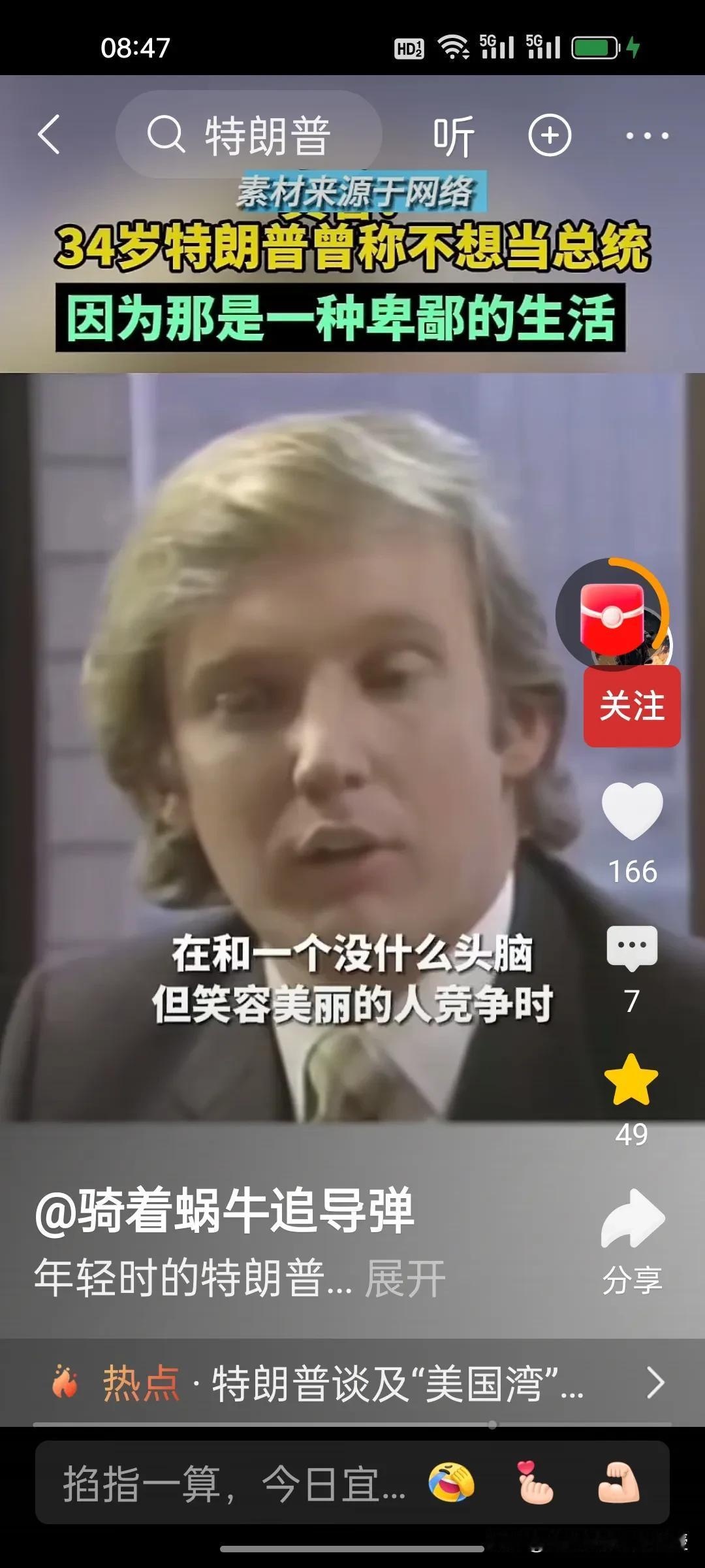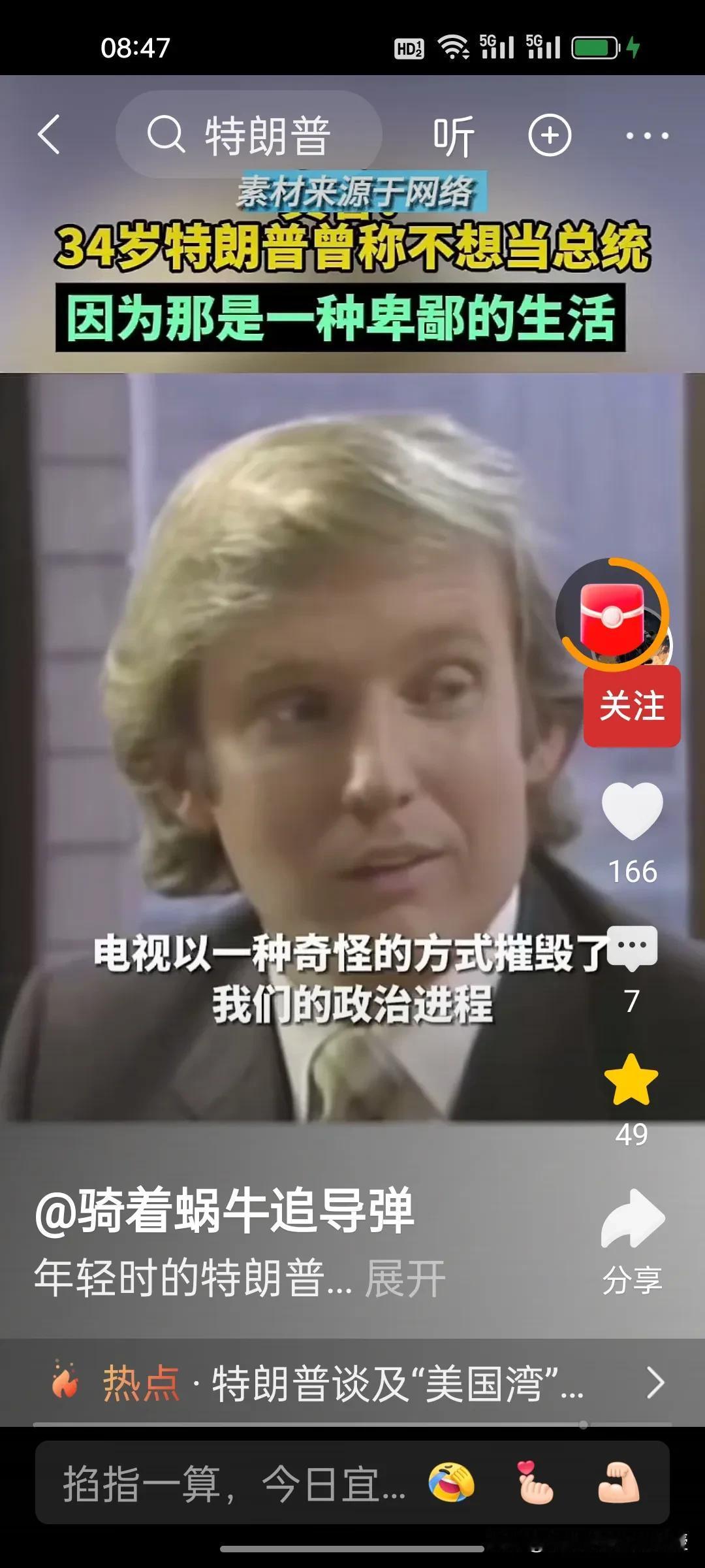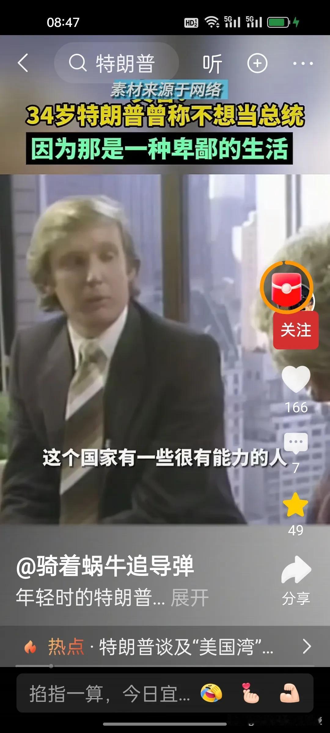 1980年,34岁的特朗普接受媒体访谈时称自己不想当美国总统,因为他觉得政客的生活很卑鄙,有些政客的观点是正确的,但是不受欢迎。他希望能够看到一位称职的美国总统。1980年的时任总统是卡特,同年里根获得胜选。 特朗普做梦也没想到36年后,2017年,70岁的特朗普竟然成功当选第45任美国总统,时隔四年后还又续四年。自己也终于活成了自己年轻时讨厌的样子,喜欢各国给自己送礼,比如看到了瑞士送的刻字金条和金色时钟就马上把关税从39%降到了15%。
