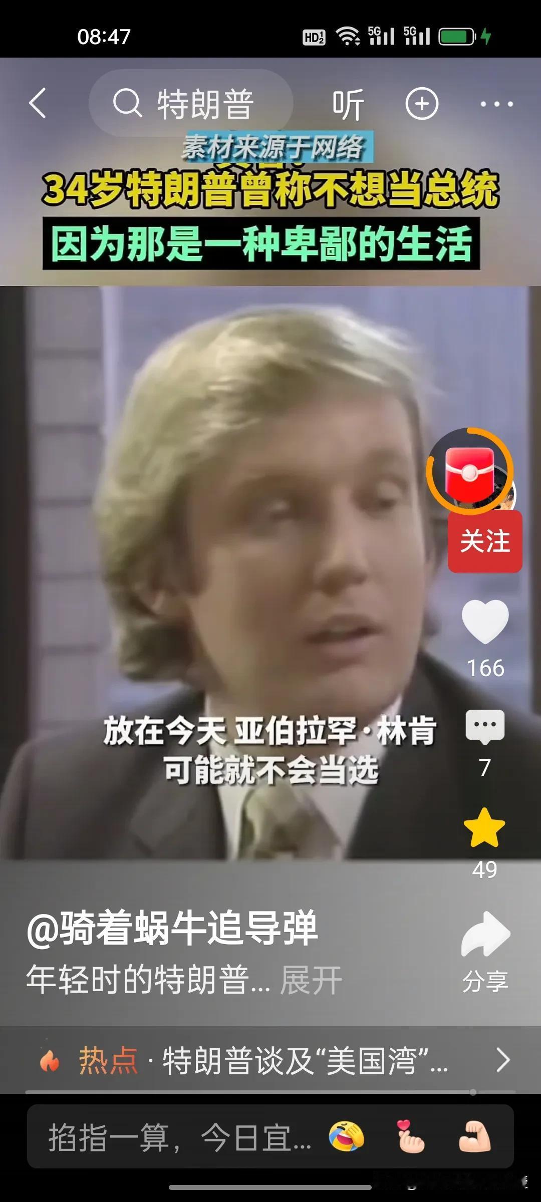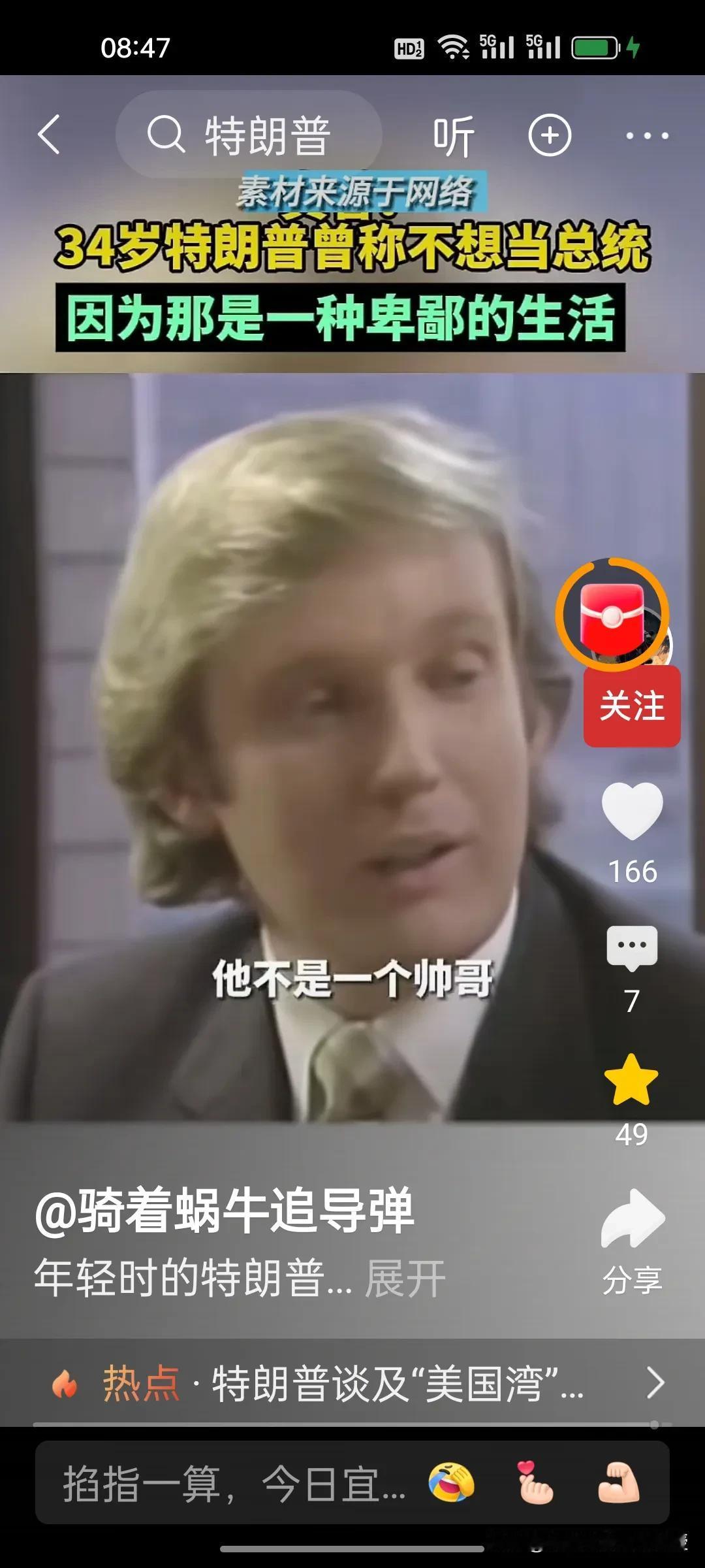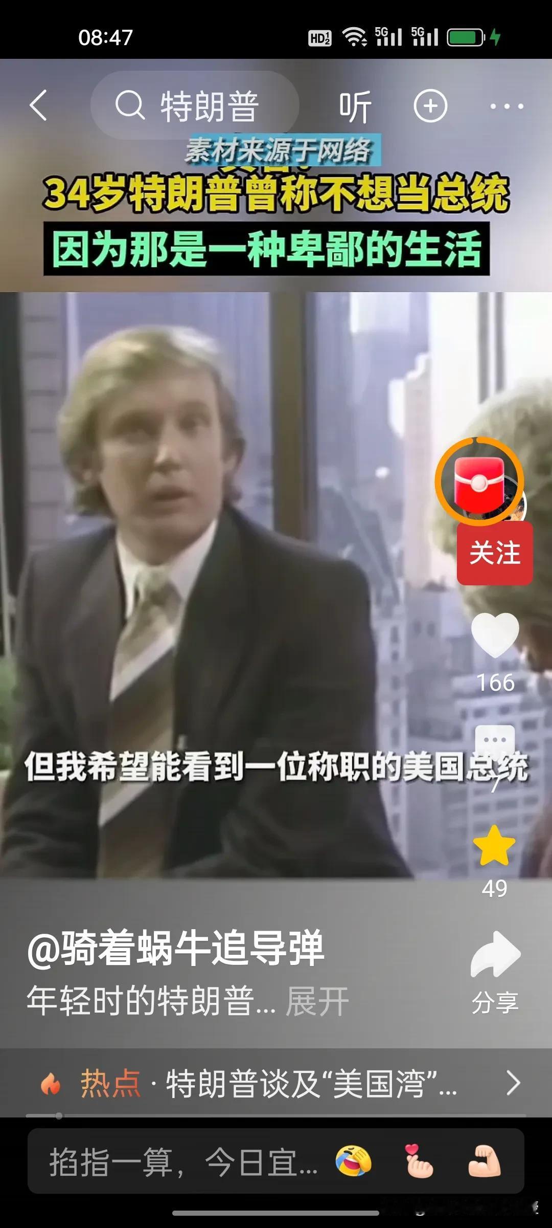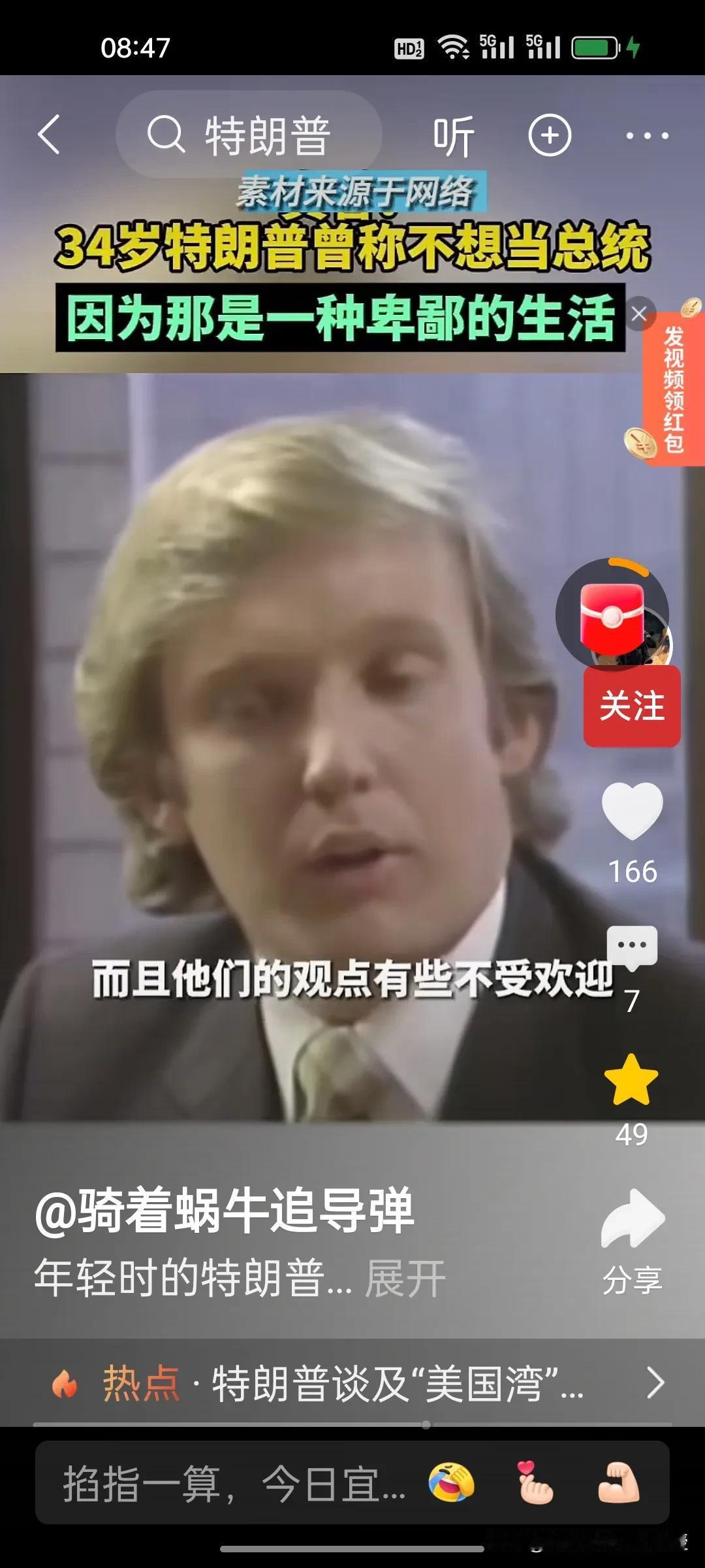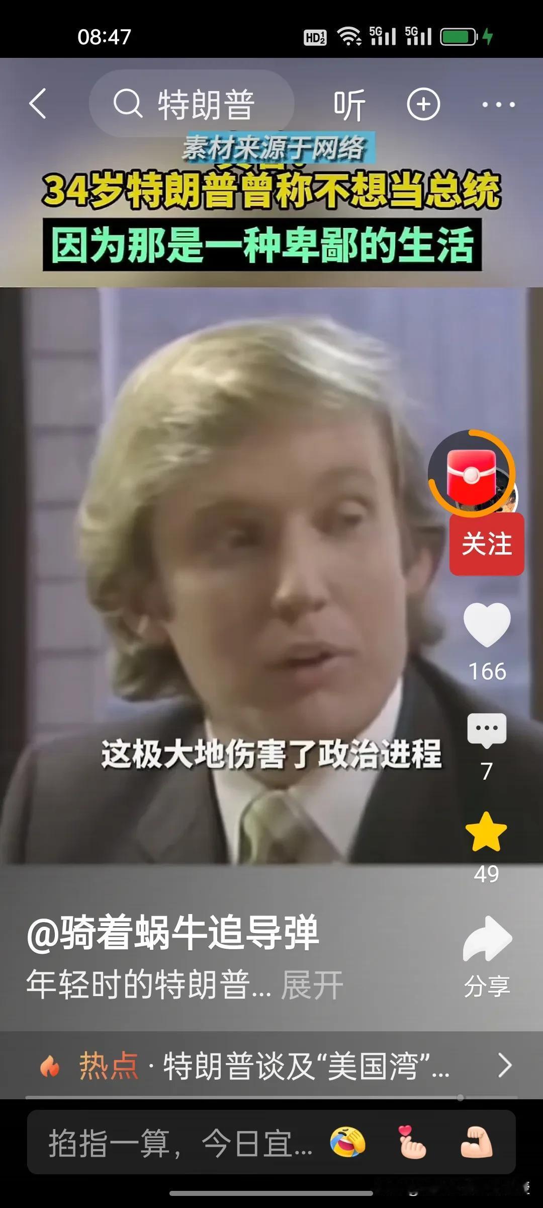 1980年,34岁的特朗普接受媒体访谈时称自己不想当美国总统,因为他觉得政客的生活很卑鄙,有些政客的观点是正确的,但是不受欢迎。他希望能够看到一位称职的美国总统。1980年的时任总统是卡特,同年里根获得胜选。 特朗普做梦也没想到36年后,2017年,70岁的特朗普竟然成功当选第45任美国总统,时隔四年后还又续四年。自己也终于活成了自己年轻时讨厌的样子,喜欢各国给自己送礼,比如看到了瑞士送的刻字金条和金色时钟就马上把关税从39%降到了15%。