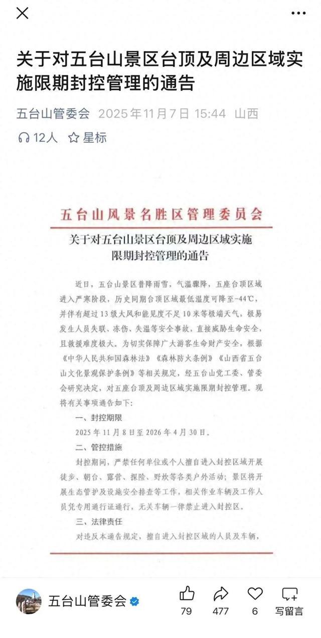 据五台山管委会公众号发布,由于近期五台山景区普遍雨雪,气温骤降,五座台顶区域进入严寒阶段,极易发生人员失联、冻伤、失温等安全事故,直接威胁生命安全,且救援难度极大,因此2025年11月8日至2026年4月30日将对五座台顶及周边区域实施限期封控管理,封控期间严禁任何单位或个人擅自进入封控区域开展徒步、朝台、露营、探险、野炊等各类户外活动,违反者景区综合行政执法队、公安分局等部门将依法予以劝返。