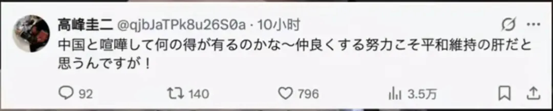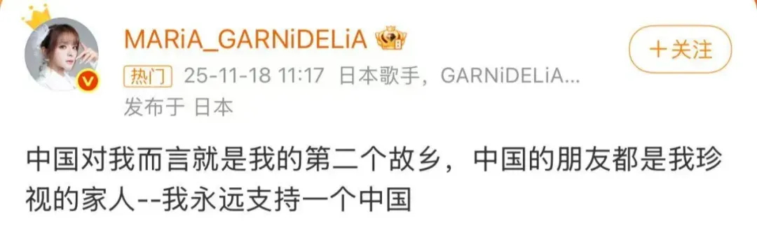 日本首相高市早苗因发表错误言论,受到广大中国民众的强烈谴责,并引发一系列负面连锁反应。近日,日本多位艺人发文表态。11月18日下午,矢野浩二在微博发文:“中国,不只是我的第二故乡,更是让我重新认识‘家’的地方。在这里,我有兄弟,有家人,有浩家人的爱和陪伴与支持,我永远珍惜这一切,也永远支持一个中国,我永远爱你们”。11月18日上午,日本歌手美依礼芽发文:“中国对我而言就是我的第二个故乡,中国的朋友都是我珍视的家人——我永远支持一个中国。”其IP地址显示在日本。11月17日,曾出演日本特摄剧《艾斯奥特曼》人间体“北斗星司”的日本演员高峰圭二在社交平台X上发文质问高市早苗。和中国发生冲突有什么好处呢?我觉得,唯有努力搞好关系,才是维护和平的关键呀!
