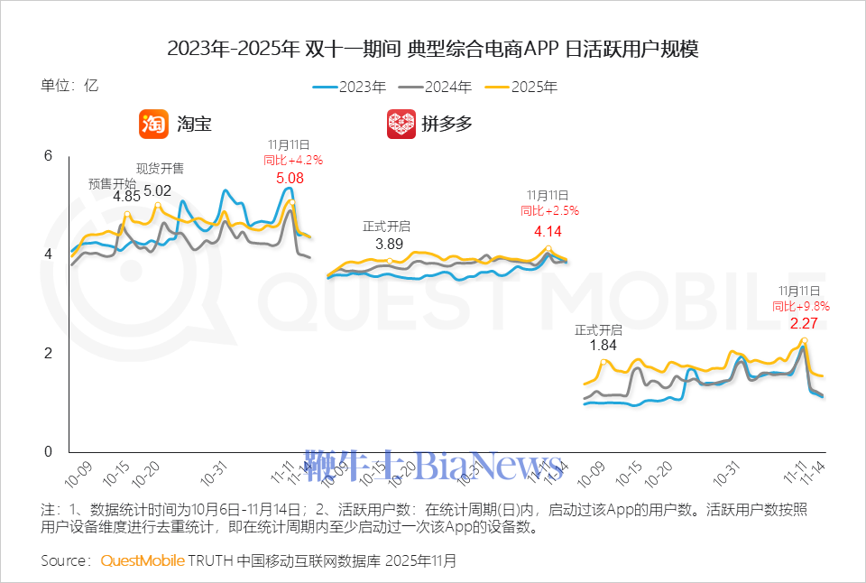 双十一当天移动购物行业用户规模达7.55亿,典型电商平台支付页调起占比较9月、10月日均小幅提升。