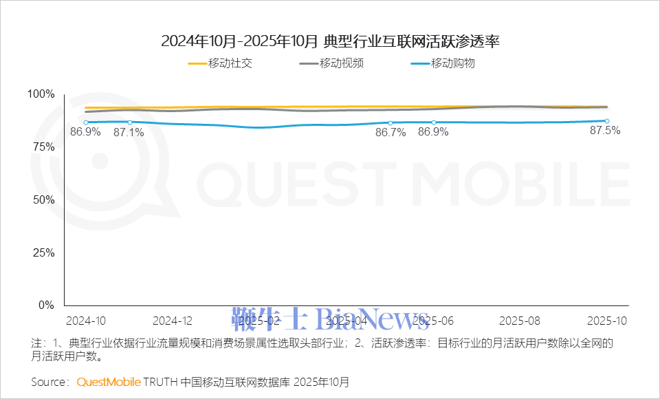 数据显示,2025年10月移动购物行业活跃渗透率达87.5%,同比提升0.6个百分点。