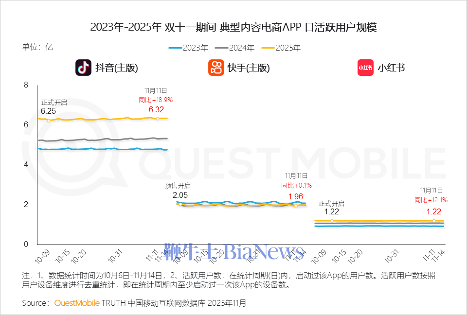内容电商平台:双十一当天,抖音(主版)日活跃用户6.32亿,同比增长18.9%,快手(主版)1.96亿同比增长0.1%,小红书1.22亿,同比增长12.1%。