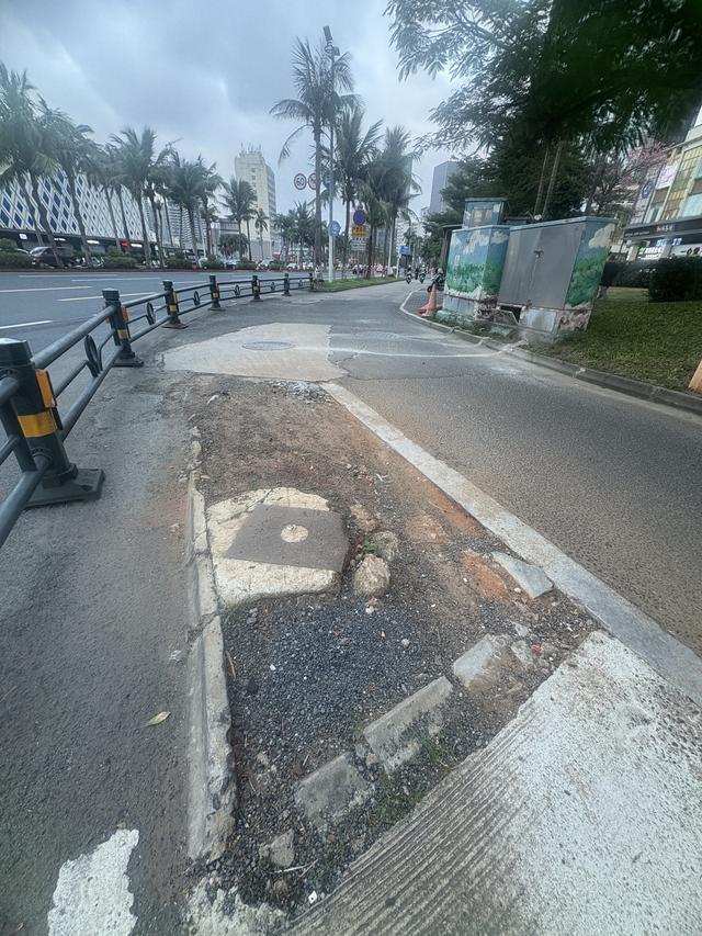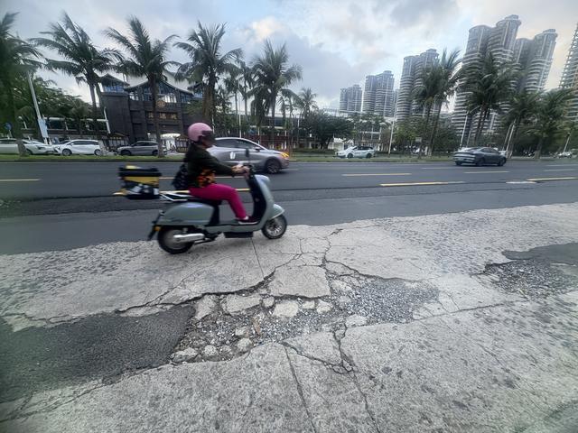 除了椰子树挡道、井盖凸起,滨海大道的非机动车道还存在路面坑洼、下沉、开裂等问题。