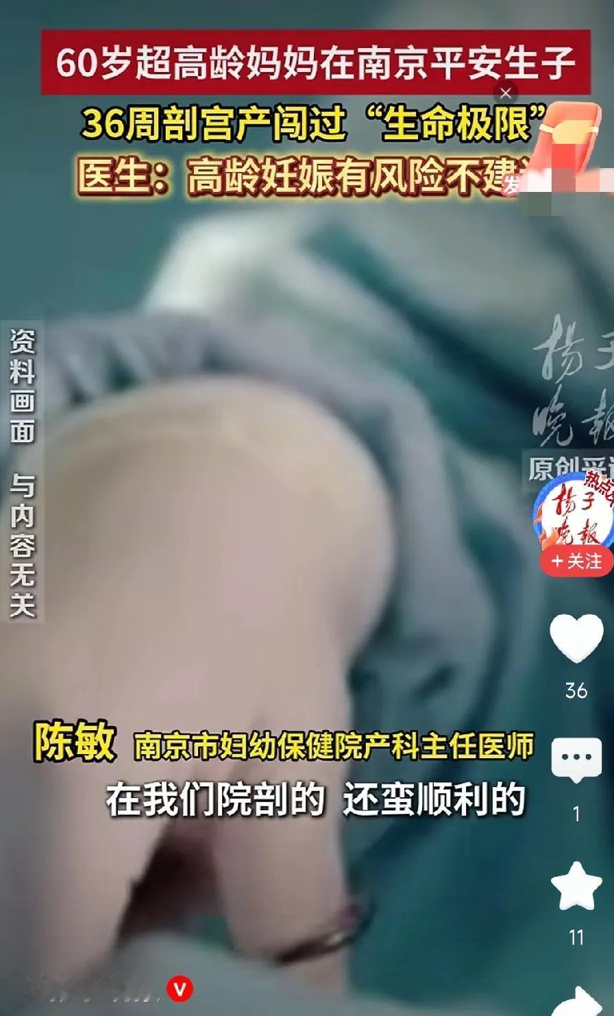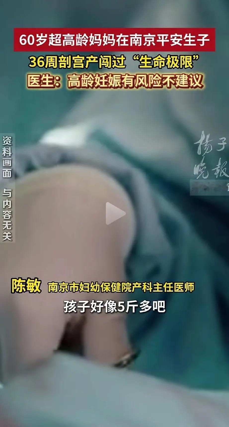 南京市60岁高龄妈妈产子,孕36周剖宫产,孩子出生五斤多。 闯过生命极限,很幸运母子平安。 现在生小孩的都是中老年人积极。 还那么容易怀孕生子。 很多年轻人,结婚好几年了,也不生小孩。 并不是不想生,很多都是难怀孕。 到处求医问药,都没有什么效果。 身边这样的例子太多了。 不知道怎么回事,现在的年轻人那么多难怀孕的。