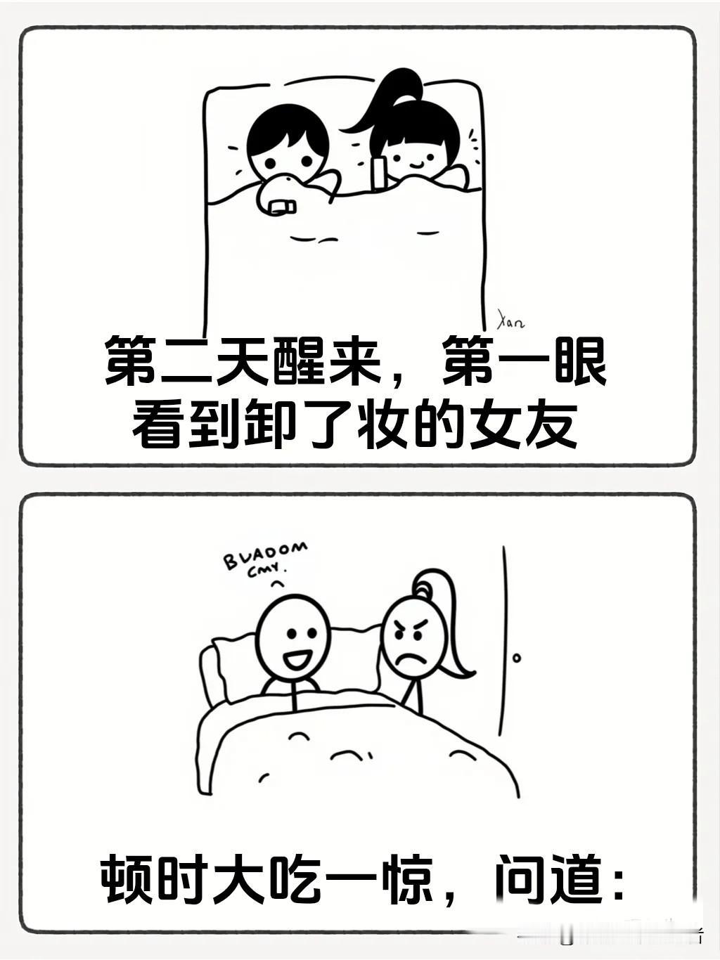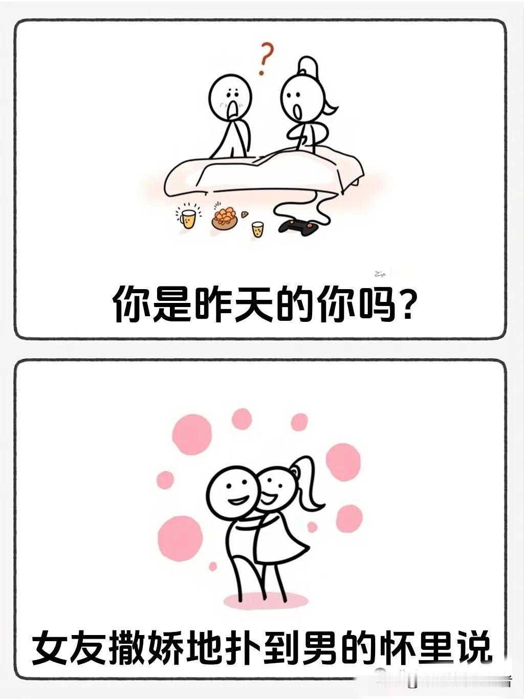 趣味漫画:“单身多年男青年去相亲,一见钟情晚上就同居了,第二天看到卸了妆的女友顿时大吃一惊问道:你是昨天的你吗?女友撒娇地扑到男的怀里…”