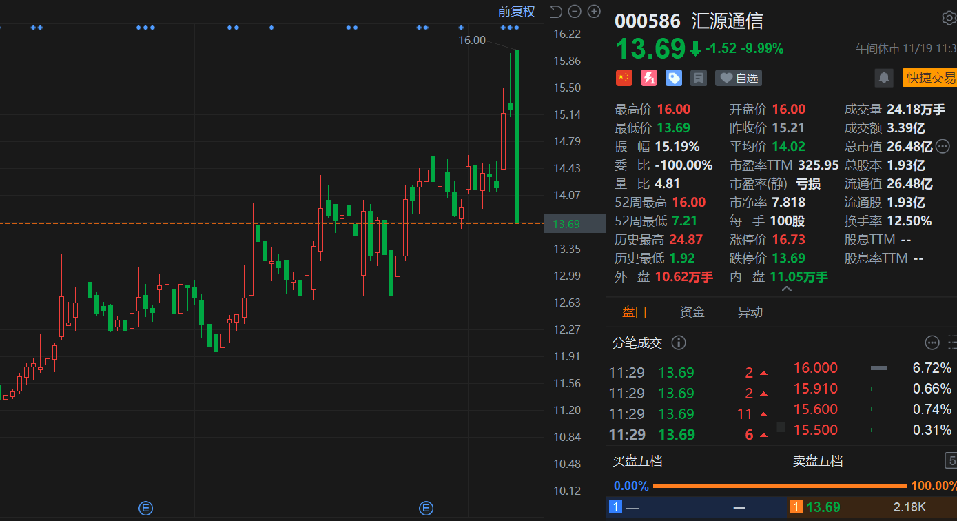 汇源通信(000586.SZ)今日复牌高开,开盘后直线转跌最终跌停,报13.69元,总市值25.5亿元。消息上,汇源通信公告筹划控制权变更事项进展,并发布定增预案,公司无控股股东、无实际控制人,若本次定增事项实施完成,公司控股股东将变更为鼎耘产业,实际控制人将变更为李红星。值得注意的是,为巩固控制权稳定性,鼎耘产业已承诺本次发行中所取得的股份自本次发行完成之日起36个月内不转让、出售或者以其他任何方式处置,且已与鼎耘科技签署《一致行动协议》,确保重大决策一致性。此外,公司发布未来三年股东回报规划,明确现金分红政策。