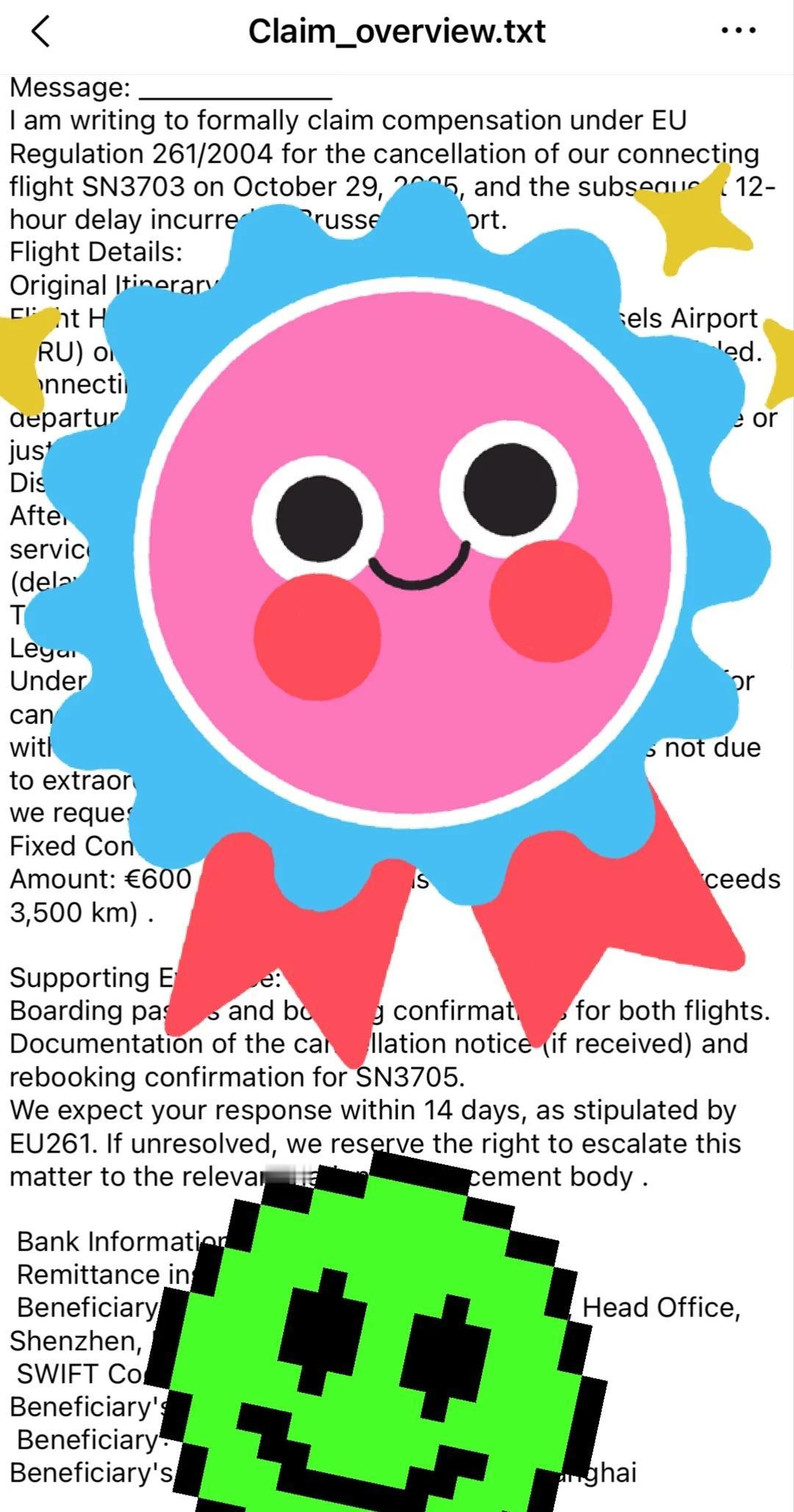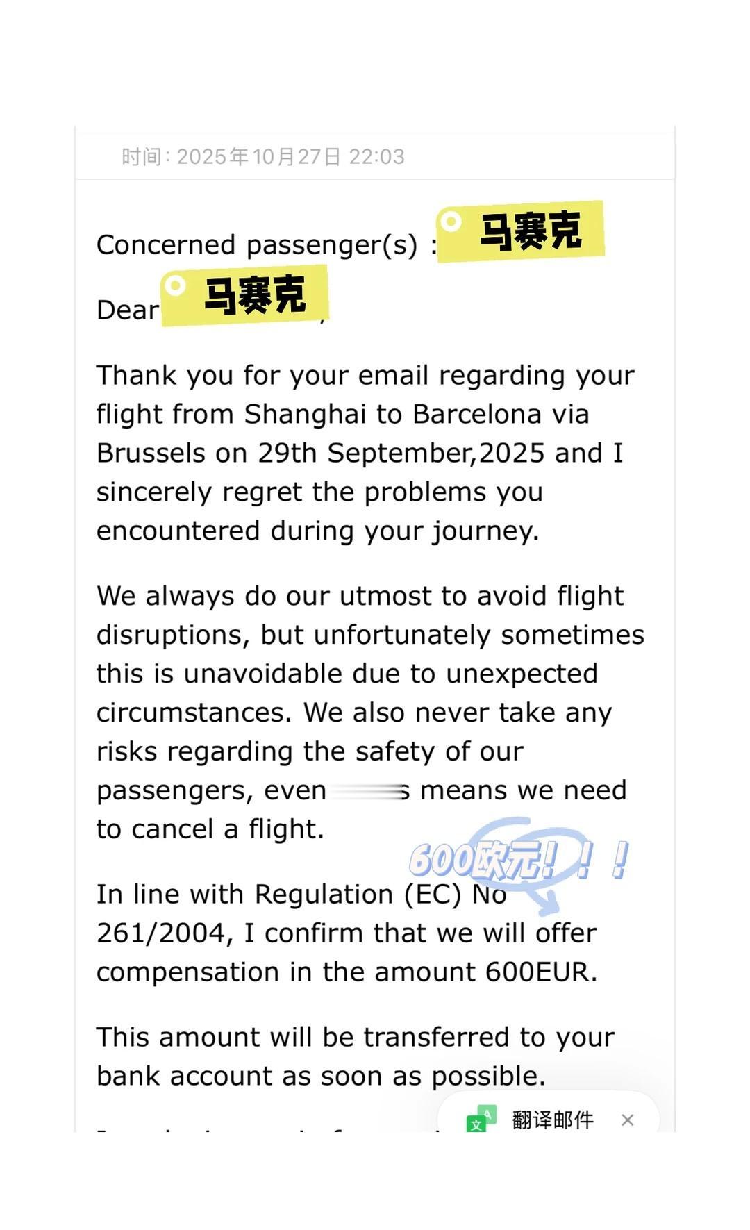 欧洲航班晚点,成功索赔600欧,招行卡到账 家人们,谁懂啊!欧洲旅行的航班晚点,本来是一肚子火,结果居然成了我的意外收入😱 亲身实测,因为航班取消、改签,成功从航司薅到600欧元/人的赔偿!而且,这笔钱直接打到了我的招行储蓄卡里,全程不需要任何欧盟银行卡!💰 所以,在欧洲遇到航班延误/取消,千万别自认倒霉!这份“意外之财”领取攻略请收好,手把手教你维权! ✅ 第一步:判断你是否符合索赔条件(EU261准则) 记住这个“欧盟护身符”——EU261规定!只要同时满足以下4点,你就可以理直气壮地去要钱: 1. 【飞行范围】:从欧盟国家起飞 / 飞往欧盟国家 / 由欧盟航司执飞。 2. 【航班类型】:所有航司,包括廉航(如瑞安、易捷)都适用。 3. 【延误时间】:到达目的地时间比原计划晚点3小时及以上。 4. 【延误原因】:非极端天气、罢工等“不可抗力”,而是航司自身原因(如技术故障、人员调度)。 (可参考图1 ) ✅ 第二步:准备索赔材料(非常简单) · 必备信息:航班号、日期、预订编号(PNR)。 · 登机牌:拍照或实体票留存。 · 护照页照片:用于身份证明。 · 收款账户信息:重点来了!国内银行卡完全没问题! 你需要提供: · 账户名(拼音,与护照一致) · IBAN号:这个需要联系你的银行客服获取 · SWIFT/BIC Code · 银行名称和地址 (在官网提交申请时直接提交,确认后直接打到我银行卡,扣了10欧手续费,没有额外的废话) ✅ 第三步:提交索赔申请(操作流程) 1. 找到航司官网的“索赔/投诉”页面(一般在“联系我们”或“管理我的预订”里)。 2. 选择“航班延误赔偿”,在线填写表格。 3. 上传准备好的材料,在备注里清晰说明索赔依据(EU261法规)。 4. 提交后,你会收到一封确认邮件,记得保存(如图3) ✅ 第四步:耐心等待与跟进 · 处理时间一般在4-8周。 · 如果航司装傻或拒绝,不要怕!在回复邮件里态度强硬地重申EU261法规,并给出最后期限(如14天内回复),否则将诉诸仲裁。这招通常很管用! 大家有任何问题,都可以在评论区问我哦! 欧洲旅行 航班延误 EU261 维权 旅行攻略 薅羊毛 机票赔偿 欧洲自由行