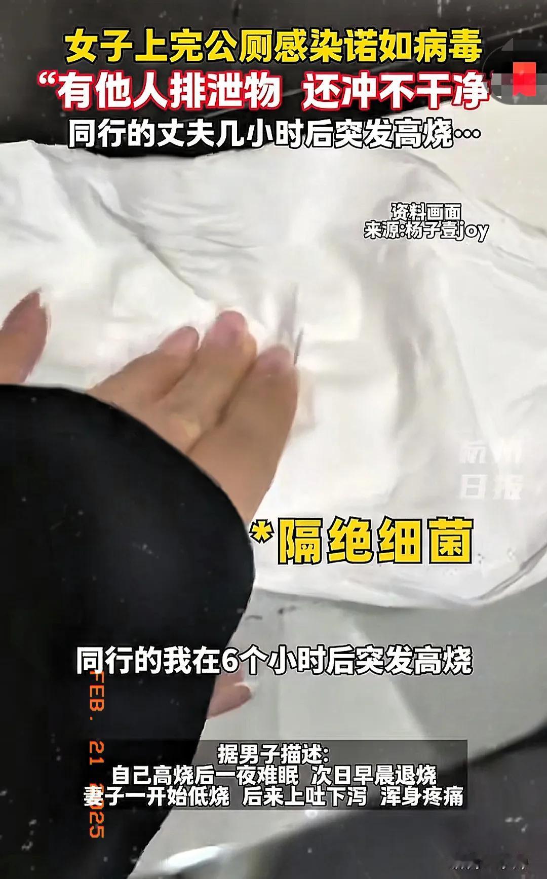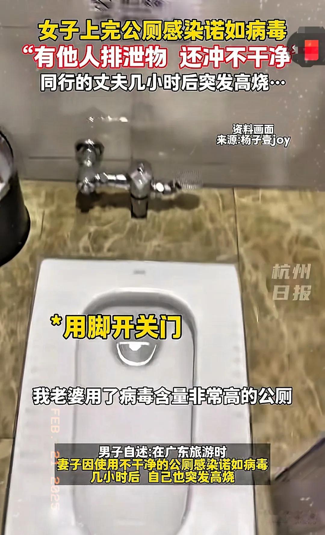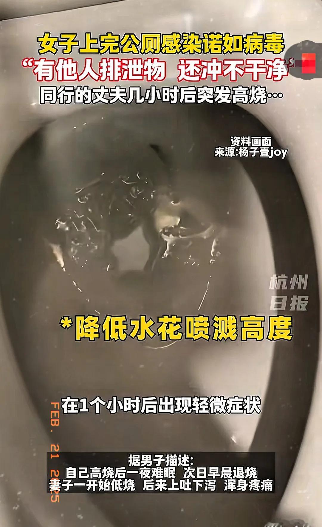 “太可怕了!”2月25日报道一男子和妻子去广州旅游,妻子上公厕时找了一个有屎还冲不掉的坑位用,不料上完厕所后,免疫系统很弱的妻子竟感染上了诺如病毒,一小时后开始出现轻微病毒症状,男子和妻子接触后,也在6个小时后发起了高烧![黑线] 因使用公共厕所后相继出现呕吐,高烧症状,经医生诊断感染了诺如病毒,初步推测不洁厕位可能是感染源头,这也让不少人开始关注公厕使用中的卫生隐患。 感染病毒的概率不高,也可能是通过门把手,冲水按钮等接触传播,也有不少人表示认同,并提出自己使用公厕时已有一定的防护习惯。 诺如病毒确实具有极强的传染性,可通过接触,食物,水源甚至气溶胶传播,当马桶冲水时,水流旋转可能将带病毒的微粒溅起,在空气中形成气溶胶,此时若没有盖盖冲水,人又站得近,确实存在吸入风险。 因此在公厕这类人员密集场所,做好自我防护非常必要,建议进入隔间后先检查冲水是否正常,可先冲一次水,降低污物残留,尽量选用蹲坑,若只有坐便器,建议先用消毒湿巾擦拭座圈。 如果没有盖子,建议侧身或后退一步,尽量远离溅起的水雾,开关门或按冲水钮时,可使用纸巾隔开,或用手肘代替手指接触。 如厕前可在坑内丢一张卫生纸,能有效缓冲水流,减少液滴飞溅,结束之后最重要的一步,是使用流动水和肥皂或洗手液认真洗手,这是阻断病毒传播最有效的方式。 儿童,老人及免疫力较低的人群,在病毒高发季节更需注意防护,出门时可随身携带小瓶免洗洗手液或独立包装的消毒湿巾,方便随时清洁双手。 公厕人来人往,病毒含量很高,需要多注意点。 “我上次在高速服务区就遇到过这种冲不干净的厕所,现在想想都后悔,以后宁可多走几步找干净的。” “时代不同了,病毒也在变异,诺如病毒是出了名的‘钉子户’,传染性极强,不能拿老黄历说事。” “我进公厕门从来不用手推,都是用胳膊肘或者用纸巾垫着,”“冲水按钮绝对是重灾区,必须用纸巾隔开按,完事马上扔掉。” “不能光让个人注意,厕所的清洁维护跟不上才是根源,”大家普遍认为,商场,车站,景区等人流密集场所的管理部门必须负起责任,增加清洁频次,确保设施完好。” “冲水时产生的气溶胶确实能带着病毒颗粒在空气中悬浮一段时间,尤其是在密闭不通风的厕所隔间里,风险不小,所以冲水时盖上马桶盖非常关键。” 那么,你对此事有什么看法呢? 信源:新华网