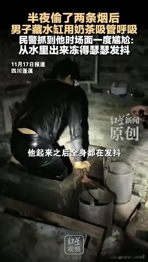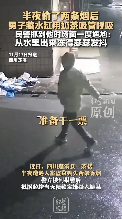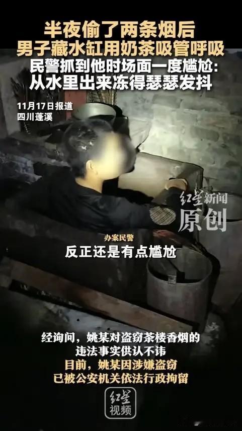 “聪明过头了!”近日,四川蓬溪,一男子摸黑爬进茶楼,偷走了放在前台的2条香烟,民警很快就找上门来,男子为了躲避追捕,竟然藏身在储水缸中,嘴里衔着吸管用来呼吸!可惜还是没能躲过民警的“法眼”。网友:电影看多了吧? 四川蓬溪县一家茶楼老板清早开门就发现不对劲,收银台两条香烟不见了,窗户上还留着明显的攀爬痕迹。老板马上报了警。赤城派出所的民警迅速行动,调看监控录像,很快锁定了20多岁的姚某。 姚某可不是第一次犯事了,之前就有过案底。锁定目标后,民警当天下午就赶到了姚某家。这是一栋两层的农村自建房。开门的姚某哥哥说他不在家,但民警进屋就发现了不对劲。 客厅地上有个烟头还没完全熄灭,姚某房间床上的外套口袋里,赫然装着两包烟,牌子正好和茶楼丢的一模一样。桌上的一罐饮料,瓶壁上还挂着冰凉的水珠。这些细节让民警断定:人肯定没走远,就藏在屋里。 民警把这房子上上下下又仔细搜了一遍,还是没见人影。就在大家纳闷的时候,厨房角落传来一阵轻微的“汩汩”水声。声音是从一个水泥砌的储水缸里传出来的。 民警轻轻掀开缸盖,眼前的景象让人哭笑不得:姚某整个人蜷在冰冷的缸水里,嘴里紧紧叼着一根吸管,另一头露在水面上用来透气。“出来吧,别憋着了!”民警话音落下,姚某狼狈不堪地从水缸里爬了出来,浑身湿透,冷得直发抖,只好束手就擒。 事后姚某交代,他听到民警敲门,一时心急就想出了这个“妙招”,以为能靠电影里学来的方法蒙混过关,没想到民警观察如此细致。目前,姚某因盗窃已被公安机关依法行政拘留。 违法犯罪分子不要心存侥幸,逃避解决不了问题,投案自首才是唯一正确的选择。同时也叮嘱广大商户,晚上打烊后一定要关好门窗,加强防盗,店里尽量不要存放大量现金或贵重物品。 各位读者你们怎么看?欢迎在评论区讨论。