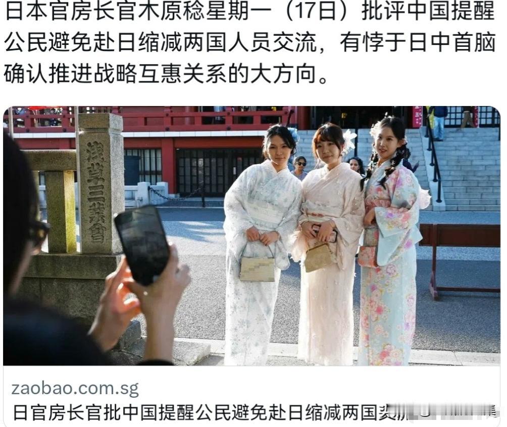 日本再次对我们进行回应!日本刚派人访华,就对我们提了一个条件!11月17日,根据外媒报道,在中国官方提醒中国公民近期避免前往日本后,日本官房长官木原稔对此进行回应了。木原稔表示,中国此举缩减两国人员交流,有悖于日中首脑确认推进战略互惠关系的大方向,并表示已向北京提出交涉。 前脚日本外务省的人刚急匆匆访华,说是要就高层的涉台错误言论做 “澄清”,坚称没改变一贯立场,后脚木原稔就出来说话,一边批评中国发提醒的举动,一边明着提条件,意思很清楚,就是让中方撤了这个提醒,别让中国游客的数量掉下去。 这操作看得人有点懵,合着这边刚想给敏感问题 “降温”,那边转头就给自家争取起 “经济利益” 了,两头的便宜都想占。 中国官方会发这个提醒,根本不是凭空来的。今年以来针对中国公民的违法犯罪案件都冒出来 27 起了,平均一周就有一起,从言语侮辱到动手伤人,甚至还有持械袭击的,案发地点也从偏街小巷蔓延到了银座、心斋桥这些繁华地方,受害者里游客、留学生、商务人士都有。 更要命的是,不少案子破不了,嫌疑人还在外面晃悠,日本那边的治安漏洞摆得明明白白。 再加上高层那句 “台湾有事可能构成存亡危机事态” 的言论一出来,东京街头都出现了反华标语,社交媒体上全是针对华人的威胁话,这种氛围下,中国公民的安全风险可不是说说而已,发个提醒纯粹是出于保护自家民众的考虑。 日本急着提条件,说白了还是经济上扛不住。中国游客早就是日本旅游业的 “压舱石”,2025 年前 9 个月就去了 749 万人次,消费直接超 1.7 万亿日元,在所有外国游客里,不管是人数还是花钱的本事,都是头一份。 现在提醒一出来,日本旅游相关的股票直接崩了盘,资生堂跌了 11%,伊势丹三越控股更狠,跌了 12%,连日本航空都跟着跌了 5.8%。 大阪心斋桥的免税店老板都快急哭了,提前三个月备的货全堆在仓库里,以前忙到喝不上水的中文导购,现在只能坐着发呆,不少临时工都被通知不用来了。 有机构算了笔账,要是中国游客真持续减少,日本得亏 2.2 万亿日元,GDP 都要被拉低 0.36%,要知道日本全年的预期增长率也就 0.6%,这一下就快给拽掉一半。 旅游业带动的产业链更别提了,从航空公司、酒店到路边的居酒屋、药妆店,多少人指着中国游客吃饭,每 100 万中国游客就能撑起 2.3 万个就业岗位,现在游客不来了,裁员、关店的连锁反应眼看着就要冒头。 日本经团联都急了,丰田、索尼这些大企业联名给内阁施压,要求别再挑衅,赶紧修复关系,毕竟没人愿意跟着一起受损失。 更有意思的是,日本内部对那句引发风波的言论也吵翻了天。前首相们出来批评,说这是把日本往战争里拖,还有超百名民众跑到首相官邸前抗议,举着标语喊着要高层辞职。立宪民主党的人也直言,这种言论太越界,把中日关系拖进了死胡同。 说白了,连日本自己人都知道这话犯了忌讳,可这边刚派人来 “灭火”,那边就反过来要求中国 “配合” 维持游客数量,这种矛盾的态度实在让人看不懂。 中方这次的态度很明确,想让人员交流恢复,首先得解决根本问题。安全风险摆着,敏感问题上的挑衅言论没纠正,光靠嘴催着游客去,根本不现实。 日本要是真在乎所谓的 “战略互惠关系”,与其忙着提条件、提交涉,不如先好好管管自家的治安,好好纠正那些触碰底线的言论。 毕竟中国游客出门玩,图的是安全舒心,不是冒着风险去给别人送经济收益,这个道理其实一点都不复杂。 现在日本的处境说白了就是自找的,既想在敏感问题上刷存在感,又不想放弃中国游客带来的经济好处,哪有这么两全其美的事。 股市暴跌、商家叫苦、企业施压,这些都是实实在在的后果。要是还抱着 “一边挑衅一边赚钱” 的心思不放,最后受损失的只会是他们自己。