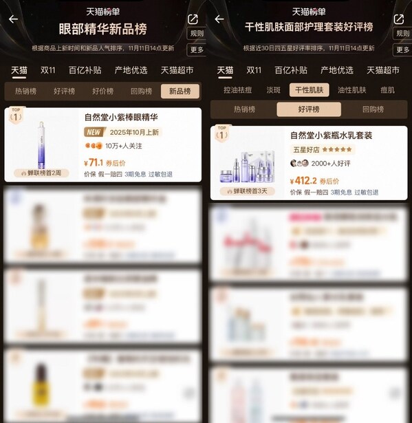 数据显示,今年双11期间,自然堂小紫瓶精华位居拼多多紧致面部精华畅销榜第一,自然堂小紫棒眼部精华登上天猫眼部精华新品榜TOP1;自然堂雪松油敷膜成为天猫双11提亮抗皱面膜热卖榜TOP1,自然堂冻干面膜成为天猫双11淡纹舒缓面膜热卖榜TOP1;自然堂强韧防脱洗发水位列天猫百亿补贴防脱护发套装热销榜TOP1;自然堂男士龙血套装高居拼多多品牌男士护理套装好评榜第一。