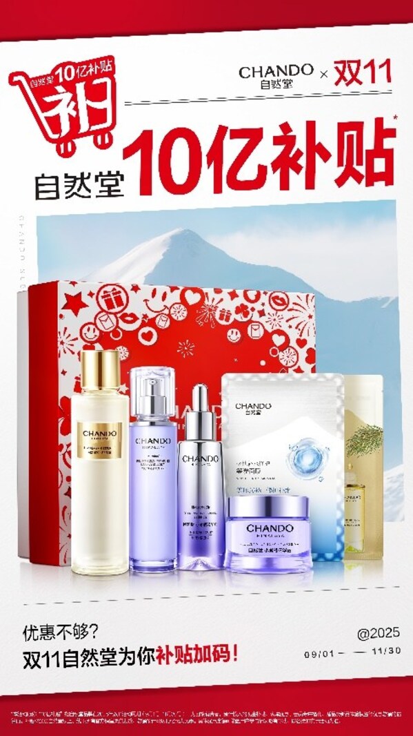在线上,自然堂在双11前期携手《所有女生的OFFER2025》、《巴黎合伙人》等综艺,增加品牌曝光、积蓄品牌声量;在双11期间联动超头达人直播间,集中引爆关注;并持续深耕品牌自播阵地,有效承接流量、沉淀用户,实现高效转化;在线下,自然堂在生活馆、潮品美妆店、及超市等直营体系以及即时零售和商超等渠道同步发放补贴,精准触达目标人群,消费转化表现亮眼。