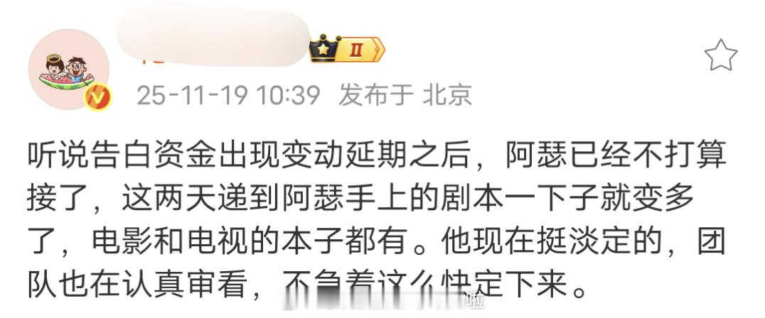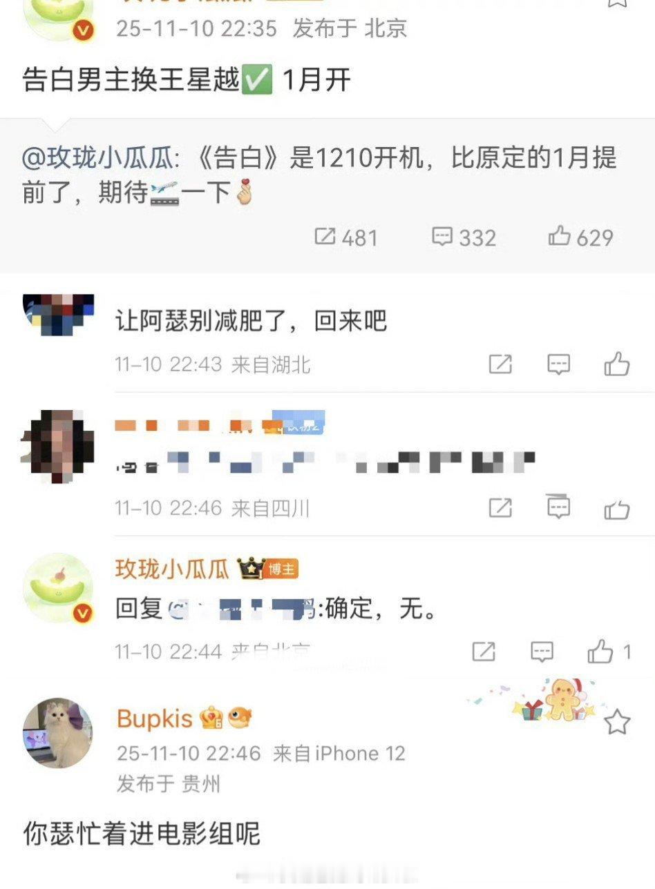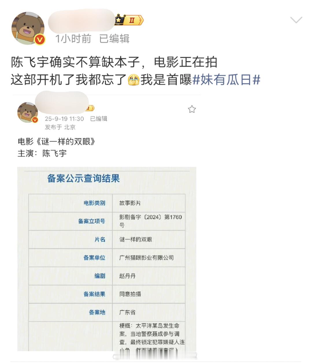 前几天陈飞宇对接还说《告白》剧方以陈飞宇为唯一首选正常推进,今天官方后援会就宣布停止告白的开机应援。反正要么是同时期陈飞宇有更好的影视饼,没签合同前一切都有可能。要么是剧组资金出问题,开机时间延期,导致男主人选一再降级。