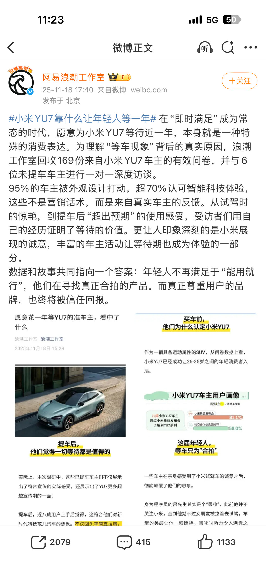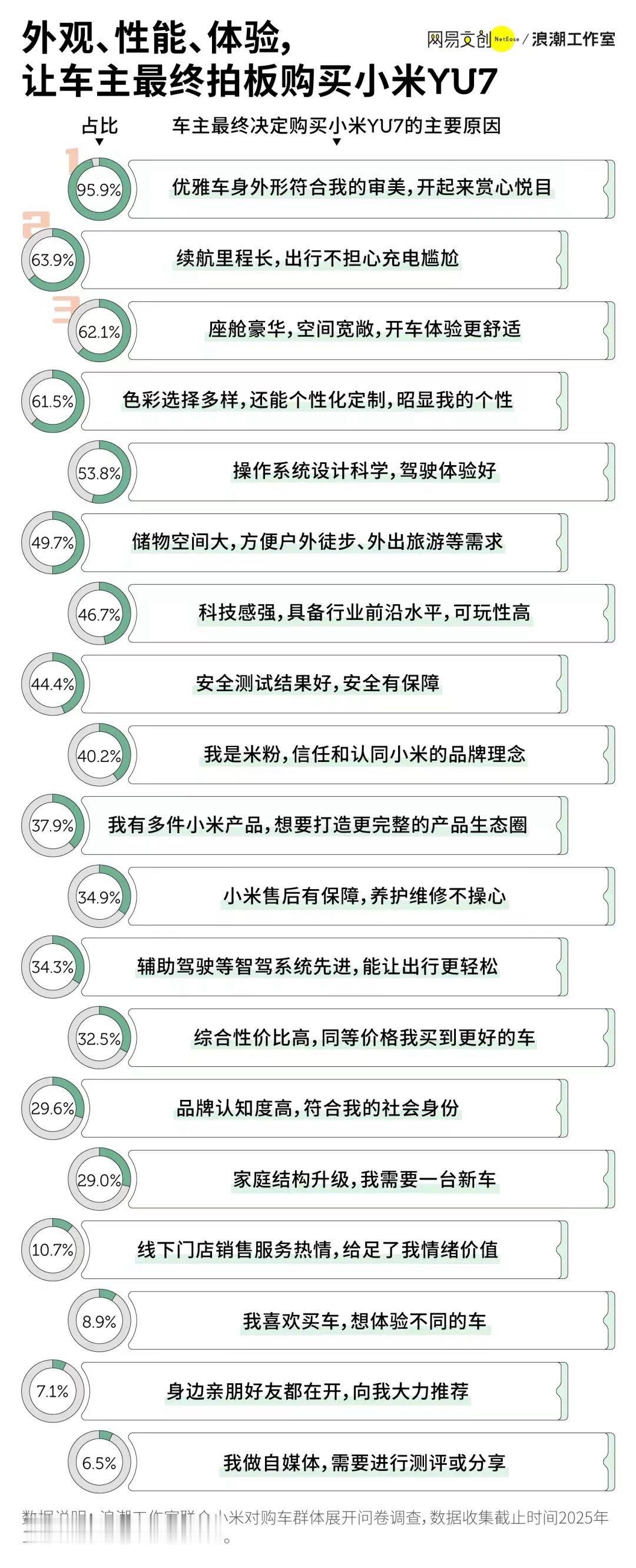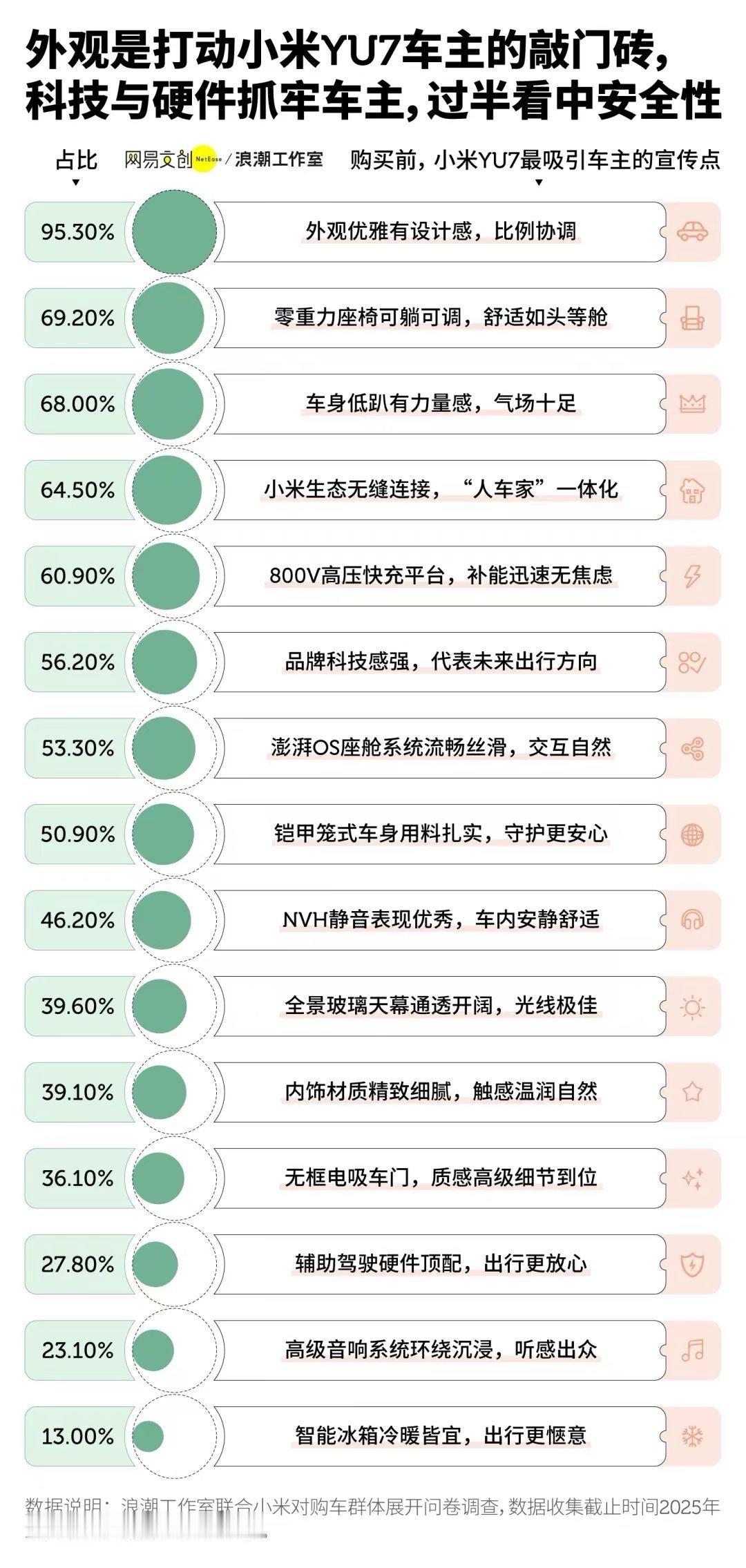 等一台车等一年,可能这样跟你说感觉听起来有点夸张,但小米YU7还真就这么让人心甘情愿。最近一份车主调查给出了答案,其实年轻人等的不是一辆车,而是一个“不将就”的选择。为什么非它不可,首先,超过95%的人第一眼就被外观吸引,当然其中就包括SU7和YU7双车主的我。在这个SUV长得都差不多的时代,YU7的设计就是能让人眼前一亮。当然,好看只是一方面,而且也就是因为它外观太突出了,让人忽略了它的产品力。像是流畅的系统、靠谱的安全性,还有贴心的防晕车设计,说实话这辆车的每一处细节都踩在了用户需求点上。所以,等待不是因为产能不足,而是好东西值得被排队。