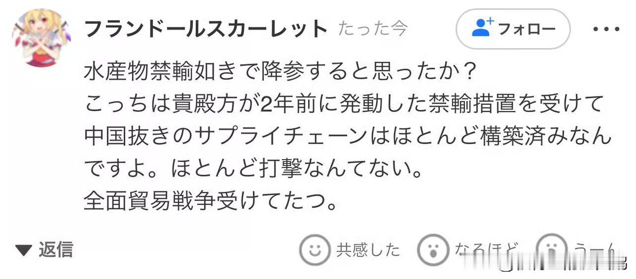 重磅新闻!中国再次停止进口日本水产品。 ​​​ 值得注意的是,芙兰朵露·斯卡蕾特:日本人已经建立了一条不依赖中国的供应链,已经做好了全面贸易战的战斗准备。 希望小日子说到做到,千万别怂。其经济一定会比现在的欧盟还要惨。